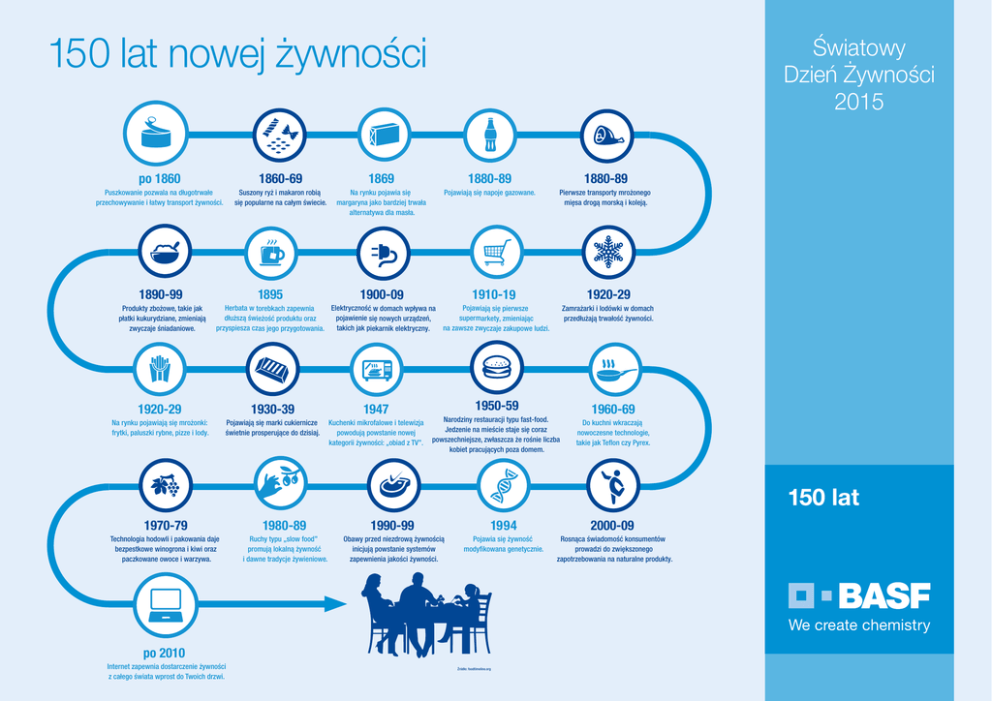 150 lat nowej żywności 1920s 1910s Home freezing and refrigeration extends the life of food. 1920s 1860-69 Światowy Dzień Żywności 2015 The first supermarkets open, altering the way people shop forever. 1930s 1869 1947 Introduction of frozen French fries, Confectionery brands that Microwave ovens and fish fingers, frozen pizzas and new still thrive are introduced. the TV mean a whole new to the - the TV Puszkowanie pozwala na długotrwałe ice creams Suszony ryżworld. i makaron robią Na rynku pojawia sięfood category Pojawiają siędinner. napoje gazowane. przechowywanie i łatwy transport żywności. się popularne na całym świecie. margaryna jako bardziej trwała alternatywa dla masła. po 1860 1960s 1895 1890-99 Produkty zbożowe, takie jak płatki kukurydziane, zmieniają zwyczaje śniadaniowe. 1950s 1900-09 1880-89 1880-89 Pierwsze transporty mrożonego mięsa drogą morską i koleją. 1910-19 1920-29 Space-age technology such The birth of fast food restaurants. Eating out astorebkach Teflon and Pyrex come Elektryczność becomes everyday partnaof life as the Herbata w Pojawiają się pierwsze wan domach zapewnia wpływa to the kitchen. number of working women pojawienie się nowych urządzeń, increases. dłuższą świeżość produktu oraz supermarkety, zmieniając przyspiesza czas jego przygotowania. 1920-29 1930-39 1970s takich jak piekarnik elektryczny. na zawsze zwyczaje zakupowe ludzi. 1947 1980s 1990s1950-59 Zamrażarki i lodówki w domach przedłużają trwałość żywności. Narodziny typu fast-food. BreedingPojawiają and packaging and mikrofalowe local food i telewizja Food scares lead torestauracji quality food Na rynku pojawiają się mrożonki: się markitechnology cukiernicze Slow Kuchenki Jedzenie na mieście staje to seedless grapes, movements seekspowstanie to recapture assurance schemes. E.g. Red Tractor,się coraz frytki, paluszki rybne, pizze i lody. leads świetnie prosperujące do dzisiaj. powodują nowej powszechniejsze, zwłaszcza że rośnie liczba Kiwi fruit and bagged lostkategorii tastes and traditions. and GlobalGAP. żywności: „obiad z TV”. HACCP fruit and vegetables. kobiet pracujących poza domem. 1970-79 Technologia hodowli i pakowania daje bezpestkowe winogrona i kiwi oraz paczkowane owoce i warzywa. po 2010 1980-89 2000s 1990-99 1994 1994 RuchyHealth typu „slow food” Obawy niezdrową żywnością Pojawia się żywność consciousness gives riseprzed First genetically modified promują lokalną żywność inicjują powstanie systemów modyfikowana genetycznie. to interest in natural foods and enhanced foods introduced. i dawneproducts tradycje żywieniowe. jakości żywności. such as Omega 3 zapewnienia eggs. 2010s Internet zapewnia dostarczenie żywności Internet shopping brings the z całego świata wprost do Twoich drzwi. world’s food to your door. Źródło: foodtimeline.org Source: foodtimeline.org 1960-69 Do kuchni wkraczają nowoczesne technologie, takie jak Teflon czy Pyrex. 2000-09 Rosnąca świadomość konsumentów prowadzi do zwiększonego zapotrzebowania na naturalne produkty.