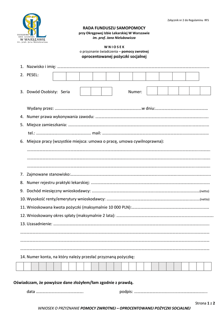 Załącznik nr 2 do Regulaminu RFS RADA FUNDUSZU SAMOPOMOCY przy Okręgowej Izbie Lekarskiej W Warszawie im. prof. Jana Nielubowicza WNIOSEK o przyznanie świadczenia – pomocy zwrotnej oprocentowanej pożyczki socjalnej 1. Nazwisko i imię: ………………………………………………………………………….………………………………………………..…… 2. PESEL: 3. Dowód Osobisty: Seria Numer: Wydany przez: …………………………………………………………………………w dniu:…………………………………………… 4. Numer prawa wykonywania zawodu: ………………………………………………………….….…………..………………..…. 5. Miejsce zamieszkania: ………………………………………………………………………………………………..……….………….… tel.: …………………............………………. mail: ………………………………………………………………………………….……… 6. Miejsce pracy (wszystkie miejsca: umowa o pracę, umowa cywilnoprawna): …………………………………………………………………………………………………………………………………………………..………. ……………………………………………………………………………………………………………………………………………………..……. ………………………………………………………………………………………………………………………………………………..…………. 7. Zajmowane stanowisko:…………………………………………………………………………………………..……………..………….. 8. Numer rejestru praktyki lekarskiej: ……………………………………………………………………………………………….…… 9. Dochód miesięczny wnioskodawcy: …………………………………………………….…………………….………………(netto) 10. Wysokość renty/emerytury wnioskodawcy: ……………………………………….……………………………..………(netto) 11. Wnioskowana kwota pożyczki (maksymalnie 10 000 PLN):………………………………………………………………… 12. Wnioskowany okres spłaty (maksymalnie 2 lata): …………………………………………………………………………………. 13. Uzasadnienie: ……………………………………………………………………………………………………………………………………. ………………………………………………………………………………………………………………………………………………………………… ………………………………………………………………………………………………………………………………………………………………… ………………………………………………………………………………………………………………………………………………………………… 14. Numer konta, na który należy przesłać przyznaną pożyczkę: Oświadczam, że powyższe dane złożyłem/łam zgodnie z prawdą. data ………………………………………. podpis: …………………………………………………………….. Strona 1 z 2 WNIOSEK O PRZYZNANIE POMOCY ZWROTNEJ – OPROCENTOWANEJ POŻYCZKI SOCJALNEJ UWAGA: Podczas podpisywania umowy o pożyczkę wymagane będą podpisy dwóch poręczycieli: w przypadku lekarzy: dwóch lekarzy – Członków Izby w przypadku pracowników Izby: pracowników lub lekarzy – Członków Izby Załączniki do wniosku: 1. Zaświadczenie o niezaleganiu ze składkami na rzecz Okręgowej Izby Lekarskiej w Warszawie. 2. PIT Wnioskodawcy za rok poprzedzający wniosek. 3. W przypadku pracowników Izby: opinia Dyrektora Biura Izby: Opinia Dyrektora Biura Izby : pozytywna ………………….. negatywna ……………….…. Uzasadnienie: ………………………………………………………………………………………………………………………………….…………………. ………………………………….………………………………………………….……………………………………………………………………………………… ………………………….…………………..……………………………………………………………..……………………………………………………………… data ………………………………… podpis: ………………………………….………..……………………………………. *Decyzja: pozytywna ………………….. uzupełnić wniosek o ………………………………………………………………………………………..…………………………….… negatywna …………………. Uzasadnienie: ………………………………….……………………………………………………………………………………………………………….… ….………………………………………………………………………………………………………………….…………………..……………………………….. ….………………………………………………………………………………………………………………….…………………..……………………………….. ….………………………………………………………………………………………………………………….…………………..……………………………….. ….………………………………………………