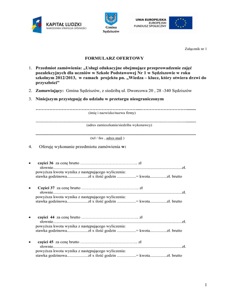 Gmina Sędziszów Załącznik nr 1 FORMULARZ OFERTOWY 1. Przedmiot zamówienia: „Usługi edukacyjne obejmujące przeprowadzenie zajęć pozalekcyjnych dla uczniów w Szkole Podstawowej Nr 1 w Sędziszowie w roku szkolnym 2012/2013, w ramach projektu pn. „Wiedza – klucz, który otwiera drzwi do przyszłości” 2. Zamawiający: Gmina Sędziszów, z siedzibą ul. Dworcowa 20 , 28 -340 Sędziszów 3. Niniejszym przystępuję do udziału w przetargu nieograniczonym …………………………………………………………...…………………………........ (imię i nazwisko/nazwa firmy) ………………………………………………………………………………………………………........... (adres zamieszkania/siedziba wykonawcy) ........................................................................................................................................... (tel / fax , adres mail ) 4. Oferuję wykonanie przedmiotu zamówienia w: • części 36 za cenę brutto ………………………………….. zł słownie..........................................................................................................................zł. powyższa kwota wynika z następującego wyliczenia: stawka godzinowa....................zł x ilość godzin ..................= kwota................zł. brutto • Części 37 za cenę brutto ………………………………….. zł słownie..........................................................................................................................zł. powyższa kwota wynika z następującego wyliczenia: stawka godzinowa....................zł x ilość godzin ..................= kwota................zł. brutto • części 44 za cenę brutto ………………………………….. zł słownie..........................................................................................................................zł. powyższa kwota wynika z następującego wyliczenia: stawka godzinowa....................zł x ilość godzin ..................= kwota................zł. brutto • części 45 za cenę brutto ………………………………….. zł słownie..........................................................................................................................zł. powyższa kwota wynika z następującego wyliczenia: stawka godzinowa....................zł x ilość godzin ..................= kwota................zł. brutto 1 Gmina Sędziszów 5. Termin wykonania zamówienia: od dnia podpisania umowy do 21.06.2013r. 6. Oświadczam, że zapoznałem/am i spełniam warunki określone w specyfikacji istotnych warunków zamówienia i nie wnoszę zastrzeżeń do wzoru umowy, 7. Zapewniam o ważności oferty przez 30 dni, licząc od terminu składania ofert, 8. Oświadczam, że w cenie oferty zostały uwzględnione wszystkie koszty wykonania zamówienia i realizacji świadczenia. ...................................................................... (podpis wykonawcy lub osoby uprawnionej do występowania w imieniu wykonawcy) 2
