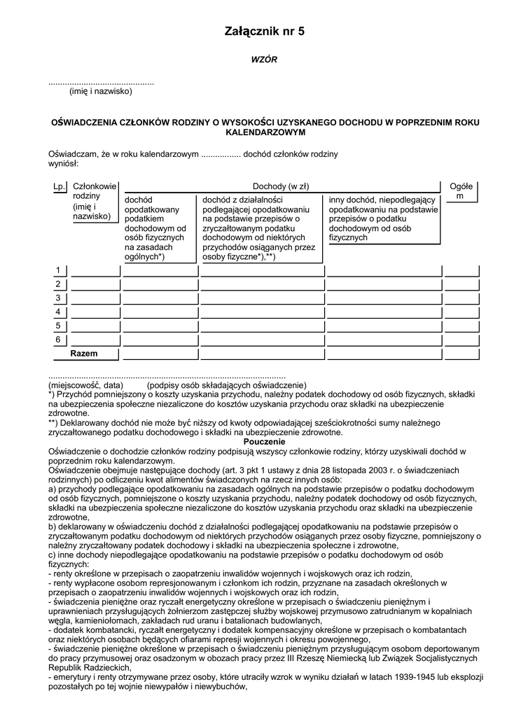 Załącznik nr 5 WZÓR ............................................. (imię i nazwisko) OŚWIADCZENIA CZŁONKÓW RODZINY O WYSOKOŚCI UZYSKANEGO DOCHODU W POPRZEDNIM ROKU KALENDARZOWYM Oświadczam, że w roku kalendarzowym ................. dochód członków rodziny wyniósł: Lp. Członkowie rodziny dochód (imię i opodatkowany nazwisko) podatkiem dochodowym od osób fizycznych na zasadach ogólnych*) Dochody (w zł) dochód z działalności podlegającej opodatkowaniu na podstawie przepisów o zryczałtowanym podatku dochodowym od niektórych przychodów osiąganych przez osoby fizyczne*),**) inny dochód, niepodlegający opodatkowaniu na podstawie przepisów o podatku dochodowym od osób fizycznych Ogółe m 1 2 3 4 5 6 Razem ..................................................................................................... (miejscowość, data) (podpisy osób składających oświadczenie) *) Przychód pomniejszony o koszty uzyskania przychodu, należny podatek dochodowy od osób fizycznych, składki na ubezpieczenia społeczne niezaliczone do kosztów uzyskania przychodu oraz składki na ubezpieczenie zdrowotne. **) Deklarowany dochód nie może być niższy od kwoty odpowiadającej sześciokrotności sumy należnego zryczałtowanego podatku dochodowego i składki na ubezpieczenie zdrowotne. Pouczenie Oświadczenie o dochodzie członków rodziny podpisują wszyscy członkowie rodziny, którzy uzyskiwali dochód w poprzednim roku kalendarzowym. Oświadczenie obejmuje następujące dochody (art. 3 pkt 1 ustawy z dnia 28 listopada 2003 r. o świadczeniach rodzinnych) po odliczeniu kwot alimentów świadczonych na rzecz innych osób: a) przychody podlegające opodatkowaniu na zasadach ogólnych na podstawie przepisów o podatku dochodowym od osób fizycznych, pomniejszone o koszty uzyskania przychodu, należny podatek dochodowy od osób fizycznych, składki na ubezpieczenia społeczne niezaliczone do kosztów uzyskania przychodu oraz składki na ubezpieczenie zdrowotne, b) deklarowany w oświadczeniu dochód z działalności podlegającej opodatkowaniu na podstawie przepisów o zryczałtowanym podatku dochodowym od niektórych przychodów osiąganych przez osoby fizyczne, pomniejszony o należny zryczałtowany podatek dochodowy i składki na ubezpieczenia społeczne i zdrowotne, c) inne dochody niepodlegające opodatkowaniu na podstawie przepisów o podatku dochodowym od osób fizycznych: - renty określone w przepisach o zaopatrzeniu inwalidów wojennych i wojskowych oraz ich rodzin, - renty wypłacone osobom represjonowanym i członkom ich rodzin, przyznane na zasadach określonych w przepisach o zaopatrzeniu inwalidów wojennych i wojskowych oraz ich rodzin, - świadczenia pieniężne oraz ryczałt energetyczny określone w przepisach o świadczeniu pieniężnym i uprawnieniach przysługujących żołnierzom zastępczej służby wojskowej przymusowo zatrudnianym w kopalniach węgla, kamieniołomach, zakładach rud uranu i batalionach budowlanych, - dodatek kombatancki, ryczałt energetyczny i dodatek kompensacyjny określone w przepisach o kombatantach oraz niektórych osobach będących ofiarami represji wojennych i okresu powojennego, - świadczenie pieniężne określone w przepisach o świadczeniu pieniężnym przysługującym osobom deportowanym do pracy przymusowej oraz osadzonym w obozach pracy przez III Rzeszę Niemiecką lub Związek Socjalistycznych Republik Radzieckich, - emerytury i renty otrzymywane przez osoby, które utraciły wzrok w wyniku działań w latach 1939-1945 lub eksplozji pozostałych po tej wojnie niewypałów i niewybuchów, - renty inwalidzkie z tytułu inwalidztwa wojennego, kwoty zaopatrzenia otrzymywane przez ofiary wojny oraz członków ich rodzin, renty wypadkowe osób, których inwalidztwo powstało w związku z przymusowym pobytem na robotach w III Rzeszy Niemieckiej w latach 1939-1945, otrzymywane z zagranicy, - zasiłki chorobowe określone w przepisach o ubezpieczeniu społecznym rolników oraz w przepisach o systemie ubezpieczeń społecznych, - środki bezzwrotnej pomocy zagranicznej otrzymywane od rządów państw obcych, - organizacji międzynarodowych lub międzynarodowych instytucji finansowych, pochodzące ze środków bezzwrotnej pomocy przyznanych na podstawie jednostronnej deklaracji lub umów zawartych z tymi państwami, organizacjami lub instytucjami przez Radę Ministrów, właściwego ministra lub agencje rządowe, w tym również w przypadkach, gdy przekazanie tych środków jest dokonywane za pośrednictwem podmiotu upoważnionego do rozdzielania ś rodków bezzwrotnej pomocy zagranicznej na rzecz podmiotów, którym służyć ma ta pomoc, - należności ze stosunku pracy lub z tytułu stypendium osób fizycznych mających miejsce zamieszkania na terytorium Rzeczypospolitej Polskiej, przebywających czasowo za granicą - w wysokości odpowiadającej równowartości diet z tytułu podróży służbowej poza granicami kraju ustalonych dla pracowników zatrudnionych w państwowych lub samorządowych jednostkach sfery budżetowej na podstawie ustawy z dnia 26 czerwca 1974 r. Kodeks pracy (Dz. U. z 1998 r. Nr 21, poz. 94, z późn. zm.), - należności pieniężne wypłacone policjantom, żołnierzom, celnikom i pracownikom jednostek wojskowych i jednostek policyjnych użytych poza granicami państwa w celu udziału w konflikcie zbrojnym lub wzmocnienia sił państwa albo państw sojuszniczych, misji pokojowej, akcji zapobieżenia aktom terroryzmu lub ich skutkom, a także należności pieniężne wypłacone żołnierzom, policjantom, celnikom i pracownikom pełniącym funkcje obserwatorów w misjach pokojowych organizacji międzynarodowych i sił wielonarodowych, - należności pieniężne ze stosunku służbowego otrzymywane w czasie służby kandydackiej przez funkcjonariuszy Policji, Państwowej Straży Pożarnej, Straży Granicznej, Biura Ochrony Rządu obliczone za okres, w którym osoby te uzyskały dochód, - dochody czło