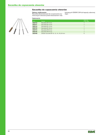 Szczotka do czyszczenia otworów Szczotka do czyszczenia otworów Zakres użytkowania Szczotka stosowana jest do oczyszczenia wywierconych otworów przed stosowaniem mas kotwiących ESSVE CM lub kapsuły udarowej HaC. Opakowania 32 Art.nr Nazwa IloĞü szt. w op. jedn 303710 303711 303713 303715 303714 303716 303709 Szczotka Ø 10 mm Szczotka Ø 12 mm Szczotka Ø 14 mm Szczotka Ø 18 mm Szczotka Ø 20 mm Szczotka Ø 24 mm Zestaw szczotek Ø 10, 12, 14, 18, 24 mm 1 1 1 1 1 1 5
