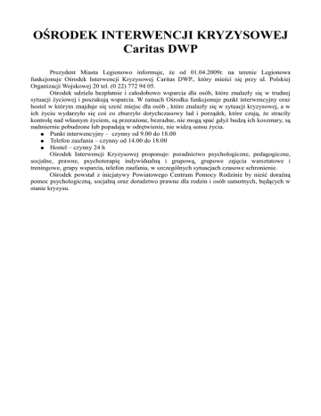 OŚRODEK INTERWENCJI KRYZYSOWEJ Caritas DWP Prezydent Miasta Legionowo informuje, że od 01.04.2009r. na terenie Legionowa funkcjonuje Ośrodek Interwencji Kryzysowej Caritas DWP., który mieści się przy ul. Polskiej Organizacji Wojskowej 20 tel. (0 22) 772 94 05. Ośrodek udziela bezpłatnie i całodobowo wsparcia dla osób, które znalazły się w trudnej sytuacji życiowej i poszukują wsparcia. W ramach Ośrodka funkcjonuje punkt interwencyjny oraz hostel w którym znajduje się sześć miejsc dla osób , które znalazły się w sytuacji kryzysowej, a w ich życiu wydarzyło się coś co zburzyło dotychczasowy ład i porządek, które czują, że straciły kontrolę nad własnym życiem, są przerażone, bezradne, nie mogą spać gdyż budzą ich koszmary, są nadmiernie pobudzone lub popadają w odrętwienie, nie widzą sensu życia. ● Punkt interwencyjny – czynny od 9.00 do 18.00 ● Telefon zaufania – czynny od 14.00 do 18.00 ● Hostel – czynny 24 h Ośrodek Interwencji Kryzysowej proponuje: poradnictwo psychologiczne, pedagogiczne, socjalne, prawne, psychoterapię indywidualną i grupową, grupowe zajęcia warsztatowe i treningowe, grupy wsparcia, telefon zaufania, w szczególnych sytuacjach czasowe schronienie. Ośrodek powstał z inicjatywy Powiatowego Centrum Pomocy Rodzinie by nieść doraźną pomoc psychologiczną, socjalną oraz doradztwo prawne dla rodzin i osób samotnych, będących w stanie kryzysu.