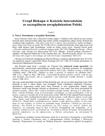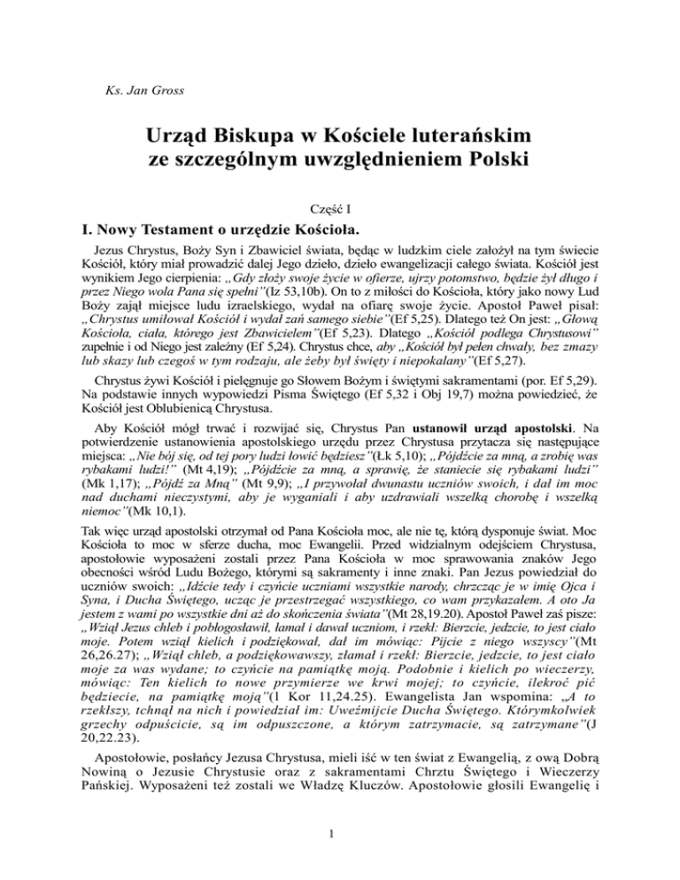 Ks. Jan Gross Urząd Biskupa w Kościele luterańskim ze szczególnym uwzględnieniem Polski Część I I. Nowy Testament o urzędzie Kościoła. Jezus Chrystus, Boży Syn i Zbawiciel świata, będąc w ludzkim ciele założył na tym świecie Kościół, który miał prowadzić dalej Jego dzieło, dzieło ewangelizacji całego świata. Kościół jest wynikiem Jego cierpienia: „Gdy złoży swoje życie w ofierze, ujrzy potomstwo, będzie żył długo i przez Niego wola Pana się spełni”(Iz 53,10b). On to z miłości do Kościoła, który jako nowy Lud Boży zajął miejsce ludu izraelskiego, wydał na ofiarę swoje życie. Apostoł Paweł pisał: „Chrystus umiłował Kościół i wydał zań samego siebie”(Ef 5,25). Dlatego też On jest: „Głową Kościoła, ciała, którego jest Zbawicielem”(Ef 5,23). Dlatego „Kościół podlega Chrystusowi” zupełnie i od Niego jest zależny (Ef 5,24). Chrystus chce, aby „Kościół był pełen chwały, bez zmazy lub skazy lub czegoś w tym rodzaju, ale żeby był święty i niepokalany”(Ef 5,27). Chrystus żywi Kościół i pielęgnuje go Słowem Bożym i świętymi sakramentami (por. Ef 5,29). Na podstawie innych wypowiedzi Pisma Świętego (Ef 5,32 i Obj 19,7) można powiedzieć, że Kościół jest Oblubienicą Chrystusa. Aby Kościół mógł trwać i rozwijać się, Chrystus Pan ustanowił urząd apostolski. Na potwierdzenie ustanowienia apostolskiego urzędu przez Chrystusa przytacza się następujące miejsca: „Nie bój się, od tej pory ludzi łowić będziesz”(Łk 5,10); „Pójdźcie za mną, a zrobię was rybakami ludzi!” (Mt 4,19); „Pójdźcie za mną, a sprawię, że staniecie się rybakami ludzi” (Mk 1,17); „Pójdź za Mną” (Mt 9,9); „I przywołał dwunastu uczniów swoich, i dał im moc nad duchami nieczystymi, aby je wyganiali i aby uzdrawiali wszelką chorobę i wszelką niemoc”(Mk 10,1). Tak więc urząd apostolski otrzymał od Pana Kościoła moc, ale nie tę, którą dysponuje świat. Moc Kościoła to moc w sferze ducha, moc Ewangelii. Przed widzialnym odejściem Chrystusa, apostołowie wyposażeni zostali przez Pana Kościoła w moc sprawowania znaków Jego obecności wśród Ludu Bożego, którymi są sakramenty i inne znaki. Pan Jezus powiedział do uczniów swoich: „Idźcie tedy i czyńcie uczniami wszystkie narody, chrzcząc je w imię Ojca i Syna, i Ducha Świętego, ucząc je przestrzegać wszystkiego, co wam przykazałem. A oto Ja jestem z wami po wszystkie dni aż do skończenia świata”(Mt 28,19.20). Apostoł Paweł zaś pisze: „Wziął Jezus chleb i pobłogosławił, łamał i dawał uczniom, i rzekł: Bierzcie, jedzcie, to jest ciało moje. Potem wziął kielich i podziękował, dał im mówiąc: Pijcie z niego wszyscy”(Mt 26,26.27); „Wziął chleb, a podziękowawszy, złamał i rzekł: Bierzcie, jedzcie, to jest ciało moje za was wydane; to czyńcie na pamiątkę moją. Podobnie i kielich po wieczerzy, mówiąc: Ten kielich to nowe przymierze we krwi mojej; to czyńcie, ilekroć pić będziecie, na pamiątkę moją”(l Kor 11,24.25). Ewangelista Jan wspomina: „A to rzekłszy, tchnął na nich i powiedział im: Uweźmijcie Ducha Świętego. Którymkolwiek grzechy odpuścicie, są im odpuszczone, a którym zatrzymacie, są zatrzymane”(J 20,22.23). Apostołowie, posłańcy Jezusa Chrystusa, mieli iść w ten świat z Ewangelią, z ową Dobrą Nowiną o Jezusie Chrystusie oraz z sakramentami Chrztu Świętego i Wieczerzy Pańskiej. Wyposażeni też zostali we Władzę Kluczów. Apostołowie głosili Ewangelię i 1 udzielali sakramentów, ale jednocześnie, gdy paruzja Pana nie następowała wiedzieli, że muszą postarać się o następców, którzy by dalej to powierzone im dzieło prowadzili aż do skończenia świata. W tym celu powstawały w Kościele różne urzędy, co do których nie mieli apostołowie wątpliwości, że są urzędami pochodzenia Bożego (iure divine). Apostoł Paweł pisał w Liście do Koryntian: „A Bóg ustanowił w Kościele najpierw apostołów, po wtóre proroków, po trzecie nauczycieli, następnie moc czynienia cudów, potem dary uzdrawiania, niesienia pomocy, kierowania, różne języki” (l Kor 12,28; por. Ef 4,11). Pierwszym urzędem w Kościele był urząd apostolski, a więc urząd zwiastowania Słowa Bożego i udzielania sakramentów świętych. Obdarowani urzędem kościelnym mieli w Kościele „przygotować świętych do dzieła posługiwania, do budowania ciała Chrystusowego” (Ef 4,12). Różne stopnie posiadał ten ustanowiony przez Boga urząd kościelny. Najbardziej znane i zachowane w Kościele posługi to: „επισκοπος,” (episkopos - biskup) = dozorca, doglądający, kierujący; presbyteros - prezbiter = starszy i diakonos - diakon = służebnicy, usługujący. Diakoni, wzgl. diakonise, mieli zajmować się w zborze głównie pracą charytatywną i zwiastowaniem. W relacji o powołaniu diakonów czytamy: „Wtedy dwunastu, zwoławszy wszystkich uczniów, rzekło: Nie jest rzeczą słuszną, żebyśmy zaniedbali Słowo Boże, a usługiwali przy stołach. Upatrzcie tedy, bracia, spośród siebie siedmiu mężów, cieszących się zaufaniem, pełnych Ducha Świętego i mądrości, a ustanowimy ich, aby się zajęli tą sprawą; My zaś pilnować będziemy modlitwy i służby Słowa''(Dz 6,2-4). Zawarte są w niej najważniejsze kryteria dotyczące przyjmującego i sprawującego urząd, który powstawał w młodym Kościele chrześcijańskim w każdym zborze, jak mówią Dzieje Apostolskie: „A gdy przez wkładanie rąk wyznaczyli im w każdym zborze starszych, wśród modlitw i postów poruczyli ich Panu, w którego uwierzyli” (Dz 14,23). Na pytanie, w jaki sposób byli ustanawiani ci, którzy mieli przyjąć święty urząd, odpowiadają Dzieje Apostolskie: „Tych stawili przed apostołami, którzy pomodlili się i włożyli na nich ręce” (Dz 6,6). Ustanawianie urzędu kościelnego, czyli tzw. ordy
