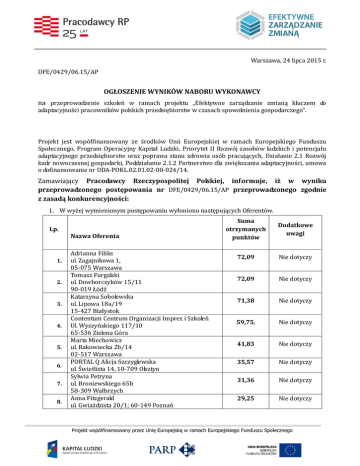 Warszawa, 24 lipca 2015 r. DFE/0429/06.15/AP OGŁOSZENIE WYNIKÓW NABORU WYKONAWCY na przeprowadzenie szkoleń w ramach projektu „Efektywne zarządzanie zmianą kluczem do adaptacyjności pracowników polskich przedsiębiorstw w czasach spowolnienia gospodarczego”. Projekt jest współfinansowany ze środków Unii Europejskiej w ramach Europejskiego Funduszu Społecznego, Program Operacyjny Kapitał Ludzki, Priorytet II Rozwój zasobów ludzkich i potencjału adaptacyjnego przedsiębiorstw oraz poprawa stanu zdrowia osób pracujących, Działanie 2.1 Rozwój kadr nowoczesnej gospodarki, Poddziałanie 2.1.2 Partnerstwo dla zwiększania adaptacyjności, umowa o dofinansowanie nr UDA-POKL.02.01.02-00-024/14. Zamawiający Pracodawcy Rzeczypospolitej Polskiej, informuje, iż w wyniku przeprowadzonego postępowania nr DFE/0429/06.15/AP przeprowadzonego zgodnie z zasadą konkurencyjności: 1. W wyżej wymienionym postępowaniu wyłoniono następujących Oferentów. Lp. 1. 2. 3. 4. 5. 6. 7. 8. Nazwa Oferenta Adrianna Filiks ul. Zagajnikowa 1, 05-075 Warszawa Tomasz Furgalski ul. Dowborczyków 15/11 90-019 Łódź Katarzyna Sobolewska ul. Lipowa 18a/19 15-427 Białystok Contentum Centrum Organizacji Imprez i Szkoleń Ul. Wyszyńskiego 117/10 65-536 Zielona Góra Marta Miechowicz ul. Rakowiecka 2b/14 02-517 Warszawa PORTAL Q Alicja Szczyglewska ul. Świetlista 14, 10-709 Olsztyn Sylwia Petryna ul. Broniewskiego 65b 58-309 Wałbrzych Anna Fitzgerald ul. Gwiaździsta 20/1; 60-149 Poznań Suma otrzymanych punktów Dodatkowe uwagi 72,09 Nie dotyczy 72,09 Nie dotyczy 71,38 Nie dotyczy 59,75, Nie dotyczy 41,83 Nie dotyczy 35,57 Nie dotyczy 31,36 Nie dotyczy 29,25 Nie dotyczy Projekt współfinansowany przez Unię Europejską w ramach Europejskiego Funduszu Społecznego Anita Frankowiak 9. Instytut Dyplomacji ul. Panny 9, 11-034 Tomaszkowo k/Olsztyna Małgorzata Kotewicz 10. ul. T.Kościuszki 74/17 61-892 Poznań 27,12 Nie dotyczy 22,99 Nie dotyczy 2. W wyżej wymienionym postępowaniu następujące oferty nie spełniły kryteriów określonych w zapytaniu ofertowym. Lp. 1. Nazwa Oferenta Ireneusz Wolski, Brainstorm Group Sp. z o.o.ul. Połomińska 11A, 40-585 Katowice 2. Justyna Masłyk (Grupa MDP Sp. z o.o.)ul. Bernandyńska 11 35-069 Rzeszów 3. Małgorzata Szymczyk ul. Wschodnia 149; 95-054 Ksawerów 4. 5. 6. 7. 8. 9. 10. 11. 12. 13. 14. POINTS Berenika Gocłowska ul. Bolesława Śmiałego 9/1; 70-351 Szczecin Wojciech Michałek WIK Consulting ul. Płowiecka 3/18; 62-510 Konin Joanna Konieczna ul. Obrońców Tobruku 25/161; 01-494 Warszawa Studio Rozwojowe Olga Matecka ul. Gallusa 12/103; 40-594 Katowice Nowe motywacje Sp. z o.o. Anna Popek ; ul. Ehrenberga 15 31-309 Kraków PM Sp. z o.o. Joanna Antoniak ul. Gustawa Ehrenberga 15; 31-309 Kraków Dudziak i Partnerzy ul. Jagiellońska 85/14; 70-437 Szczecin Marcin Kamaszyn ul. Smardzewska 21a/11; 60-161 Poznań Instytut Szkoleń, Badań i Analiz TAURUS Hanna Kądziołka-Sabanty; ul. Kozietuskiego 5, 94-012 Łódź 4 QUALITY DORADZTWO SZKOLENIA Monika Burek ul. Zazdrosna 10; 44-246 Palowice Profea; ul. Zawieyskiego 7/6, 31-619 Kraków Centrum Kreowania Liderów S.A. ul. Ściegiennego 3, 40-114 Katowice 4 business&people, 16. ul. Mickiewicza 55 01-625 Warszawa 15. Projekt współfinansowany przez Unię Europejską w ramach Europejskiego Funduszu Społecznego