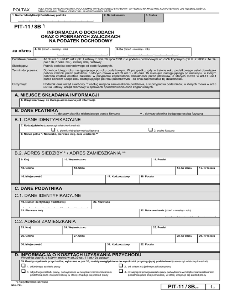 POLTAX POLA JASNE WYPEŁNIA PŁATNIK, POLA CIEMNE WYPEŁNIA URZĄD SKARBOWY. WYPEŁNIAĆ NA MASZYNIE, KOMPUTEROWO LUB RĘCZNIE, DUŻYMI, DRUKOWANYMI LITERAMI, CZARNYM LUB NIEBIESKIM KOLOREM. 1. Numer Identyfikacji Podatkowej płatnika 2. Nr dokumentu 3. Status └────┴────┴────┴────┴────┴────┴────┴────┴────┴────┴────┴────┴────┘ PIT-11 / 8B *) INFORMACJA O DOCHODACH ORAZ O POBRANYCH ZALICZKACH NA PODATEK DOCHODOWY za okres 4. Od (dzień - miesiąc - rok) 5. Do (dzień - miesiąc - rok) └────┴────┘-└────┴────┘-└────┴────┴────┴────┘ Podstawa prawna: Składający: └────┴────┘-└────┴────┘-└────┴────┴────┴────┘ Art.39 ust.1 i art.42 ust.2 pkt 1 ustawy z dnia 26 lipca 1991 r. o podatku dochodowym od osób fizycznych (Dz.U. z 2000 r. Nr 14, poz.176, z późn. zm.), zwanej dalej ”ustawą”. Płatnik podatku dochodowego od osób fizycznych. Termin doręczenia: Do końca lutego roku następującego po roku podatkowym. W przypadku, gdy w trakcie roku podatkowego ustał obowiązek poboru zaliczki przez płatników, o których mowa w art.39 ust.1 - do dnia 15 miesiąca następującego po miesiącu, w którym pobrana została ostatnia zaliczka; w przypadku zaprzestania działalności przez płatników, o których mowa w art.41 ust.1 przed końcem lutego roku następującego po roku podatkowym - do dnia zaprzestania tej działalności. Otrzymuje: Podatnik oraz urząd skarbowy 1) według miejsca zamieszkania podatnika, a w przypadku podatników, o których mowa w art.3 ust.2a ustawy, urząd skarbowy w sprawach opodatkowania osób zagranicznych. A. MIEJSCE SKŁADANIA INFORMACJI 6. Urząd skarbowy, do którego adresowana jest informacja B. DANE PŁATNIKA * - dotyczy płatnika niebędącego osobą fizyczną ** - dotyczy płatnika będącego osobą fizyczną B.1. DANE IDENTYFIKACYJNE 7. Rodzaj płatnika (zaznaczyć właściwy kwadrat): q q 2. osoba fizyczna 1. płatnik niebędący osobą fizyczną 8. Nazwa pełna * / Nazwisko, pierwsze imię, data urodzenia ** B.2. ADRES SIEDZIBY * / ADRES ZAMIESZKANIA ** 9. Kraj 10. Województwo 12. Gmina 11. Powiat 13. Ulica 16. Miejscowość 14. Nr domu 17. Kod pocztowy 15. Nr lokalu 18. Poczta C. DANE PODATNIKA C.1. DANE IDENTYFIKACYJNE 19. Numer Identyfikacji Podatkowej 20. Nazwisko └────┴────┴────┘-└────┴────┴────┘-└────┴────┘-└────┴────┘ 21. Pierwsze imię 22. Data urodzenia (dzień - miesiąc - rok) └────┴────┘-└────┴────┘-└────┴────┴────┴────┘ C.2. ADRES ZAMIESZKANIA 23. Kraj 26. Gmina 30. Miejscowość 24. Województwo 25. Powiat 27. Ulica 28. Nr domu 31. Kod pocztowy 29. Nr lokalu 32. Poczta D. INFORMACJA O KOSZTACH UZYSKANIA PRZYCHODU Wypełnia płatnik, o którym mowa w art.39 ust.1 i art.42e ustawy. 33. Koszty uzyskania przychodów, wykazane w poz.35, zostały uwzględnione do wysokości przysługującej podatnikowi (zaznaczyć właściwy kwadrat): q 1. od jednego zakładu pracy q 3. od jednego zakładu pracy, podwyższone w związku z zamieszkiwaniem podatnika poza miejscowością, w której znajduje się zakład pracy q 2. od więcej niż jednego zakładu pracy q 4. od więcej niż jednego zakładu pracy, podwyższone w związku z zamieszkiwaniem podatnika poza miejscowością, w której znajduje się zakład pracy *) niepotrzebne skreœliæ Min. Fin. PIT-11 / 8B (12) 1/2 POLTAX POLA JASNE WYPEŁNIA PŁATNIK, POLA CIEMNE WYPEŁNIA URZĄD SKARBOWY. WYPEŁNIAĆ NA MASZYNIE, KOMPUTEROWO LUB RĘCZNIE, DUŻYMI, DRUKOWANYMI LITERAMI, CZARNYM LUB NIEBIESKIM KOLOREM. E. DOCHODY PODATNIKA, POBRANE ZALICZKI ORAZ POBRANE SKŁADKI 4) Źródła Przychód 2) przychodów zł, a 1. Wynagrodzenia ze stosunku: pracy, służbowego, spółdzielczego i z pracy nakładczej, a także zasiłki pieniężne z ubezpieczenia społecznego wypłacone przez zakład pracy Koszty uzyskania przychodów 3) gr b c 34. zł, Dochód (b - c) zł, gr 35. Zaliczka pobrana przez płatnika gr d zł, e 36. gr 37. , W poz.38 należy wykazać przychody, do których zastosowano odliczenie kosztów uzyskania przychodów na podstawie art.22 ust.9 pkt 3 ustawy. 2. Dniówki obrachunkowe i udziały w dochodzie podzielnym rolniczej spółdzielni produkcyjnej lub innej spółdzielni zajmującej się produkcją rolną oraz zasiłki pieniężne z ubezpieczenia społecznego 38. 3. Emerytury - renty zagraniczne 43. 4. Należności za pracę przypadające tymczasowo aresztowanym lub skazanym 46. 5. Świadczenia wypłacone z Funduszów: Pracy i Gwarantowanych Świadczeń Pracowniczych 49. 6. Przychody z osobiście wykonywanej działalności, o której mowa w art.13 pkt 2, 4, 6 (z wyjątkiem czynności wymienionych w wierszu 7) i 8 ustawy, w tym z umowy zlecenia i o dzieło 52. 7. Czynności związane z pełnieniem obowiązków społecznych lub obywatelskich (art.13 pkt 5 i 6 ustawy) Należy wpisać kwotę wynikającą z PIT-R. 8. Udział w organach stanowiących osób prawnych (art.13 pkt 7 ustawy) 56. 9. Kontrakt menedżerski, umowa o zarządzanie przedsiębiorstwem lub umowa o podobnym charakterze (art.13 pkt 9 ustawy) 10. Prawa autorskie i inne prawa, o których mowa w art.18 ustawy 64. 11. Inne źródła 72. 39. , , 40. , 41. , , 42. , 44. , , 45. , 47. , , 48. , 50. , , 51. , 53. , 54. , 57. , , 58. , 60. 61. , , , , 69. , , 63. , 66. , 68. , 59. 62. 65. , 55. , 67. , 70. , , 71. , 73. , , 74. , Składki na ubezpieczenia społeczne, o których mowa w art.26 ust.1 pkt 2 lit.b ustawy 75. Składki na ubezpieczenie zdrowotne, o których mowa w art.27b ust.1 pkt 2, z zastrzeżeniem art.27b ust.2 ustawy 76. , zł, gr zł, gr zł,