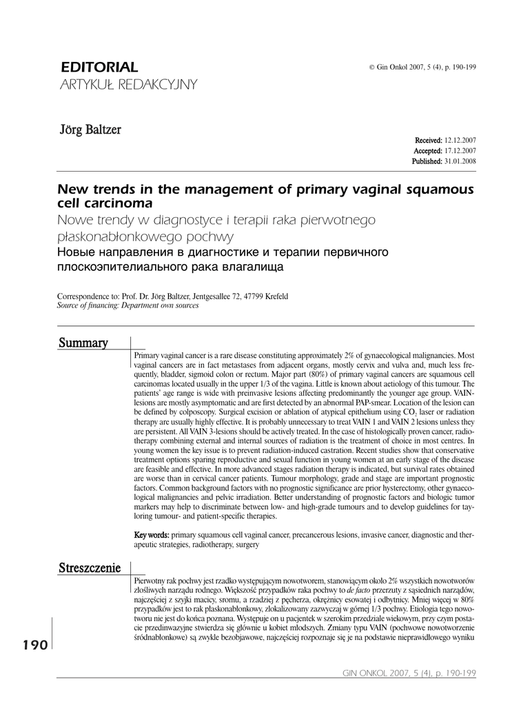 EDITORIAL ARTYKU£ REDAKCYJNY © Gin Onkol 2007, 5 (4), p. 190-199 Jörg Baltzer Received: 12.12.2007 Accepted: 17.12.2007 Published: 31.01.2008 New trends in the management of primary vaginal squamous cell carcinoma Nowe trendy w diagnostyce i terapii raka pierwotnego p³askonab³onkowego pochwy Новые направления в диагностике и терапии первичного плоскоэпителиального рака влагалища Correspondence to: Prof. Dr. Jörg Baltzer, Jentgesallee 72, 47799 Krefeld Source of financing: Department own sources Summary Primary vaginal cancer is a rare disease constituting approximately 2% of gynaecological malignancies. Most vaginal cancers are in fact metastases from adjacent organs, mostly cervix and vulva and, much less frequently, bladder, sigmoid colon or rectum. Major part (80%) of primary vaginal cancers are squamous cell carcinomas located usually in the upper 1/3 of the vagina. Little is known about aetiology of this tumour. The patients’ age range is wide with preinvasive lesions affecting predominantly the younger age group. VAINlesions are mostly asymptomatic and are first detected by an abnormal PAP-smear. Location of the lesion can be defined by colposcopy. Surgical excision or ablation of atypical epithelium using CO2 laser or radiation therapy are usually highly effective. It is probably unnecessary to treat VAIN 1 and VAIN 2 lesions unless they are persistent. All VAIN 3-lesions should be actively treated. In the case of histologically proven cancer, radiotherapy combining external and internal sources of radiation is the treatment of choice in most centres. In young women the key issue is to prevent radiation-induced castration. Recent studies show that conservative treatment options sparing reproductive and sexual function in young women at an early stage of the disease are feasible and effective. In more advanced stages radiation therapy is indicated, but survival rates obtained are worse than in cervical cancer patients. Tumour morphology, grade and stage are important prognostic factors. Common background factors with no prognostic significance are prior hysterectomy, other gynaecological malignancies and pelvic irradiation. Better understanding of prognostic factors and biologic tumor markers may help to discriminate between low- and high-grade tumours and to develop guidelines for tayloring tumour- and patient-specific therapies. Key words: primary squamous cell vaginal cancer, precancerous lesions, invasive cancer, diagnostic and therapeutic strategies, radiotherapy, surgery Streszczenie 190 Pierwotny rak pochwy jest rzadko wystêpuj¹cym nowotworem, stanowi¹cym oko³o 2% wszystkich nowotworów z³oœliwych narz¹du rodnego. Wiêkszoœæ przypadków raka pochwy to de facto przerzuty z s¹siednich narz¹dów, najczêœciej z szyjki macicy, sromu, a rzadziej z pêcherza, okrê¿nicy esowatej i odbytnicy. Mniej wiêcej w 80% przypadków jest to rak p³askonab³onkowy, zlokalizowany zazwyczaj w górnej 1/3 pochwy. Etiologia tego nowotworu nie jest do koñca poznana. Wystêpuje on u pacjentek w szerokim przedziale wiekowym, przy czym postacie przedinwazyjne stwierdza siê g³ównie u kobiet m³odszych. Zmiany typu VAIN (pochwowe nowotworzenie œródnab³onkowe) s¹ zwykle bezobjawowe, najczêœciej rozpoznaje siê je na podstawie nieprawid³owego wyniku GIN ONKOL 2007, 5 (4), p. 190-199 EDITORIAL/ARTYKU£ REDAKCYJNY badania cytologicznego metod¹ Papanicolaou. W celu lokalizacji zmiany wykonuje siê badanie kolposkopowe. Do skutecznych metod leczniczych zalicza siê chirurgiczne usuniêcie zmienionego nab³onka, zabieg przy u¿yciu lasera CO2 i radioterapiê. Leczenie zmian w stadium VAIN 1 i VAIN 2 prawdopodobnie nie jest konieczne, z wyj¹tkiem przypadków d³ugotrwale utrzymuj¹cych siê, natomiast zmiany w stadium VAIN 3 nale¿y aktywnie leczyæ. W wiêkszoœci przypadków histologicznie potwierdzonego raka pochwy leczeniem z wyboru stosowanym w licznych oœrodkach jest radioterapia z zastosowaniem kombinacji Ÿróde³ zewnêtrznych i wewnêtrznych. Wa¿nym aspektem terapii, szczególnie u kobiet m³odych, jest zapobieganie popromiennej kastracji. Badania wykaza³y, ¿e nowe strategie terapeutyczne oszczêdzaj¹ce funkcje rozrodcze i p³ciowe u kobiet w m³odszym przedziale wiekowym, u których zdiagnozowano raka p³askonab³onkowego górnej czêœci pochwy we wczesnej fazie choroby, s¹ mo¿liwe do przeprowadzenia i skuteczne. W bardziej zaawansowanym stadium choroby, podobnie jak u pacjentek z rakiem szyjki macicy, wskazana jest radioterapia, jednak uzyskiwane wskaŸniki prze¿ywalnoœci s¹ gorsze ni¿ u chorych na raka szyjki. Wa¿nymi czynnikami prognostycznymi s¹: morfologia guza, jego stopieñ z³oœliwoœci i stadium zaawansowania klinicznego. Czêsto cytowane czynniki, niemaj¹ce znaczenia rokowniczego, obejmuj¹: stan po histerektomii, wspó³istnienie innych nowotworów narz¹du rodnego i stan po napromienieniu miednicy. Znajomoœæ czynników prognostycznych i rosn¹ca wiedza o dodatkowych markerach biologicznych mog¹ byæ pomocne w ró¿nicowaniu przypadków o wysokiej i niskiej z³oœliwoœci oraz w indywidualizacji leczenia, które bêdzie uwzglêdnia³o zarówno potrzeby pacjenta, jak i cechy nowotworu. S³owa kluczowe: pierwotny rak p³askonab³onkowy pochwy, stany przedrakowe, rak inwazyjny, strategia diagnostyczna i terapeutyczna, radioterapia, chirurgia C , 2% . , , , , . 80% , 1/3 . ! . " # , $ . " ( – &'"!) , * # . +, , * . 4 $$, * # 52 . &'"! 1 &'"! 2, , . & &'"! 3 . & * , #, . 6 , *, * # #. " , , * $# * , * $$. , # , , * * . +$ , $ . 7 # $ , . 9 – , , . $ , * $$# , * , # #$ . : , , , , , 191 GIN ONKOL 2007, 5 (4), p. 190-199 EDITORIAL/ARTYKU£ REDAKCYJNY INTRODUCTION WSTÊP aginal cancer is a rare condition, representing approximately 1-3% of all gynaecologic malignancies. Most of them are squamous cell carcinomas, but rare cases of clear cell adenocarcinoma and me
