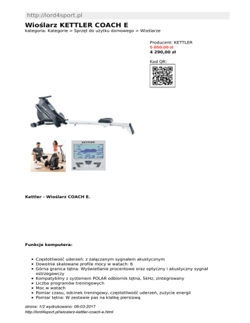 http://lord4sport.pl Wioślarz KETTLER COACH E kategoria: Kategorie > Sprzęt do użytku domowego > Wioślarze Producent: KETTLER 5 050,00 zł 4 290,00 zł Kod QR: Kettler - Wioślarz COACH E. Funkcje komputera: Częstotliwość uderzeń: z załączanym sygnałem akustycznym Dowolnie skalowane profile mocy w watach: 6 Górna granica tętna: Wyświetlanie procentowe oraz optyczny i akustyczny sygnał ostrzegawczy Kompatybilny z systemem POLAR odbiornik tętna, 5kHz, zintegrowany Liczba programów treningowych Moc w watach Pomiar czasu, odcinek treningowy, częstotliwość uderzeń, zużycie energii Pomiar tętna: W zestawie pas na klatkę piersiową strona: 1/2 wydrukowano: 08-03-2017 http://lord4sport.pl/wioslarz-kettler-coach-e.html Pomiar tętna w fazie spoczynku z oceną sprawności Programy sterowane tętnem: 4 Sterowanie parametrami Sterowanie ręczne Wartości średnie na koniec treningu Wyświetlacz: LCD Wyświetlacz ciągły: 8 funkcji, załączane automatyczne naprzemienne wyświetlanie danych treningowych Dane techniczne: Koło zamachowe: 6 kg Maks. obciążenie wagowe: 130 kg Odległość podnóżków od siedziska (min. / maks. w cm): 23 - 116 Regulacja obciążenia: W zależności od prędkości do 500 watów System hamowania: indukcyjny System napędowy: wyciąg linowy Wymiary po rozłożeniu (dł./sz./w. w cm): 206 / 53 / 67 fałdowy 67 / 53 / 206 Dodatkowe ćwiczenia siłowe / kondycyjne: 18 / częściowo z deską tapicerowaną Kółka transportowe Mechanizm składania Pas piersiowy: w zestawie Podnóżki: Obrotowe / pętle na stopy / dodatkowo stopa plastikowa na płozie Siedzisko: Siedzisko na rolkach, z łożyskami kulkowymi Pozostałe informacje: Koszt wysyłki: GRATIS!! Paragon lub faktura VAT Gwarancja 36 miesięcy UWAGA!!! Klienci, którzy zamierzają odwiedzić nasze salony w celu przetestowania prosimy o to,żeby przed przyjazdem sprawdzić telefonicznie czy dany model znajduje się aktualnie na ekspozycji danego salonu. strona: 2/2 wydrukowano: 08-03-2017 http://lord4sport.pl/wioslarz-kettler-coach-e.html