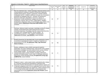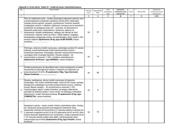 Załącznik nr 1d do oferty: Pakiet IV – środki do mycia i dezynfekcji basenu Lp. 1 1 2 3 4 5 Nazwa artykułu 2 Płyn do uzdatniania wody – środek zawierający kationowe polimery amin czwartorzędowych (zawartość substancji czynnej 34%) niepieniący związek przeciw glonom, grzybom, gronkowcom. Powinien spełniać następujące warunki: w stęŜeniu uŜytkowym znoszący się ze wszystkimi produktami do pielęgnacji wody; pH – neutralne, do stosowania w basenach publicznych, bezsmakowy i bezwonny; odporny na temperaturę i światło ultrafioletowe; nadający się równieŜ do wód mineralnych i solanek; wolny od chloru i metali cięŜkich; ulegający biodegradacji; pielęgnujący skórę; nie podraŜniający skóry nawet w 100 – krotnym stęŜeniu.Opakowanie 30 kg; typu ALBA SUPER; nazwa handlowa ............................. Pachnący, alkaiczny środek czyszczący, zawierający poniŜej 2% zasady sodowej, wysokowartościowe środki powierzchniowo czynne, i substancje zapachowe. Posiadający zdolność rozpuszczania tłuszczów, usuwający brud z krawędzi basenów. Wysoko wydajny – do rozcieńczenia w stosunku 1:100, o działaniu antystatycznym. Opakowanie 30 litrowe ; typu BANISOL; nazwa handlowa ................................................................... Środek przeznaczony do dezynfekcji stóp i innych powierzchni w formie koncentratu do sporządzania roztworu o stęŜeniu (w zaleŜności od przeznaczenia) 0,5-2,5%. W opakowaniu 10kg. Typu Dermacid. Nazwa handlowa ................................ Kwaśny, podstawowy, płynny środek czyszczący do basenów. Zawierający 10% kwasu ortofosforowego, mniej niŜ 25% kwasu solnego, biologicznie rozkładające się środki powierzchniowo czynne, inhibitory korozji. Bardzo wydajny - do rozcieńczania w stosunku 1:100; rozpuszczający wapno i osady mineralne; usuwający zabarwienia powstałe od działania Ŝelaza i innych metali; nie atakujący materiałów basenowych i emalii chlorokauczukowej. W opakowaniu 35 kg; typu COMPACTAL; nazwa handlowa ......................................................................... Koagulant w płynie – wodny roztwór chlorku wodorotlenku glinu, słuŜący do wytrącania zanieczyszczeń powodujących zmętnienie wody basenowej. Wartość pH koncentratu 4,2; szerokie spektrum wartości pH z zakresem koagulacji od pH 4,5 do 9,5 (optymalnie od 6,5 do 8,0), który moŜna stosować bezpośrednio lub rozcieńczać z wodą w proporcji aŜ do 1:10; tworzący bardzo szybko duŜe płatki z zanieczyszczeń wody zatrzymujące się na filtrze.Opakowanie 30 kg, typu Flockfix; nazwa handlowa ..................................................... Jednostka miary Szacunkowa ilość Cena jednostkowa netto Zestawienie wartościowe netto kolumna 4x5 % VAT Wartość VAT Zestawienie wartościowe brutto kolumna 6+8 3 4 5 6 7 8 9,00 op 37 op 14 op 56 op 9 op 73 6 7 8 9 10 Środek do czyszczenia i dezynfekcji łaźni parowych; do czyszczenia płytek ceramicznych, urządzeń z tworzywa sztucznego i ławek do siedzenia; zawiera: wodorotlenek sodu, substancje czynne; pachnący, rozpuszczający tłuszcze i pot; do stosowania w ciśnieniowych urządzeniach do czyszczenia; do stosowania w stanie stęŜonym i rozcieńczonym 1:20 ; Opakowanie 10kg, typu Dampfbadreiniger; nazwa handlowa ...................................... Dezynfekujący środek czyszczący do powierzchni drewnianych w saunach, dezynfekuje i rozjaśnia ławki, ściany i leŜaki w saunach wszystkich rodzajów drewna; przeciwdziała powstawaniu plam z potu; do stosowania w stanie stęŜonym i rozcieńczonym; zawierający poniŜej 5% nadtlenku wodoru (o zawartości aktywnego tlenu ok. 2,5%); detergenty kationowe (łączna wartość substancji czynnej ok. 1,5%); Opakowanie 10kg,typu Saunareinigier; nazwa handlowa ...................................... Podchloryn sodu płynny, stabilizowany. Substancja zgodna z normą DIN 19643; roztwór zawierający: 16% (plus-minus 3%} aktywnego chloru, substancję czynną (stabilizant), środek przeciwko inkrustacji pomp i zaworów dozujących; ulega powolnemu rozkładowi ze względu na swoją stabilizację. Opakowanie 35kg; typu Chemochlor płynny; Nazwa handlowa ................................ Środek w płynie; zawiera: do 51% kwasu siarkowego, kwasy mineralne, zawiera inhibitory korozji przez co nie jest agresywny dla instalacji basenowej, produkt wolny od chlorków (nie jest korozyjny); Opakowanie 40kg; typu Korektor PH minus; Nazwa handlowa ................................ Chlorek Sodu – NaCl - okrągłe tabletki (średnica 25 mm, wysokość 12 mm) dolna i górna powierzchnia wypukła cylindryczne (soczewkowe), barwa biała, bez zapachu o słonym smaku, bez oznak szlamowania podczas rozpuszczania w wodzie, rozpuszczają się równomiernie, bez rozpadu na pojedyncze kryształki. Środek słuŜący do procesów uzdatniania wody, regeneracji wymienników jonowych, regeneracji zmiękczaczy wody i filtrów multifunkcyjnych, gwarantujący bezproblemową prac urządzeń.; o parametrach: NaCl: 99,10% 99,90%,Ph 1% r-n: 6,3 –8,0; współczynnik twardości 250-349 N/cm2; ścieralność: 0,5%; substancje nierozpuszczalne w wodzie: 0,002%; zawartość wapnia: 0,002%; zawartość Ŝelaza 0,003%; zawartość magnezu: 0,001%; zawartość siarczanów; 0,12%; wilgotność: 0,03%. Opakowanie worek foliowy PP 25 kg z etykietą. Nazwa handlowa ................................ op 28 op 28 szt. 400 szt. 105 op 240 11 Profesjonalny olekek zapachowy o długotrwałym intensywnym działaniu, przeznaczony do łazienek, toalet, pokoi, samochodów i innych pomieszczeń. Likwiduje wszelkie nieprzyjemne zapachy np. z WC, kanalizacji.Skoncentrowane, naturalne zapachy pozostawiają przyjemny zapach kilkakrotnie dłuŜej niŜ inne odświeŜacze. Zawiera Alkohol etylowy 40-50%, Alkohol izopropylowy 20-30%, Octan etylu 0-10%, Olej pomarańczowy brazylijski 0-5%, Salicylat benzylu 0-5%, Geraniol 97% 05%, Kumaryn CRYST 0-5% ;Opakowanie 1l ; Ol