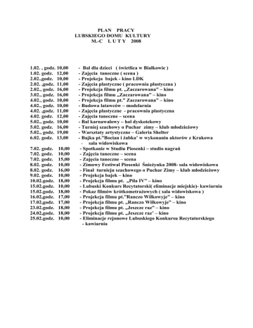 PLAN PRACY LUBSKIEGO DOMU KULTURY M.-C L U T Y 2008 1.02. , godz. 10,00 1.02. godz. 12,00 2.02.,godz. 10,00 2.02. ,godz. 11,00 2.02., godz. 16,00 3.02., godz. 16,00 4.02., godz. 10,00 4.02., godz. 10,00 4.02. ,godz. 11,00 4.02. godz. 12,00 5.02., godz. 10,00 5.02. godz. 16,00 5.02., godz. 19,00 6.02. godz. 13,00 7.02. godz. 7.02. godz. 7.02. godz. 8.02. godz. 8.02. godz. 9.02. godz. 10.02.godz. 15.02.godz. 15.02.godz. 16.02,godz. 17.02,godz. 23.02.godz. 24.02,godz. 25.02.godz. 10,00 10,00 15,00 10,00 16,00 10,00 18,00 10,00 18,00 17,00 17,00 18,00 18,00 10,00 - Bal dla dzieci ( świetlica w Białkowie ) - Zajęcia taneczne ( scena ) - Projekcja bajek - kino LDK - Zajęcia plastyczne ( pracownia plastyczna ) - Projekcja filmu pt. „Zaczarowana” – kino - Projekcja filmu „Zaczarowana” – kino - Projekcja filmu pt.” Zaczarowana” – kino - Budowa latawców – modelarnia - Zajęcia plastyczne - pracownia plastyczna - Zajęcia taneczne – scena - Bal karnawałowy – hol dyskotekowy - Turniej szachowy o Puchar zimy – klub młodzieŜowy - Warsztaty artystyczne – Galeria Shelter - Bajka pt.”Bocian i Ŝabka’ w wykonaniu aktorów z Krakowa - sala widowiskowa - Spotkanie w Studiu Piosenki – studio nagrań - Zajęcia taneczne – scena - Zajęcia taneczne – scena - Zimowy Festiwal Piosenki ŚnieŜynka 2008- sala widowiskowa - Finał turnieju szachowego o Puchar Zimy – klub młodzieŜowy - Projekcja bajek – kino - Projekcja filmu pt. „Piła IV” – kino - Lubuski Konkurs Recytatorski( eliminacje miejskie)- kawiarnia - Pokaz filmów krótkometraŜowych ( sala widowiskowa ) - Projekcja filmu pt.”Ranczo Wilkowyje” – kino - Projekcja filmu pt. „Ranczo Wilkowyje” – kino - Projekcja filmu pt. „Jeszcze raz” – kino - Projekcja filmu pt. „Jeszcze raz’ – kino - Eliminacje rejonowe Lubuskiego Konkursu Recytatorskiego - kawiarnia