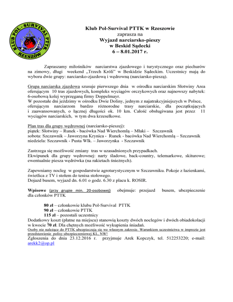 Klub Pol-Survival PTTK w Rzeszowie zaprasza na Wyjazd narciarsko-pieszy w Beskid Sądecki 6 – 8.01.2017 r. Zapraszamy miłośników narciarstwa zjazdowego i turystycznego oraz piechurów na zimowy, długi weekend „Trzech Króli” w Beskidzie Sądeckim. Uczestnicy mają do wyboru dwie grupy: narciarsko-zjazdową i wędrowną (narciarsko-pieszą). Grupa narciarska zjazdowa szusuje pierwszego dnia w ośrodku narciarskim Słotwiny Area oferującym 10 tras zjazdowych, kompleks wyciągów orczykowych oraz najnowszy nabytek: 6-osobową kolej wyprzęganą firmy Doppelmayr. W pozostałe dni jeździmy w ośrodku Dwie Doliny, jednym z najatrakcyjniejszych w Polsce, oferującym narciarzom bardzo różnorodne trasy narciarskie, dla początkujących i zaawansowanych, o łącznej długości ok. 10 km. Całość obsługiwana jest przez 11 wyciągów narciarskich, w tym dwa krzesełkowe. Plan tras dla grupy wędrownej (narciarsko-pieszej): piątek: Słotwiny – Runek - bacówka Nad Wierchomlą – Młaki – Szczawnik sobota: Szczawnik – Jaworzyna Krynica - Runek - bacówka Nad Wierchomlą – Szczawnik niedziela: Szczawnik - Pusta Wlk. – Jaworzynka - Szczawnik Zastrzega się możliwość zmiany tras w uzasadnionych przypadkach. Ekwipunek dla grupy wędrownej: narty śladowe, back-country, telemarkowe, skiturowe; ewentualnie piesza wędrówka (na rakietach śnieżnych). Zapewniamy nocleg w gospodarstwie agroturystycznym w Szczawniku. Pokoje z łazienkami, świetlica z TV i stołem do tenisa stołowego. Dojazd busem, wyjazd dn. 6.01 o godz. 6.30 z placu k. ROSIR. Wpisowe (przy grupie min. 20-osobowej) dla członków PTTK obejmuje: przejazd busem, ubezpieczenie 80 zł – członkowie klubu Pol-Survival PTTK 90 zł – członkowie PTTK 115 zł – pozostali uczestnicy Dodatkowy koszt (płatne na miejscu) stanowią koszty dwóch noclegów i dwóch obiadokolacji w kwocie 70 zł. Dla chętnych możliwość wykupienia śniadań. Osoby nie należące do PTTK ubezpieczają się we własnym zakresie. Warunkiem uczestnictwa w imprezie jest przedstawienie polisy ubezpieczeniowej KL, NW! Zgłoszenia do dnia 23.12.2016 r. [email protected] przyjmuje Arek Kopczyk, tel. 512253220; e-mail: