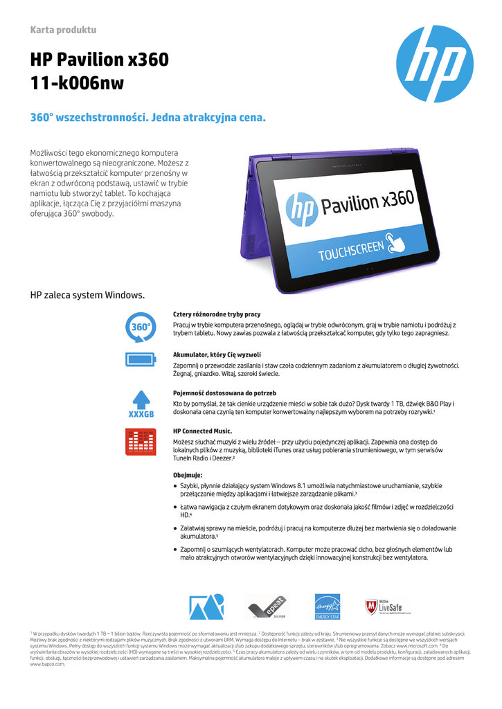 Karta produktu HP Pavilion x360 11-k006nw 360° wszechstronności. Jedna atrakcyjna cena. Możliwości tego ekonomicznego komputera konwertowalnego są nieograniczone. Możesz z łatwością przekształcić komputer przenośny w ekran z odwróconą podstawą, ustawić w trybie namiotu lub stworzyć tablet. To kochająca aplikacje, łącząca Cię z przyjaciółmi maszyna oferująca 360° swobody. HP zaleca system Windows. Cztery różnorodne tryby pracy Pracuj w trybie komputera przenośnego, oglądaj w trybie odwróconym, graj w trybie namiotu i podróżuj z trybem tabletu. Nowy zawias pozwala z łatwością przekształcać komputer, gdy tylko tego zapragniesz. Akumulator, który Cię wyzwoli Zapomnij o przewodzie zasilania i staw czoła codziennym zadaniom z akumulatorem o długiej żywotności. Żegnaj, gniazdko. Witaj, szeroki świecie. Pojemność dostosowana do potrzeb Kto by pomyślał, że tak cienkie urządzenie mieści w sobie tak dużo? Dysk twardy 1 TB, dźwięk B&O Play i doskonała cena czynią ten komputer konwertowalny najlepszym wyborem na potrzeby rozrywki.1 HP Connected Music. Możesz słuchać muzyki z wielu źródeł – przy użyciu pojedynczej aplikacji. Zapewnia ona dostęp do lokalnych plików z muzyką, biblioteki iTunes oraz usług pobierania strumieniowego, w tym serwisów TuneIn Radio i Deezer.2 Obejmuje: ● Szybki, płynnie działający system Windows 8.1 umożliwia natychmiastowe uruchamianie, szybkie przełączanie między aplikacjami i łatwiejsze zarządzanie plikami.3 ● Łatwa nawigacja z czułym ekranem dotykowym oraz doskonała jakość filmów i zdjęć w rozdzielczości HD.4 ● Załatwiaj sprawy na mieście, podróżuj i pracuj na komputerze dłużej bez martwienia się o doładowanie akumulatora.5 ● Zapomnij o szumiących wentylatorach. Komputer może pracować cicho, bez głośnych elementów lub mało atrakcyjnych otworów wentylacyjnych dzięki innowacyjnej konstrukcji bez wentylatora. W przypadku dysków twardych 1 TB = 1 bilion bajtów. Rzeczywista pojemność po sformatowaniu jest mniejsza. 2 Dostępność funkcji zależy od kraju. Strumieniowy przesył danych może wymagać płatnej subskrypcji. Możliwy brak zgodności z niektórymi rodzajami plików muzycznych. Brak zgodności z utworami DRM. Wymaga dostępu do Internetu – brak w zestawie. 3 Nie wszystkie funkcje są dostępne we wszystkich wersjach systemu Windows. Pełny dostęp do wszystkich funkcji systemu Windows może wymagać aktualizacji i/lub zakupu dodatkowego sprzętu, sterowników i/lub oprogramowania. Zobacz www.microsoft.com. 4 Do wyświetlania obrazów w wysokiej rozdzielczości (HD) wymagane są treści w wysokiej rozdzielczości. 5 Czas pracy akumulatora zależy od wielu czynników, w tym od modelu produktu, konfiguracji, załadowanych aplikacji, funkcji, obsługi, łączności bezprzewodowej i ustawień zarządzania zasilaniem. Maksymalna pojemność akumulatora maleje z upływem czasu i na skutek eksploatacji. Dodatkowe informacje są dostępne pod adresem www.bapco.com. 1 Karta produktu HP Pavilion x360 11-k006nw HP zaleca system Windows. System operacyjny Windows 8.1 64 Procesor Intel® Celeron® N3050 z kartą graficzną Intel® HD Graphics (1,6 GHz, 2 MB pamięci podręcznej, 2 rdzenie) Rodzaj procesora: Procesor Intel® Celeron® Pamięć 4 GB pamięci DDR3L-1600 SDRAM (1 x 4 GB); Szybkość transmisji do 1600 mln transferów/s Archiwizacja danych Dysk SATA 500 GB 5400 obr./min Dropbox1 Kamera internetowa Kamera internetowa HP TrueVision HD (z przodu) ze zintegrowanym układem dwóch mikrofonów cyfrowych Czujniki Akcelerometr; Żyroskop; Kompas elektroniczny; Komunikacja Wbudowana karta sieciowa Ethernet 10/100 BASE-T; Karta sieci bezprzewodowej Intel 802.11a/b/g/n/ac (1x1) z modułem Bluetooth® 4.0 Combo Łatwa obsługa Gniazdo blokady Kensington MicroSaver; Hasło zasilania; Obsługa urządzeń zabezpieczających innych firm Wyświetlacz Ekran dotykowy WLED o przekątnej 29,5 cm (11,6") HD (1366 x 768) Video Układ graficzny Intel HD Graphics Dźwięk B&O PLAY z 2 głośnikami Klawiatura Pełnowymiarowa klawiatura wyspowa; HP Imagepad z obsługą gestów wielopunktowych Porty 1 port HDMI; 1 gniazdo słuchawkowe/mikrofonowe combo; 1 port USB 2.0; 2 porty USB 3.0; 1 port RJ-45 1 wieloformatowy czytnik kart pamięci SD Cechy Konwertowalne Typ baterii 2-ogniwowy pryzmatyczny 32 Wh Zasilanie Zasilacz 45 W pr. zm. Kolor produktu Srebrny popielaty, pokrywa w kolorze fioletowym; Konstrukcja z poziomo szczotkowanym wzorem Aplikacje HP HP Connected Music; HP Connected Photo; HP CoolSense; HP ePrint; HP SimplePass; HP 3D DriveGuard Oprogramowanie Adobe® Shockwave® Player; B&O PLAY; CyberLink Media Suite; CyberLink PowerBackup; Foxit PhantomPDF Express for HP; Fresh Paint; Ludo; Mahjong; Skype; TripAdvisor; 7-Zip Serwis i wsparcie Avast! SecureLine VPN (miesięczna subskrypcja); McAfee LiveSafe™2 Informacje dodatkowe P/N: M6R31EA #AKD Kod UPC/EAN: 889894098238 Waga 1.46 kg; Zapakowane: 2,2 kg; Waga zależy od konfiguracji Wymiary 30,6 x 20,8 x 2,25 cm; Zapakowane: 43,5 x 26 x 7,6 cm; Wymiary zależą od konfiguracji Spełniane normy w zakresie sprawności energetycznej Certyfikat ENERGY STAR®; certyfikat EPEAT® Silver Gwarancja 2-letnia gwarancja ograniczona na części i robociznę z usługą odbioru i dostawy do klienta Istnieje możliwość rozszerzenia zakresu gwarancji na okres do 3 lat; więcej informacji można uzyskać u dilera HP. 25 GB bezpłatnej pamięci masowej online przez 6 miesięcy od rejestracji. Szczegółowe informacje i warunki użytkowania, w tym zasady anulowania, są dostępne pod adresem www.dropbox.com. Wymaga połączenia z Internetem (brak w zestawie). 2 Wersja próbna oprogramowania McAfee LiveSafe z licencją na 30 dni (wymagane połączenie z Internetem. Aktualizacje przez pierwszych 30 dni w zestawie. Po tym okresie automatyczne aktualizacje wymagają subskrypcji.) 1 Kompatybilne akcesoria i usługi* * Nie wchodzi w skład zesta