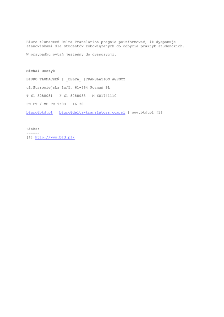 Biuro tłumaczeń Delta Translation pragnie poinformować, iż dysponuje stanowiskami dla studentów zobowiązanych do odbycia praktyk studenckich. W przypadku pytań jesteśmy do dyspozycji. Michal Roszyk BIURO TŁUMACZEŃ | _DELTA_ |TRANSLATION AGENCY ul.Starowiejska 1a/5, 61-664 Poznań PL T 61 8288081 | F 61 8288083 | M 601741110 PN-PT / MO-FR 9:00 - 16:30 [email protected] | [email protected] | www.btd.pl [1] Links: -----[1] http://www.btd.pl/