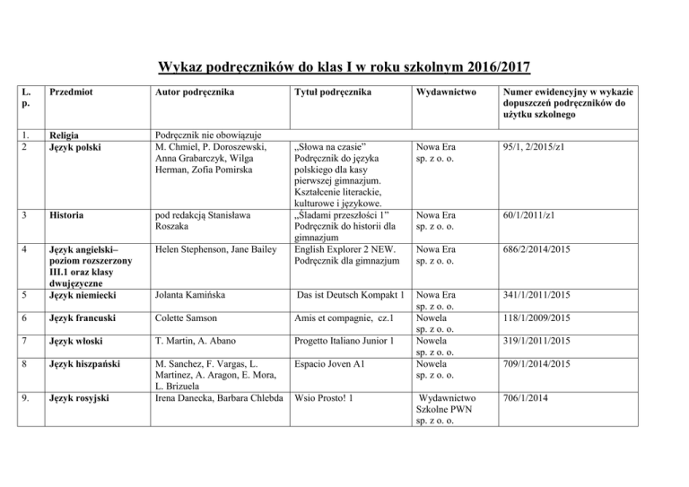 Wykaz podręczników do klas I w roku szkolnym 2016