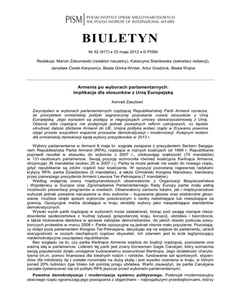 BIULETYN Nr 52 (917) 23 maja 2012 © PISM Redakcja: Marcin Zaborowski (redaktor naczelny), Katarzyna Staniewska (sekretarz redakcji), Jarosław Ćwiek-Karpowicz, Beata Górka-Winter, Artur Gradziuk, Beata Wojna Armenia po wyborach parlamentarnych: implikacje dla stosunków z Unią Europejską Konrad Zasztowt Zwycięstwo w wyborach parlamentarnych rządzącej Republikańskiej Partii Armenii oznacza, że priorytetem ormiańskiej polityki zagranicznej pozostanie rozwój stosunków z Unią Europejską. Jego wyrazem są postępy w negocjacjach umowy stowarzyszeniowej z Unią. Obecna elita rządząca nie podejmuje jednak poważnych reform ustrojowych, co będzie utrudniać dalsze zbliżenie Armenii do UE. Unijna polityka wobec rządu w Erywaniu powinna objąć przede wszystkim wsparcie procesów demokratyzacji i modernizacji. Kolejnym testem dla ormiańskiej demokracji będą wybory prezydenckie w 2013 r. Wybory parlamentarne w Armenii 6 maja br. wygrała związana z prezydentem Serżem Sargsjanem Republikańska Partia Armenii (RPA), rządząca w różnych koalicjach od 1999 r. Republikanie poprawili rezultat w stosunku do wyborów z 2007 r., zdobywając większość (70 mandatów) w 131-osobowym parlamencie. Swoją pozycję wzmocniła również koalicyjna Kwitnąca Armenia, otrzymując 36 mandatów (wobec 25 w 2007 r.). Partia ta może jednak nie wejść do nowego rządu, gdyż republikanie są zdolni rządzić bez koalicjanta. W opozycji pozostaną najpewniej radykalni krytycy RPA: partia Dziedzictwo (5 mandatów), a także Ormiański Kongres Narodowy, kierowany przez pierwszego prezydenta Armenii Lewona Ter-Petrosjana (7 mandatów). Według wstępnej oceny międzynarodowych obserwatorów z Organizacji Bezpieczeństwa i Współpracy w Europie oraz Zgromadzenia Parlamentarnego Rady Europy partie miały pełną możliwość prezentacji programów w mediach. Obserwatorzy zarówno lokalni, jak i międzynarodowi wyliczali jednak poważne naruszenia w dniu wyborów – kupowanie głosów oraz wielokrotne głosowanie, możliwe dzięki spisom wyborców poszerzonym o osoby nieistniejące lub mieszkające za granicą. Opozycyjne media działające w kraju określiły wybory jako niespełniające standardów demokratycznych. Wysoki wynik partii rządzącej w wyborach może zaskakiwać, biorąc pod uwagę rosnące niezadowolenie społeczeństwa z trudnej sytuacji gospodarczej kraju, korupcji, ubóstwa i bezrobocia, a także blokowania śledztwa w sprawie zabójstw demonstrantów, do jakich doszło podczas powyborczych protestów w marcu 2008 r. Partie opozycyjne są jednak równie mało popularne. Pozostający dotąd poza parlamentem Kongres Ter-Petrosjana, decydując się na wejście do parlamentu, utracił wiarygodność w oczach niechętnych rządowi obywateli. Ich zdaniem jest to krok legitymizujący niedemokratyczne zwycięstwo republikanów. Bez względu na to, czy partia Kwitnąca Armenia wejdzie do koalicji rządzącej, pozostanie ona ważną siłą w parlamencie. Liderem tej partii jest znany biznesmen Gagik Carukjan, który wzmacnia swoją popularność dzięki umiejętnie budowanemu wizerunkowi filantropa. Jego działalność charytatywna (m.in. pomoc finansowa dla biednych rodzin i rolników, fundowanie sal sportowych, stypendiów dla młodzieży itp.) została rozwinięta na dużą skalę i jest wysoko oceniana w kraju, w którym ponad 20% ludności żyje blisko lub poniżej progu ubóstwa. Warto zauważyć, że partia Carukjana zaczęła dystansować się od polityki RPA jeszcze przed wyborami parlamentarnymi. Powolna demokratyzacja i modernizacja systemu politycznego. Potencjał modernizacyjny obecnego rządu ograniczają jego powiązania z oligarchami – najbogatszymi przedsiębiorcami, którzy 2681 Polski Instytut Spraw Międzynarodowych niejednokrotnie sami stanowią część ormiańskiej elity politycznej. Wśród ważnych i trudnych zadań stojących przed obecnymi władzami pozostają m.in.: walka z korupcją, reformy wymiaru sprawiedliwości, systemu podatkowego i samorządu, jak również rozwój obszarów wiejskich, stworzenie warunków prawno-instytucjonalnych przyjaznych dla biznesu czy przyciągnięcie inwestycji zagranicznych. Istotnymi problemami są ponadto ochrona praw człowieka i zagwarantowanie swobód obywatelskich. Środowiska opiniotwórcze, bez względu na opcję polityczną, zwracają uwagę na znaczną poprawę w obszarze wolności słowa za prezydentury Serża Sargsjana. Wskazują także na nowe możliwości organizowania sprzeciwu społecznego z wykorzystaniem technologii internetowej. Podkreślają, że wykształcone na Zachodzie kadry urzędnicze średniego szczebla w najbliższych latach będą odgrywać coraz ważniejszą rolę w administracji rządowej. Dojście do władzy nowego pokolenia utożsamiającego się z zachodnimi standardami demokratycznymi i wolnorynkowymi stwarza nadzieje na przeprowadzenie w Armenii realnych zmian oraz zakończenie obecnej stagnacji. Implikacje wyborów dla stosunków Armenii z UE. Dla rządu w Erywaniu uznanie wyborów przez obserwatorów międzynarodowych za spełniające standardy demokratyczne oznacza kontynuację dobrych stosunków z UE i rozpoczętych w czerwcu 2010 r. negocjacji umowy stowarzyszeniowej. Obecnie trwa ich końcowa faza: większość rozdziałów została już zamknięta, w tym kluczowe, dotyczące współpracy w sferze gospodarczej i finansowej. Szczególnie ważnym etapem zbliżenia z UE, z punktu widzenia strony ormiańskiej, ma być przewidywane na przyszły rok podpisanie umowy co do ułatwień wizowych dla obywateli Armenii podróżujących do państw unijnych. Liberalizacja procedur wydawania wiz będzie miała duże znaczenie dla społeczeństwa ormiańskiego, dla którego kraje UE są jednym z głównych celów wyjazdów biznesowych, zarobkowych, a także najchętniej wybieranym miejscem studiów za granicą. Obecnie rząd w Erywaniu rozpoczął także proces negocjacji umowy o pogłębionej str