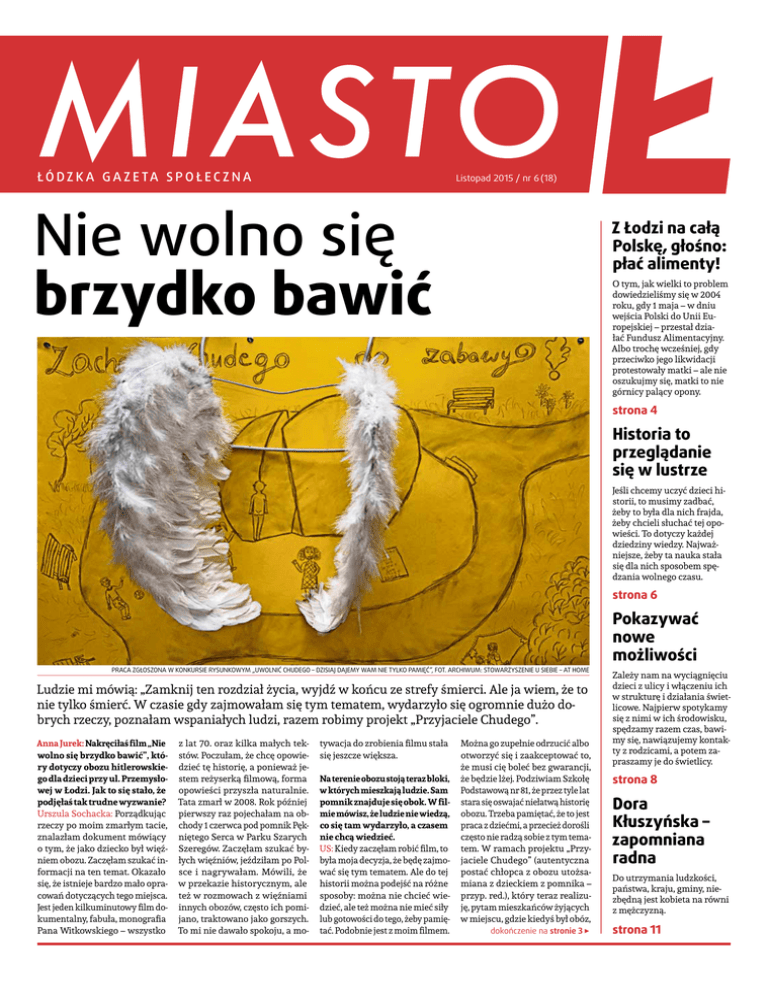 ŁÓ D Z K A G A Z E TA S P O Ł E C Z N A Listopad 2015 / nr 6 (18) Nie wolno się brzydko bawić Z Łodzi na całą Polskę, głośno: płać alimenty! O tym, jak wielki to problem dowiedzieliśmy się w 2004 roku, gdy 1 maja – w dniu wejścia Polski do Unii Eu ropejskiej – przestał dzia łać Fundusz Alimentacyjny. Albo trochę wcześniej, gdy przeciwko jego likwidacji protestowały matki – ale nie oszukujmy się, matki to nie górnicy palący opony. strona 4 Historia to przeglądanie się w lustrze Jeśli chcemy uczyć dzieci hi storii, to musimy zadbać, żeby to była dla nich frajda, żeby chcieli słuchać tej opo wieści. To dotyczy każdej dziedziny wiedzy. Najważ niejsze, żeby ta nauka stała się dla nich sposobem spę dzania wolnego czasu. strona 6 Pokazywać nowe możliwości PRACA ZGŁOSZONA W KONKURSIE RYSUNKOWYM „UWOLNIĆ CHUDEGO – DZISIAJ DAJEMY WAM NIE TYLKO PAMIĘĆ”, FOT. ARCHIWUM: STOWARZYSZENIE U SIEBIE – AT HOME Ludzie mi mówią: „Zamknij ten rozdział życia, wyjdź w końcu ze strefy śmierci. Ale ja wiem, że to nie tylko śmierć. W czasie gdy zajmowałam się tym tematem, wydarzyło się ogromnie dużo do brych rzeczy, poznałam wspaniałych ludzi, razem robimy projekt „Przyjaciele Chudego”. Anna Jurek: Nakręciłaś film „Nie wolno się brzydko bawić”, który dotyczy obozu hitlerowskiego dla dzieci przy ul. Przemysłowej w Łodzi. Jak to się stało, że podjęłaś tak trudne wyzwanie? Urszula Sochacka: Porządkując rzeczy po moim zmarłym tacie, znalazłam dokument mówiący o tym, że jako dziecko był więź niem obozu. Zaczęłam szukać in formacji na ten temat. Okazało się, że istnieje bardzo mało opra cowań dotyczących tego miejsca. Jest jeden kilkuminutowy film do kumentalny, fabuła, monografia Pana Witkowskiego – wszystko z lat 70. oraz kilka małych tek stów. Poczułam, że chcę opowie dzieć tę historię, a ponieważ je stem reżyserką filmową, forma opowieści przyszła naturalnie. Tata zmarł w 2008. Rok później pierwszy raz pojechałam na ob chody 1 czerwca pod pomnik Pęk niętego Serca w Parku Szarych Szeregów. Zaczęłam szukać by łych więźniów, jeździłam po Pol sce i nagrywałam. Mówili, że w przekazie historycznym, ale też w rozmowach z więźniami innych obozów, często ich pomi jano, traktowano jako gorszych. To mi nie dawało spokoju, a mo tywacja do zrobienia filmu stała się jeszcze większa. Na terenie obozu stoją teraz bloki, w których mieszkają ludzie. Sam pomnik znajduje się obok. W filmie mówisz, że ludzie nie wiedzą, co się tam wydarzyło, a czasem nie chcą wiedzieć. US: Kiedy zaczęłam robić film, to była moja decyzja, że będę zajmo wać się tym tematem. Ale do tej historii można podejść na różne sposoby: można nie chcieć wie dzieć, ale też można nie mieć siły lub gotowości do tego, żeby pamię tać. Podobnie jest z moim filmem. Można go zupełnie odrzucić albo otworzyć się i zaakceptować to, że musi cię boleć bez gwarancji, że będzie lżej. Podziwiam Szkołę Podstawową nr 81, że przez tyle lat stara się oswajać niełatwą historię obozu. Trzeba pamiętać, że to jest praca z dziećmi, a przecież dorośli często nie radzą sobie z tym tema tem. W ramach projektu „Przy jaciele Chudego” (autentyczna postać chłopca z obozu utożsa miana z dzieckiem z pomnika – przyp. red.), który teraz realizu ję, pytam mieszkańców żyjących w miejscu, gdzie kiedyś był obóz, dokończenie na stronie 3 Zależy nam na wyciągnięciu dzieci z ulicy i włączeniu ich w strukturę i działania świet licowe. Najpierw spotykamy się z nimi w ich środowisku, spędzamy razem czas, bawi my się, nawiązujemy kontak ty z rodzicami, a potem za praszamy je do świetlicy. strona 8 Dora Kłuszyńska – zapomniana radna Do utrzymania ludzkości, państwa, kraju, gminy, nie zbędną jest kobieta na równi z mężczyzną. strona 11 2 listopad 2015 • www.miastol.pl MIASTO Ł wstępniak Wolność, solidarność, empatia Oddajemy w Wasze ręce pierwszy numer Miasta Ł po wyborach. Po wstał tak samo jak inne: zbieranie tekstów (o tematyce społecznej, kul turalnej, politycznej), następnie re dakcja, korekta, skład i druk. Niby nic się nie zmieniło. Badam zatem, czy żyje mi się jakoś inaczej. Wstaję rano, łazienka, dziecko, pies, szko ła, komputer, obiad, komputer… Na razie nie widać zasadniczych zmian. Czy zatem można spokojnie powie dzieć: „Polacy, nic się nie stało”? Czy nie ma żadnego znaczenia, że do Sej mu weszli także ludzie, których po glądy bezsprzecznie można uznać za faszystowskie? Że znaczna część naszych posłów uważa, że prawdzi wy Polak, to biały mężczyzna, ka tolik? Że najpewniej w ciągu naj bliższych lat nic się nie zmieni na lepsze w kwestii praw kobiet, osób ubogich, nieheteroseksualnych, imi grantów, ateistów, wyznawców religii różnych niż jedyna słuszna i wszel kich innych, którzy w jakikolwiek sposób odstają od większości? Ja je stem zaniepokojona. Mimo iż wielu komentatorów i analityków uspoka ja, że żadnych radykalnych zmian nie będzie, to ja właśnie o ten brak zmian martwię się najbardziej. Bo w Polsce potrzeba bardzo głębokiej świadomościowej zmiany, polegają cej na zrozumieniu, że świat to róż norodność, na dostrzeganiu inno ści. Wolność, solidarność, empatia to wyznaczniki dobrego, obywatel skiego społeczeństwa. Zaufanie spo łeczne jest nam naprawdę potrzebne do rozwoju. Obawiam się, że obecnie rządzący nie zechcą się ze mną zgo dzić. I z tych obaw zrodziła nam się ostatnio w redakcji bardzo ważna dyskusja o wartościach, które stoją za naszą pracą. ALEKSANDRA DULAS Drodzy Czytelnicy, bez względu na to, kto nami rządzi, będziemy promo wać solidarność społeczną, oddawać głos grupom wykluczanym i stać za wsze po stronie słabszego. Będziemy pisać o tym wszystkim, co zbliża nas choćby o milimetr do spo