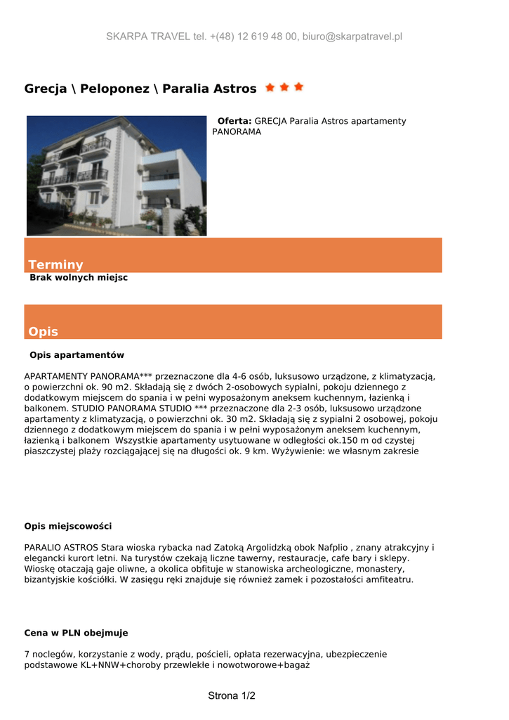 SKARPA TRAVEL tel. +(48) 12 619 48 00, [email protected] Grecja \ Peloponez \ Paralia Astros Oferta: GRECJA Paralia Astros apartamenty PANORAMA Terminy Brak wolnych miejsc Opis Opis apartamentów APARTAMENTY PANORAMA*** przeznaczone dla 4-6 osób, luksusowo urządzone, z klimatyzacją, o powierzchni ok. 90 m2. Składają się z dwóch 2-osobowych sypialni, pokoju dziennego z dodatkowym miejscem do spania i w pełni wyposażonym aneksem kuchennym, łazienką i balkonem. STUDIO PANORAMA STUDIO *** przeznaczone dla 2-3 osób, luksusowo urządzone apartamenty z klimatyzacją, o powierzchni ok. 30 m2. Składają się z sypialni 2 osobowej, pokoju dziennego z dodatkowym miejscem do spania i w pełni wyposażonym aneksem kuchennym, łazienką i balkonem Wszystkie apartamenty usytuowane w odległości ok.150 m od czystej piaszczystej plaży rozciągającej się na długości ok. 9 km. Wyżywienie: we własnym zakresie Opis miejscowości PARALIO ASTROS Stara wioska rybacka nad Zatoką Argolidzką obok Nafplio , znany atrakcyjny i elegancki kurort letni. Na turystów czekają liczne tawerny, restauracje, cafe bary i sklepy. Wioskę otaczają gaje oliwne, a okolica obfituje w stanowiska archeologiczne, monastery, bizantyjskie kościółki. W zasięgu ręki znajduje się również zamek i pozostałości amfiteatru. Cena w PLN obejmuje 7 noclegów, korzystanie z wody, prądu, pościeli, opłata rezerwacyjna, ubezpieczenie podstawowe KL+NNW+choroby przewlekłe i nowotworowe+bagaż Strona 1/2 SKARPA TRAVEL tel. +(48) 12 619 48 00, [email protected] Zniżki 1. Dziecko 0- 2 lat bez świadczeń płaci tylko 50 zł/7 dni Uwagi organizatora 1. Doba hotelowa rozpoczyna się o godz 14:00 i kończy o godz 9:00. 2. Na wyjazd potrzebny ważny paszport lub dowód osobisty. Praktyczne informacje Najbliższa placówka dyplomatyczna: Konsulat RP w Grecji 78 Tsimiski Str. Saloniki 546-22 Tel. 00 302 310 288 205 Obowiązująca waluta: 1 EUR Czas wschodnioeuropejski + 1 godzina Strona 2/2 Powered by TCPDF (www.tcpdf.org)