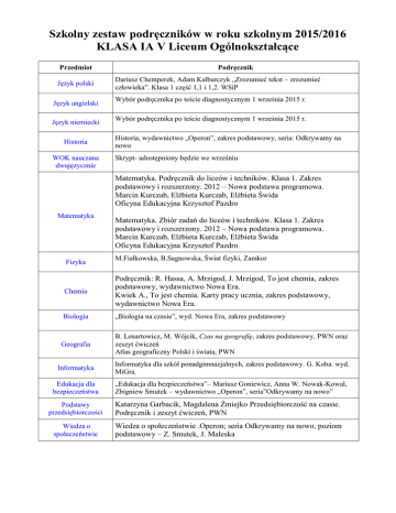 Szkolny zestaw podręczników w roku szkolnym 2015/2016 KLASA IA V Liceum Ogólnokształcące Przedmiot Język polski Język angielski Język niemiecki Historia WOK nauczana dwujęzycznie Podręcznik Dariusz Chemperek, Adam Kalbarczyk „Zrozumieć tekst – zrozumieć człowieka”. Klasa 1 część 1,1 i 1,2. WSiP Wybór podręcznika po teście diagnostycznym 1 września 2015 r. Wybór podręcznika po teście diagnostycznym 1 września 2015 r. Historia, wydawnictwo „Operon”, zakres podstawowy, seria: Odkrywamy na nowo Skrypt- udostępniony będzie we wrześniu Matematyka. Podręcznik do liceów i techników. Klasa 1. Zakres podstawowy i rozszerzony. 2012 – Nowa podstawa programowa. Marcin Kurczab, Elżbieta Kurczab, Elżbieta Świda Oficyna Edukacyjna Krzysztof Pazdro Matematyka Fizyka Matematyka. Zbiór zadań do liceów i techników. Klasa 1. Zakres podstawowy i rozszerzony. 2012 – Nowa podstawa programowa. Marcin Kurczab, Elżbieta Kurczab, Elżbieta Świda Oficyna Edukacyjna Krzysztof Pazdro M.Fiałkowska, B.Sagnowska, Świat fizyki, Zamkor Chemia Podręcznik: R. Hassa, A. Mrzigod, J. Mrzigod, To jest chemia, zakres podstawowy, wydawnictwo Nowa Era. Kwiek A., To jest chemia. Karty pracy ucznia, zakres podstawowy, wydawnictwo Nowa Era. Biologia „Biologia na czasie”, wyd. Nowa Era, zakres podstawowy Geografia B. Lenartowicz, M. Wójcik, Czas na geografię, zakres podstawowy, PWN oraz zeszyt ćwiczeń Atlas geograficzny Polski i świata, PWN Informatyka Informatyka dla szkół ponadgimnazjalnych, zakres podstawowy. G. Koba. wyd. MiGra. Edukacja dla bezpieczeństwa „Edukacja dla bezpieczeństwa”– Mariusz Goniewicz, Anna W. Nowak-Kowal, Zbigniew Smutek – wydawnictwo „Operon”, seria”Odkrywamy na nowo” Podstawy przedsiębiorczości Katarzyna Garbacik, Magdalena Żmiejko Przedsiębiorczość na czasie. Podręcznik i zeszyt ćwiczeń, PWN Wiedza o społeczeństwie Wiedza o społeczeństwie .Operon; seria Odkrywamy na nowo, poziom podstawowy – Z. Smutek, J. Maleska Szkolny zestaw podręczników w roku szkolnym 2015/2016 KLASA IB V Liceum Ogólnokształcące Przedmiot Język polski Język angielski Język niemiecki Historia WOK Podręcznik Dariusz Chemperek, Adam Kalbarczyk „Zrozumieć tekst – zrozumieć człowieka”. Klasa 1 część 1,1 i 1,2. WSiP Wybór podręcznika po teście diagnostycznym 1 września 2014 r. Wybór podręcznika po teście diagnostycznym 1 września 2014 r. „Odkrywamy na nowo” – zakres podstawowy, wyd „Operon”(podręcznik do kl 1) „Spotkania z kulturą” – nowa podstawa programowa, wyd. Nowa Era Matematyka. Podręcznik do liceów i techników. Klasa 1. Zakres podstawowy i rozszerzony. 2012 – Nowa podstawa programowa. Marcin Kurczab, Elżbieta Kurczab, Elżbieta Świda Oficyna Edukacyjna Krzysztof Pazdro Matematyka Matematyka. Zbiór zadań do liceów i techników. Klasa 1. Zakres podstawowy i rozszerzony. 2012 – Nowa podstawa programowa. Marcin Kurczab, Elżbieta Kurczab, Elżbieta Świda Oficyna Edukacyjna Krzysztof Pazdro Fizyka Chemia M.Fiałkowska, B.Sagnowska, Świat fizyki, Zamkor Podręcznik: R. Hassa, A. Mrzigod, J. Mrzigod, To jest chemia, zakres podstawowy, wydawnictwo Nowa Era. Kwiek A., To jest chemia. Karty pracy ucznia, zakres podstawowy, wydawnictwo Nowa Era. Biologia „Biologia na czasie”, poziom podstawowy, Nowa Era. Geografia B. Lenartowicz, M. Wójcik, Czas na geografię, zakres podstawowy, PWN oraz zeszyt ćwiczeń Atlas geograficzny Polski i świata PWN. Informatyka Informatyka dla szkół ponadgimnazjalnych, zakres podstawowy. G. Koba. wyd. wyd. MiGra. Edukacja dla bezpieczeństwa „Edukacja dla bezpieczeństwa”– Mariusz Goniewicz, Anna W. Nowak-Kowal, Zbigniew Smutek – wydawnictwo „Operon”, seria”Odkrywamy na nowo” Podstawy przedsiębiorczości Wiedza o społeczeństwie Katarzyna Garbacik, Magdalena Żmiejko Przedsiębiorczość na czasie. Podręcznik i zeszyt ćwiczeń, PWN Wiedza o społeczeństwie .Operon; seria Odkrywamy na nowo, poziom podstawowy Szkolny zestaw podręczników w roku szkolnym 2015/2016 KLASA IC V Liceum Ogólnokształcące Przedmiot Język polski Język angielski Język niemiecki Podręcznik Dariusz Chemperek, Adam Kalbarczyk „Zrozumieć tekst – zrozumieć człowieka”. Klasa 1 część 1,1 i 1,2. WSiP Wybór podręcznika po teście diagnostycznym 1 września 2014 r. Wybór podręcznika po teście diagnostycznym 1 września 2014 r. Historia Historia, wydawnictwo „Operon”, zakres podstawowy; seria Odkrywamy na nowo WOK „Spotkania z kulturą” – nowa podstawa programowa, wyd. Nowa Era Matematyka. Podręcznik do liceów i techników. Klasa 1. Zakres podstawowy i rozszerzony. 2012 – Nowa podstawa programowa. Marcin Kurczab, Elżbieta Kurczab, Elżbieta Świda Oficyna Edukacyjna Krzysztof Pazdro Matematyka Matematyka. Zbiór zadań do liceów i techników. Klasa 1. Zakres podstawowy i rozszerzony. 2012 – Nowa podstawa programowa. Marcin Kurczab, Elżbieta Kurczab, Elżbieta Świda Oficyna Edukacyjna Krzysztof Pazdro. Fizyka Chemia Biologia Geografia M.Fiałkowska, B.Sagnowska, Świat fizyki, Zamkor Podręcznik: R. Hassa, A. Mrzigod, J. Mrzigod, To jest chemia, zakres podstawowy, wydawnictwo Nowa Era. Kwiek A., To jest chemia. Karty pracy ucznia, zakres podstawowy, wydawnictwo Nowa Era. Nowa Era - Biologia na czasie - zakres podstawowy, E. Bonar, W. Krzeszowiec-Jeleń, S. Czchorowski Operon - Ciekawi świata Biologia 1 podręcznik zakres rozszerzonySebastian Grabowski, Agata Kurek B. Lenartowicz, M. Wójcik, „Czas na geografię” zakres podstawowy, PWN oraz zeszyt ćwiczeń Atlas geograficzny Polski i świata PWN. Informatyka Informatyka dla szkół ponadgimnazjalnych, zakres podstawowy. G. Koba. wyd. MiGra. Edukacja dla bezpieczeństwa „Edukacja dla bezpieczeństwa”– Mariusz Goniewicz, Anna W. Nowak-Kowal, Zbigniew Smutek – wydawnictwo „Operon”, seria”Odkrywamy na nowo” Katarzyna Garbacik, Magdalena Żmiejko Przedsiębiorczo