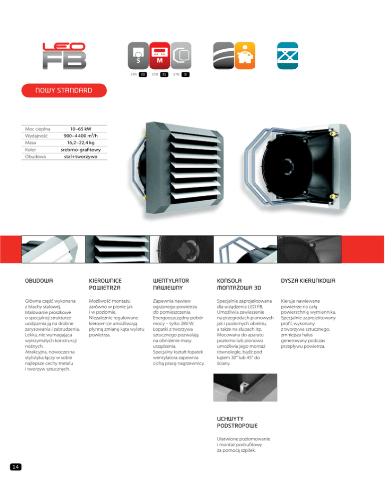 STR 30 STR 31 STR 8 NOWY STANDARD Moc cieplna Wydajność Masa Kolor Obudowa 10–65 kW 900–4 400 m3/h 16,2–22,4 kg srebrno-grafitowy stal+tworzywo OBUDOWA KIEROWNICE POWIETRZA WENTYLATOR NAWIEWNY KONSOLA MONTAŻOWA 3D DYSZA KIERUNKOWA Główna część wykonana z blachy stalowej. Malowanie proszkowe o specjalnej strukturze uodparnia ją na drobne zarysowania i zabrudzenia. Lekka, nie wymagająca wytrzymałych konstrukcji nośnych. Atrakcyjna, nowoczesna stylistyka łączy w sobie najlepsze cechy metalu i tworzyw sztucznych. Możliwość montażu zarówno w pionie jak i w poziomie. Niezależnie regulowane kierownice umożliwiają płynną zmianę kąta wylotu powietrza. Zapewnia nawiew ogrzanego powietrza do pomieszczenia. Energooszczędny pobór mocy – tylko 280 W. Łopatki z tworzywa sztucznego pozwalają na obniżenie masy urządzenia. Specjalny kształt łopatek wentylatora zapewnia cichą pracę nagrzewnicy. Specjalnie zaprojektowana dla urządzenia LEO FB. Umożliwia zawieszenie na przegrodach pionowych jak i poziomych obiektu, a także na słupach itp. Mocowana do aparatu poziomo lub pionowo umożliwia jego montaż równolegle, bądź pod kątem 30° lub 45° do ściany. Kieruje nawiewane powietrze na całą powierzchnię wymiennika. Specjalnie zaprojektowany profil, wykonany z tworzywa sztucznego, zmniejsza hałas generowany podczas przepływu powietrza. UCHWYTY PODSTROPOWE Ułatwione poziomowanie i montaż podsufitowy za pomocą szpilek. 14 Tp1 °C LEO FB 25 V = 4 400 m3/h PT Qw ∆pw Tp2 kW l/h kPa °C 0 5 10 15 20 25,4 23,5 21,6 19,7 17,9 1121 1037 953 871 790 11,7 10,1 8,7 7,4 6,2 16,0 20,0 24,1 28,1 32,0 0 5 10 15 20 21,6 19,7 17,9 16,0 14,2 950 867 785 704 624 8,9 7,5 6,3 5,1 4,1 13,6 17,6 21,6 25,6 29,6 0 5 10 15 20 17,8 15,9 14,1 12,3 10,5 779 697 617 537 457 6,4 5,2 4,2 3,2 2,4 11,2 15,2 19,2 23,1 27,0 LEO FB 45 V = 4100 m3/h PT Qw ∆pw Tp2 kW l/h kPa °C Tw1/Tw2 = 90/70 46,8 2067 17,5 31,6 43,3 1911 15,2 34,7 39,8 1758 13,0 37,8 36,4 1607 11,0 40,9 33,0 1459 9,2 43,9 Tw1/Tw2 = 80/60 40,1 1762 13,4 27,1 36,6 1610 11,4 30,2 33,2 1459 9,5 33,2 29,9 1312 7,8 36,2 26,5 1166 6,3 39,2 Tw1/Tw2 = 70/50 33,3 1459 9,8 22,5 29,9 1309 8,1 25,6 26,6 1162 6,5 28,6 23,2 1017 5,1 31,5 20,0 874 3,9 34,4 640 LEO FB 65 V = 3 900 m3/h PT Qw ∆pw Tp2 kW l/h kPa °C Zasilanie Pobór mocy Pobór prądu IP/klasa izolacji Poziom cisnienia akustycznego 64,6 60,2 55,4 50,1 46,2 2660 2464 2272 2084 1899 36,8 32,0 27,6 23,6 19,9 46,1 48,4 50,7 52,9 55,1 Poziom ciśnienia akustycznego w odległości 5m od urządzenia przy max wydajności wentylatora. 56,1 51,3 46,7 42,1 37,6 2288 2097 1909 1725 1543 28,7 24,5 20,7 17,2 14,1 39,8 42,1 44,3 46,5 48,6 Dane techniczne dotyczące zasilania innymi paramerami wody dostepne w biurze handlowym. 47,1 42,5 37,9 33,4 28,9 1919 1731 1547 1366 1187 21,5 17,9 14,6 11,6 9,1 33,4 35,6 37,8 39,9 42,0 Maks. temp wody grzewczej Maks. ciśnienie robocze V PT Tp1 Tp2 – – – – Tw1 – Tw2 – Qw – Δpw – 230 V/50 Hz 280 W 1,2 A 54/F 50 dB(A) 130°C 1,6 MPa przepływ powietrza moc grzewcza temperatura powietrza na wlocie do aparatu temperatura powietrza na wylocie z aparatu temperatura wody na wejściu wymiennika temperatura wody na wyjściu wymiennika strumień przepływu wody grzewczej spadek ciśnienia wody w wymienniku A B min. 0,3m 2,5–8 m 2,5–10 m 600 min. 0,3m ¾˝ L Masa [kg] urządzenia urządzenia napełnionego wodą Wymiary [mm] A B Zasięg strumienia powietrza [m] L FB 25 16,2 17,2 FB 25 600 350 FB 25 26 FB 45 17,6 19,6 FB 45 600 350 FB 45 24 FB 65 19,7 22,4 FB 65 620 370 FB 65 22 L - dla prędkości granicznej 0,5 m/s i temp. powietrza 20°C 15 ZASTOSOWANIE Nagrzewnice wodne LEO FB są idealnym rozwiązaniem dla użytkowników, którzy potrzebują wydajnego urządzenia grzewczego, nie rezygnując przy tym z walorów estetycznych. Do ich budowy użyto najwyższej jakości podzespołów renomowanych, europejskich producentów. Nowoczesny wygląd nagrzewnic LEO FB oraz bardzo dobre parametry techniczne pretendują je do montażu w takich obiektach jak: • hale przemysłowe • warsztaty • salony samochodowe • magazyny • pawilony • obiekty sportowe • obiekty sakralne, itp.