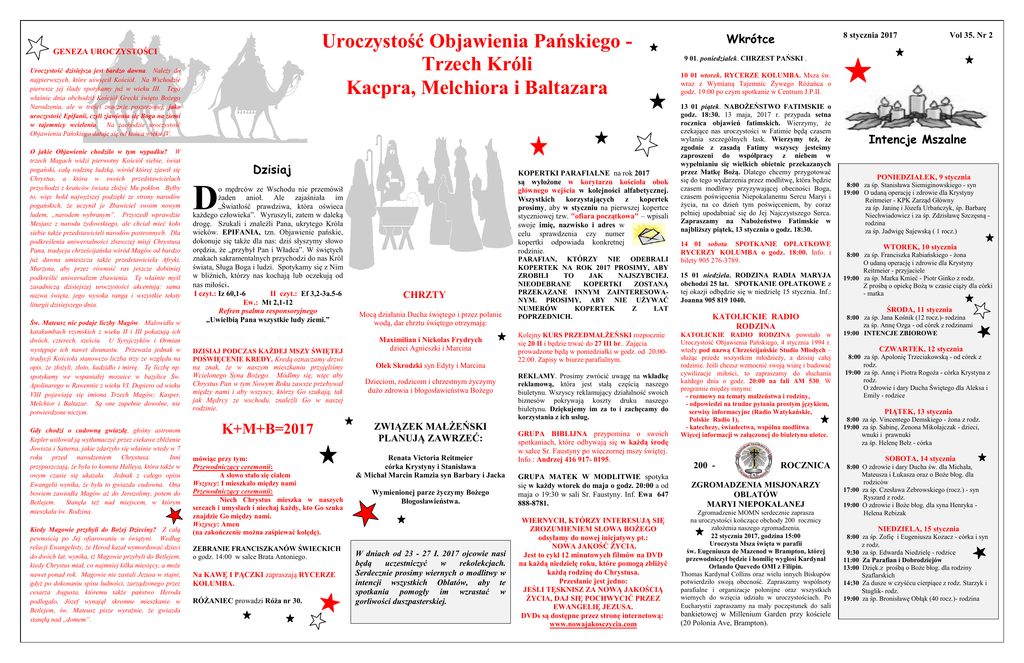 Uroczystość Objawienia Pańskiego Trzech Króli Kacpra, Melchiora i Baltazara GENEZA UROCZYSTOŚCI Uroczystość dzisiejsza jest bardzo dawna. Należy do najpierwszych, które uświęcił Kościół. Na Wschodzie pierwsze jej ślady spotykamy już w wieku III. Tego właśnie dnia obchodził Kościół Grecki święto Bożego Narodzenia, ale w treści znacznie poszerzonej: jako uroczystość Epifanii, czyli zjawienia się Boga na ziemi w tajemnicy wcielenia. Na zachodzie uroczystość Objawienia Pańskiego datuje się od końca wieku IV. O jakie Objawienie chodziło w tym wypadku? W trzech Magach widzi pierwotny Kościół siebie, świat pogański, całą rodzinę ludzką, wśród której zjawił się Chrystus, a która w swoich przedstawicielach przychodzi z krańców świata złożyć Mu pokłon. Byłby to, więc hołd najwyższej podzięki ze strony narodów pogańskich, że uczynił je Zbawiciel swoim nowym ludem, „narodem wybranym”. Przyszedł wprawdzie Mesjasz z narodu żydowskiego, ale chciał mieć koło siebie także przedstawicieli narodów postronnych. Dla podkreślenia uniwersalności zbawczej misji Chrystusa Pana, tradycja chrześcijańska wśród Magów od bardzo już dawna umieszcza także przedstawiciela Afryki, Murzyna, aby przez równość ras jeszcze dobitniej podkreślić uniwersalizm zbawienia. Tę właśnie myśl zasadniczą dzisiejszej uroczystości akcentują: sama nazwa święta, jego wysoka ranga i wszystkie teksty liturgii dzisiejszego dnia. Św. Mateusz nie podaje liczby Magów. Malowidła w katakumbach rzymskich z wieku II i III pokazują ich dwóch, czterech, sześciu. U Syryjczyków i Ormian występuje ich nawet dwunastu. Przeważa jednak w tradycji Kościoła stanowczo liczba trzy ze względu na opis, że złożyli, złoto, kadzidło i mirrę. Tę liczbę np. spotykamy we wspaniałej mozaice w bazylice Św. Apolinarego w Rawennie z wieku VI. Dopiero od wieku VIII pojawiają się imiona Trzech Magów; Kasper, Melchior i Baltazar. Są one zupełnie dowolne, nie potwierdzone niczym. Gdy chodzi o cudowną gwiazdę, głośny astronom Kepler usiłował ją wytłumaczyć przez ciekawe zbliżenie Jowisza i Saturna, jakie zdarzyło się właśnie wtedy w 7 roku przed narodzeniem Chrystusa. Inni przypuszczają, że była to kometa Halleya, która także w owym czasie się ukazała. Jednak z całego opisu Ewangelii wynika, że była to gwiazda cudowna. Ona bowiem zawiodła Magów aż do Jerozolimy, potem do Betlejem. Stanęła też nad miejscem, w którym mieszkała św. Rodzina. Kiedy Magowie przybyli do Bożej Dzieciny? Z całą pewnością po Jej ofiarowaniu w świątyni. Według relacji Ewangelisty, że Herod kazał wymordować dzieci do dwóch lat, wynika, iż Magowie przybyli do Betlejem, kiedy Chrystus miał, co najmniej kilka miesięcy, a może nawet ponad rok. Magowie nie zastali Jezusa w stajni, gdyż po dokonaniu spisu ludności, zarządzonego przez cesarza Augusta, któremu także państwo Heroda podlegało, Józef wynajął skromne mieszkanie w Betlejem, św. Mateusz pisze wyrażnie, że gwiazda stanęłą nad „domem”. Dzisiaj o mędrców ze Wschodu nie przemówił żaden anioł. Ale zajaśniała im „Światłość prawdziwa, która oświeca każdego człowieka”. Wyruszyli, zatem w daleką drogę. Szukali i znaleźli Pana, ukrytego Króla wieków. EPIFANIA, tzn. Objawienie pańskie, dokonuje się także dla nas: dziś słyszymy słowo orędzia, że „przybył Pan i Władca”. W świętych znakach sakramentalnych przychodzi do nas Król świata, Sługa Boga i ludzi. Spotykamy się z Nim w bliźnich, którzy nas kochają lub oczekują od nas miłości. I czyt.: Iz 60,1-6 II czyt.: Ef 3,2-3a.5-6 Ew.: Mt 2,1-12 Refren psalmu responsoryjnego „Uwielbią Pana wszystkie ludy ziemi.” KOPERTKI PARAFIALNE na rok 2017 są wyłożone w korytarzu kościoła obok głównego wejścia w kolejności alfabetycznej. Wszystkich korzystających z kopertek prosimy, aby w styczniu na pierwszej kopertce styczniowej tzw. "ofiara początkowa" – wpisali swoje imię, nazwisko i adres w celu sprawdzenia czy numer kopertki odpowiada konkretnej rodzinie. D DZISIAJ PODCZAS KAŻDEJ MSZY ŚWIĘTEJ POŚWIĘCENIE KREDY. Kredą oznaczamy drzwi na znak, że w naszym mieszkaniu przyjęliśmy Wcielonego Syna Bożego. Módlmy się, więc aby Chrystus Pan w tym Nowym Roku zawsze przebywał między nami i aby wszyscy, którzy Go szukają, tak jak Mędrcy ze wschodu, znaleźli Go w naszej rodzinie. CHRZTY Mocą działania Ducha świętego i przez polanie wodą, dar chrztu świętego otrzymają: Maximilian i Nickolas Frydrych dzieci Agnieszki i Marcina Olek Skrodzki syn Edyty i Marcina Dzieciom, rodzicom i chrzestnym życzymy dużo zdrowia i błogosławieństwa Bożego K+M+B=2017 ZWIĄZEK MAŁŻEŃSKI PLANUJĄ ZAWRZEĆ: mówiąc przy tym: Przewodniczący ceremonii: A słowo stało się ciałem Wszyscy: I mieszkało między nami Przewodniczący ceremonii: Niech Chrystus mieszka w naszych sercach i umysłach i niechaj każdy, kto Go szuka znajdzie Go między nami. Wszyscy: Amen (na zakończenie można zaśpiewać kolędę). Renata Victoria Reitmeier córka Krystyny i Stanisława & Michał Marcin Ramzia syn Barbary i Jacka ZEBRANIE FRANCISZKANÓW ŚWIECKICH o godz. 14:00 w salce Brata Antoniego. Na KAWĘ I PĄCZKI zapraszają RYCERZE KOLUMBA. RÓŻANIEC prowadzi Róża nr 30. Wymienionej parze życzymy Bożego Błogosławieństwa. W dniach od 23 - 27 I. 2017 ojcowie nasi będą uczestniczyć w rekolekcjach. Serdecznie prosimy wiernych o modlitwy w intencji wszystkich Oblatów, aby te spotkania pomogły im wzrastać w gorliwości duszpasterskiej. PARAFIAN, KTÓRZY NIE ODEBRALI KOPERTEK NA ROK 2017 PROSIMY, ABY ZROBILI TO JAK NAJSZYBCIEJ. NIEODEBRANE KOPERTKI ZOSTANĄ PRZEKAZANE INNYM ZAINTERESOWANYM. PROSIMY, ABY NIE UŻYWAĆ NUMERÓW KOPERTEK Z LAT POPRZEDNICH. Kolejny KURS PRZEDMAŁŻEŃSKI rozpocznie się 20 II i będzie trwać do 27 III br.. Zajęcia prowadzone będą w poniedzia