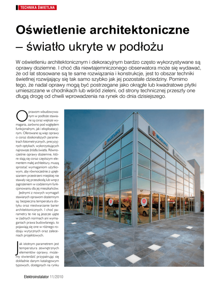 Technika świetlna Oświetlenie architektoniczne – światło ukryte w podłożu W oświetleniu architektonicznym i dekoracyjnym bardzo często wykorzystywane są oprawy doziemne. I choć dla niewtajemniczonego obserwatora może się wydawać, że od lat stosowane są te same rozwiązania i konstrukcje, jest to obszar techniki świetlnej rozwijający się tak samo szybko jak jej pozostałe dziedziny. Pomimo tego, że nadal oprawy mogą być postrzegane jako okrągłe lub kwadratowe płytki umieszczane w chodnikach lub wśród zieleni, od strony technicznej przeszły one długą drogę od chwili wprowadzenia na rynek do dnia dzisiejszego. O prawom wbudowywanym w podłoże stawiane są coraz większe wymagania, zarówno pod względem funkcjonalnym, jak i eksploatacyjnym. Oferowane są więc oprawy o coraz doskonalszych parametrach fotometrycznych, precyzyjnych optykach, wykorzystujących najnowsze źródła światła. Równocześnie oprawy doziemne, które stają się coraz częstszym elementem małej architektury, muszą sprostać wymaganiom użytkowym, aby równocześnie z upiększaniem przestrzeni miejskiej nie stawały się przeszkodą lub wręcz zagrożeniem w codziennym funkcjonowaniu dla jej mieszkańców. Jednymi z nowych wymagań stawianych oprawom doziemnym są: bezpieczna temperatura dotyku oraz niestwarzanie barier architektonicznych. I choć parametry te nie są jeszcze ujęte w żadnych normach ani wymaganiach prawa budowlanego, to pojawiają się one w różnego rodzaju wytycznych oraz zaleceniach projektowych. J ak istotnym parametrem jest temperatura zewnętrznych elementów oprawy, możemy stwierdzić przypatrując się dokładnie danym katalogowym typowych, dostępnych na rynku 2 Elektroinstalator 11/2010 opraw oświetleniowych. Zakres temperatury od 120 do nawet 180°C jest bardzo często spotykany dla opraw wykorzystujących żarowe lub wyładowcze źródła wnętrzne elementy ich obudów bezpiecznej temperatury dotyku. Ta graniczna wartość temperatury określona została jako 75°C. Oprawami spełniającymi te kryteria są reflektory i naświetlacze z oferty produktowej firmy ELETTRONICA ITALIANA z rodziny Olodum Cool. Ich specjalna konstrukcja oraz zastosowane materiały zapewniają nieprzekraczanie granicy 75°C nawet przy zastosowaniu 150 W lamp wyładowczych. K światła. Biorąc pod uwagę stosowanie tego rodzaju opraw w obrębie ciągów komunikacyjnych, wnętrz publicznych czy ogólno dostępnych terenów zewnętrznych, narażenie na kontakt ludzi z urządzeniami technicznymi o tak wysokiej temperaturze pracy jest bardzo duże. W celu wyeliminowania ryzyka oparzenia ludzi przez oprawy doziemne opracowywane są różne konstrukcje zapewniające nieprzekraczanie przez ze- olejnym problemem, który jest związany z wykorzysty waniem opraw wbudowanych w podłoże, są tworzone przez nie bariery architektoniczne w ciągach komunikacyjnych. Choć problem ten nie jest zauważany przez większość użytkowników, bywa poważnym kłopotem dla osób niepełnosprawnych. Nawet niewielkiej wielkości kołnierze mocujące lub pierścienie maskujące znajdujące się w typowych oprawach doziemnych mogą utrudniać poruszanie się, o czym dowiadujemy się od przedstawicieli osób niepełnosprawnych. Natomiast duże powierzchnie szklanych szyb naświetlaczy mogą powodować poślizgnięcie się. Aby usunąć tę niedogodność, ELETTRONICA ITALIANA oferuje oprawy oświetleniowe, które mogą zostać całkowicie zlicowane z podłożem oraz wyposażone w specjalne szyby antypoślizgowe. Seria profesjonalnych reflektorów i naświetlaczy Olodum Full Glass oraz oprawy dekoracyjne TYLE spełnią wymagania nawet najbardziej wymagających projektantów, zapewniając równocześnie bezpieczeństwo użytkownikom przestrzeni, w których zostały zamocowane. Projektując nowoczesne oświetlenie z wykorzystaniem opraw doziemnych warto już dziś wziąć po uwagę zalecenia i wytyczne, które niedługo mogą stać się obowiązującą normą lub powszechnymi oczekiwaniami inwestorów. ■ Nawet niewielkiej wielkości kołnierze mocujące lub pierścienie maskujące znajdujące się w typowych oprawach doziemnych mogą utrudniać poruszanie się, o czym dowiadujemy się od przedstawicieli osób niepełnosprawnych. Na podstawie materiałów ELETTRONICA ITALIANA Sp. z o.o. www.elektroinstalator.com.pl 3