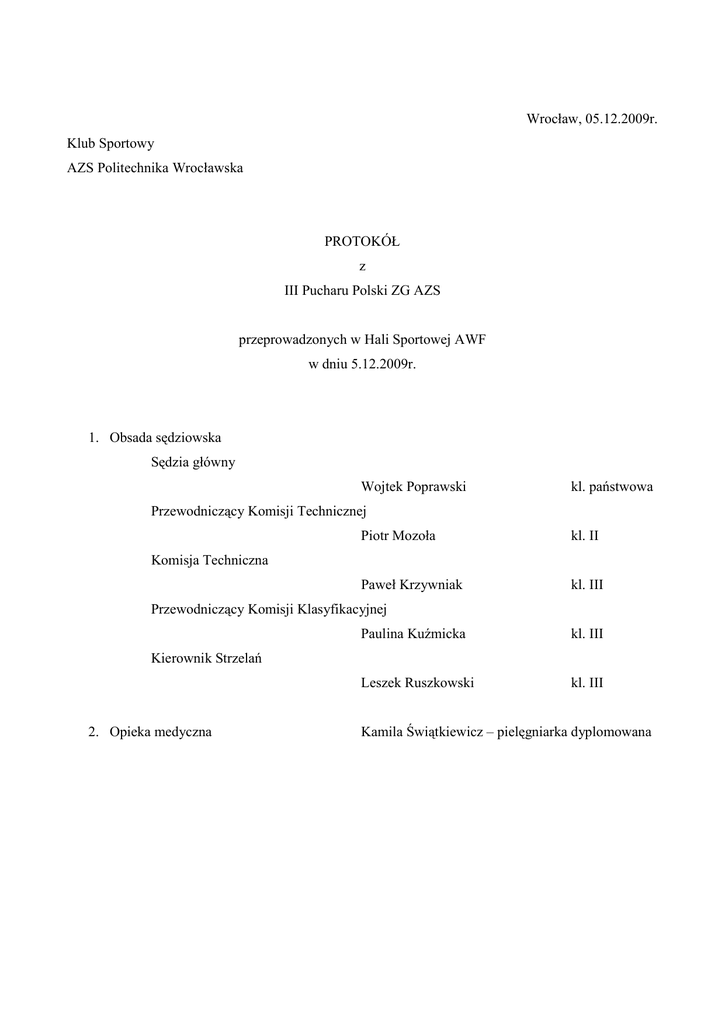 Wrocław, 05.12.2009r. Klub Sportowy AZS Politechnika Wrocławska
