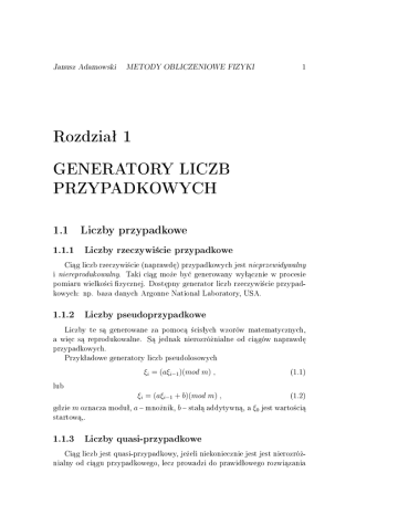 Janusz Adamowski METODY OBLICZENIOWE FIZYKI 1 Rozdziaª 1 GENERATORY LICZB PRZYPADKOWYCH 1.1 Liczby przypadkowe 1.1.1 Liczby rzeczywi±cie przypadkowe Ci¡g liczb rzeczywi±cie (naprawd¦) przypadkowych jest nieprzewidywalny i niereprodukowalny. Taki ci¡g mo»e by¢ generowany wyª¡cznie w procesie pomiaru wielko±ci zycznej. Dost¦pny generator liczb rzeczywi±cie przypadkowych: np. baza danych Argonne National Laboratory, USA. 1.1.2 Liczby pseudoprzypadkowe Liczby te s¡ generowane za pomoc¡ ±cisªych wzorów matematycznych, a wi¦c s¡ reprodukowalne. S¡ jednak nierozró»nialne od ci¡gów naprawd¦ przypadkowych. Przykªadowe generatory liczb pseudolosowych ξi = (aξi−1 )(mod m) , (1.1) ξi = (aξi−1 + b)(mod m) , (1.2) lub gdzie m oznacza moduª, a mno»nik, b staª¡ addytywn¡, a ξ0 jest warto±ci¡ startow¡,. 1.1.3 Liczby quasi-przypadkowe Ci¡g liczb jest quasi-przypadkowy, je»eli niekoniecznie jest jest nierozró»nialny od ci¡gu przypadkowego, lecz prowadzi do prawidªowego rozwi¡zania 2 1. Generatory liczb przypadkowych problemu metod¡ MC. Przykªadowy generator liczb quasi-losowych √ i(i + 1) √ i(i + 1) 2 − E[ 2 ], (1.3) 2 2 gdzie E(x) oznacza cz¦±¢ caªkowit¡ liczby x. Generator (1.3) nie wykorzystuje poprzednio obliczonych warto±ci. ξi = 1.1.4 Rozkªady prawdopodobie«stwa Unormowana g¦sto±¢ prawdopodobie«stwa %(x) speªnia warunek Z +∞ −∞ dx%(x) = 1 . (1.4) Najcz¦±ciej u»ywane rozkªady prawdopodobie«stwa: (1) jednorodny rozkªad prawdopodobie«stwa w przedziale jednostkowym ( %(x) = 1, je»eli 0 ≤ x ≤ 1 , 0, je»eli x < 0 lub x > 1 , (1.5) (2) jednorodny rozkªad prawdopodobie«stwa w przedziale dowolnym ( %(x) = 1/(b − a) , je»eli a ≤ x ≤ b , 0, je»eli x 6∈ [a, b] , (1.6) (3) rozkªad normalny (Gaussa) 1 2 2 %(x) = √ e−x /2σ , σ 2π (1.7) o warto±ci oczekiwanej < x >= 0, wariancji < x2 >= σ 2 , i odchyleniu standardowym σ . Generacja rozkªadu Gaussa Zgodnie z centralnym twierdzeniem granicznym suma du»ej liczby N niezale»nych zmiennych losowych podlega zawsze rozkªadowi normalnemu (rozkªadowi Gaussa) bez wzgl¦du na to, jakim rozkªadom podlegaj¡ poszczególne zmienne losowe, pod warunkiem, »e posiadaj¡ one sko«czone warto±ci ±rednie i wariancje, a N jest wystarczaj¡co du»e. Przykªadowy generator rozkªadu Gaussa utworzony z generatora liczb losowych o rozkªadzie jednorodnym w przedziale [−1, 1]: ξ = warto±¢ zmiennej losowej, SN sum¡ N liczb losowych ξ . Janusz Adamowski METODY OBLICZENIOWE FIZYKI *HQHUDFMDUR]NáDGX*DXVVD 1 .0 0 .8 0 .6 6 0 .4 0 .2 0 .0 -3 -2 -1 0 ξ 1 2 3 1 .0 0 .8 0 .6 6 0 .4 0 .2 0 .0 -3 -2 -1 0 ξ 1 2 3 1 .0 0 .8 0 .6 6 0 .4 0 .2 0 .0 -3 -2 -1 0 ξ 1 2 3 1 .0 0 .8 0 .6 6 0 .4 0 .2 0 .0 -3 -2 -1 0 ξ 1 2 5\V Rys. 1.1. Ilustracja generacji rozkªadu Gaussa. 3 3