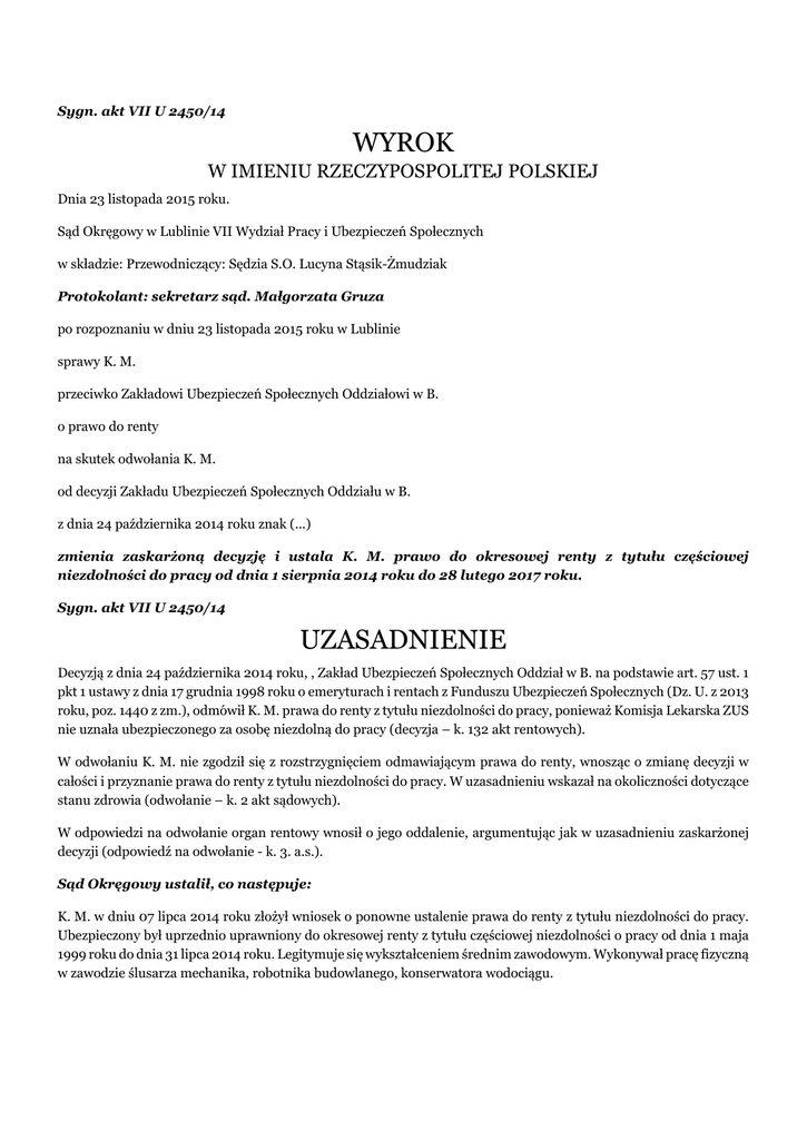 Sygn. akt VII U 2450/14 WYROK W IMIENIU RZECZYPOSPOLITEJ POLSKIEJ Dnia 23 listopada 2015 roku. Sąd Okręgowy w Lublinie VII Wydział Pracy i Ubezpieczeń Społecznych w składzie: Przewodniczący: Sędzia S.O. Lucyna Stąsik-Żmudziak Protokolant: sekretarz sąd. Małgorzata Gruza po rozpoznaniu w dniu 23 listopada 2015 roku w Lublinie sprawy K. M. przeciwko Zakładowi Ubezpieczeń Społecznych Oddziałowi w B. o prawo do renty na skutek odwołania K. M. od decyzji Zakładu Ubezpieczeń Społecznych Oddziału w B. z dnia 24 października 2014 roku znak (...) zmienia zaskarżoną decyzję i ustala K. M. prawo do okresowej renty z tytułu częściowej niezdolności do pracy od dnia 1 sierpnia 2014 roku do 28 lutego 2017 roku. Sygn. akt VII U 2450/14 UZASADNIENIE Decyzją z dnia 24 października 2014 roku, , Zakład Ubezpieczeń Społecznych Oddział w B. na podstawie art. 57 ust. 1 pkt 1 ustawy z dnia 17 grudnia 1998 roku o emeryturach i rentach z Funduszu Ubezpieczeń Społecznych (Dz. U. z 2013 roku, poz. 1440 z zm.), odmówił K. M. prawa do renty z tytułu niezdolności do pracy, ponieważ Komisja Lekarska ZUS nie uznała ubezpieczonego za osobę niezdolną do pracy (decyzja – k. 132 akt rentowych). W odwołaniu K. M. nie zgodził się z rozstrzygnięciem odmawiającym prawa do renty, wnosząc o zmianę decyzji w całości i przyznanie prawa do renty z tytułu niezdolności do pracy. W uzasadnieniu wskazał na okoliczności dotyczące stanu zdrowia (odwołanie – k. 2 akt sądowych). W odpowiedzi na odwołanie organ rentowy wnosił o jego oddalenie, argumentując jak w uzasadnieniu zaskarżonej decyzji (odpowiedź na odwołanie - k. 3. a.s.). Sąd Okręgowy ustalił, co następuje: K. M. w dniu 07 lipca 2014 roku złożył wniosek o ponowne ustalenie prawa do renty z tytułu niezdolności do pracy. Ubezpieczony był uprzednio uprawniony do okresowej renty z tytułu częściowej niezdolności o pracy od dnia 1 maja 1999 roku do dnia 31 lipca 2014 roku. Legitymuje się wykształceniem średnim zawodowym. Wykonywał pracę fizyczną w zawodzie ślusarza mechanika, robotnika budowlanego, konserwatora wodociągu. W związku z rozpoznaniem wniosku lekarz orzecznik ZUS dokonał oceny niezdolności do pracy ubezpieczonego i w orzeczeniu z dnia 31 lipca 2014 roku uznał wnioskodawcę za zdolnego do pracy. Wobec braku sprzeciwu decyzją z dnia 20.08.2014r. ZUS odmówił prawa do renty. W dniu 01.09.2014r. wnioskodawca złożył sprzeciw od orzeczenia Lekarza Orzecznika wraz z wnioskiem o przywrócenie terminu. (k. 18 akt orzeczniczych) W wyniku przywrócenia terminu do złożenia sprzeciwu przekazano sprawę do rozpatrzenia komisji lekarskiej, która po uzupełnieniu dokumentacji medycznej ostatecznie w orzeczeniu z dnia 15 października 2014 roku nie uznała wnioskodawcy za osobę niezdolną do pracy. Przedmiotowe orzeczenie zostało wydane po przeprowadzeniu bezpośredniego badania wnioskodawcy i dokonaniu analizy przedstawionej dokumentacji medycznej, tj. dokumentacji będącej przedmiotem analizy lekarza orzecznika oraz dodatkowo złożonej przez wnioskodawcę. W oparciu o powołane orzeczenie Komisji organ rentowy wydał w dniu 24 października 2014 roku zaskarżoną decyzję (okoliczności bezsporne). Celem zbadania zasadności odwołania i prawidłowości wydanej decyzji Sąd dopuścił dowód z opinii biegłych lekarzy sądowych o specjalności z zakresu chorób zakaźnych, gastrologii i neurologii (postanowienie - k. 5 a.s.). Sąd ustalił, że u ubezpieczonego występują : autoimmunologiczne zapalenie wątroby, dyspepsja, przepuklina rozworu przełykowego, napięciowy ból głowy.(opinia – k. 21 a.s.). W opinii datowanej na dzień 16 lutego 2015 roku biegli stwierdzili, że początek choroby opiniowanego przypada na 1989r., kiedy doszło do zażółcenia spojówek. W 1998r. opiniowany był hospitalizowany w Klinice (...) z rozpoznaniem ostrego wirusowego zapalenia wątroby, ale nie ustalono wówczas czynnika etiologicznego. Następnie, na podstawie badań immunologicznych, rozpoznano autoimmunologiczne zapalenie wątroby. Badany od tego czasu pozostaje na terapii sterydowej. Ostatnia hospitalizacja w Oddziale (...) w C. miała miejsce w styczniu 2015r. Nadal utrzymuje się powiększenie wątroby i obecne są okresowe zaostrzenia w przebiegu choroby. Pozostaje pod stałą kontrolą Poradni (...). W ocenie biegłego hepatologa, charakter schorzenia pozbawia wnioskodawcę zdolności do pracy fizycznej. Z uwagi na wywiad zawodowy, biegły hepatolog uznaje opiniowanego za nadal nieprzerwanie okresowo - niezdolnego do pracy do 28.02.2017r. Badany zgłasza występowanie dolegliwości bólowo-dyspeptycznych, które nasilały się po sterydoterapii stosowanej w związku z zapaleniem wątroby. Kolejne badania endoskopowe poza niewielką przepukliną przeponową nie stwierdzały obecności zmian organicznych żołądka i dwunastnicy. W ocenie gastrologicznej dyspepsja i przepuklina rozworu przełykowego nie czynią niezdolności do pracy. Wnioskodawca ma lat 54 i wykształcenie zawodowe ślusarz-mechanik, obecnie nie pracuje. Ostatnio zatrudniony był jako robotnik budowlany do 1998r. We wrześniu 2014r. zgłosił się do poradni neurologicznej z powodu uporczywych bólów głowy. Otrzymał skierowanie na badanie MRI głowy. Badanie neurologiczne opiniowanego nie ujawnia odchyleń od stanu prawidłowego. Zgłaszane bóle głowy spełniają kryteria rozpoznania napięciowego bólu głowy. Wymagają przeprowadzenia badania nieobrazującego celem weryfikacji rozpoznania. Poddają się stosownej terapii i nie czynią niezdolności do pracy w rozumieniu rentowym. Opiniowany jest osobą chorą i wymaga dalszego systematycznego leczenia. Charakter choroby stanowi u opiniowanego przeciwwskazanie do świadczenia pracy zgodnej z posiadanymi kwalifikacjami zawodowymi i na stanowiskach pracy dotychczas wykonywanych. Biegli zgodnie uznali, że stan zdrowia badanego sprowadza nadal nieprzerwaną częśc