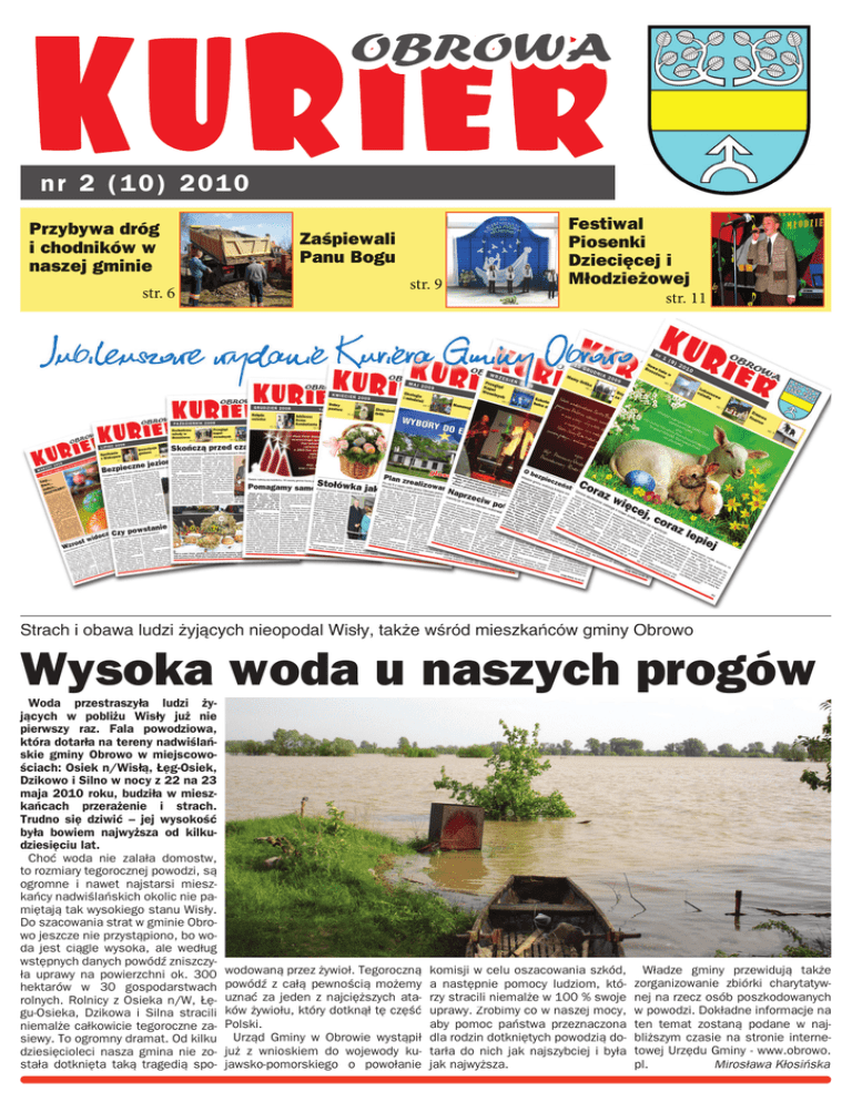 nr 2 (10) 2 0 1 0 Przybywa dróg i chodników w naszej gminie str. 6 Zaśpiewali Panu Bogu str. 9 Festiwal Piosenki Dziecięcej i Młodzieżowej str. 11 Strach i obawa ludzi ¿yj¹cych nieopodal Wis³y, tak¿e wœród mieszkañców gminy Obrowo Wysoka woda u naszych progów Woda przestraszyła ludzi żyjących w pobliżu Wisły już nie pierwszy raz. Fala powodziowa, która dotarła na tereny nadwiślańskie gminy Obrowo w miejscowościach: Osiek n/Wisłą, Łęg-Osiek, Dzikowo i Silno w nocy z 22 na 23 maja 2010 roku, budziła w mieszkańcach przerażenie i strach. Trudno się dziwić – jej wysokość była bowiem najwyższa od kilkudziesięciu lat. Choć woda nie zalała domostw, to rozmiary tegorocznej powodzi, są ogromne i nawet najstarsi mieszkańcy nadwiślańskich okolic nie pamiętają tak wysokiego stanu Wisły. Do szacowania strat w gminie Obrowo jeszcze nie przystąpiono, bo woda jest ciągle wysoka, ale według wstępnych danych powódź zniszczyła uprawy na powierzchni ok. 300 hektarów w 30 gospodarstwach rolnych. Rolnicy z Osieka n/W, Łęgu-Osieka, Dzikowa i Silna stracili niemalże całkowicie tegoroczne zasiewy. To ogromny dramat. Od kilku dziesięcioleci nasza gmina nie została dotknięta taką tragedią spo- wodowaną przez żywioł. Tegoroczną powódź z całą pewnością możemy uznać za jeden z najcięższych ataków żywiołu, który dotknął tę część Polski. Urząd Gminy w Obrowie wystąpił już z wnioskiem do wojewody kujawsko-pomorskiego o powołanie komisji w celu oszacowania szkód, a następnie pomocy ludziom, którzy stracili niemalże w 100 % swoje uprawy. Zrobimy co w naszej mocy, aby pomoc państwa przeznaczona dla rodzin dotkniętych powodzią dotarła do nich jak najszybciej i była jak najwyższa. Władze gminy przewidują także zorganizowanie zbiórki charytatywnej na rzecz osób poszkodowanych w powodzi. Dokładne informacje na ten temat zostaną podane w najbliższym czasie na stronie internetowej Urzędu Gminy - www.obrowo. pl. Mirosława Kłosińska Odnowiony cmentarz menonicko- ewangelicki w Silnie gm. Obrowo zosta³ otwarty Ratujemy ślady przeszłości Po trzech latach prac rewitalizacyjnych 25 maja 2010 r. odbyła się uroczystość symbolicznego otwarcia cmentarza mennonicko-ewangelickiego w Silnie. Akcja realizowana była w ramach programu „Ślady przeszłości - uczniowie adoptują zabytki”. Pierwszą część uroczystości zorganizowanej w Zespole Szkół im. Jana Pawła II w Obrowie otworzył dyrektor Artur Affelt, który przedstawił historię menonitów i ich związek z terenami naszej gminy. Opiekun projektu Maciej Bandrowski przypomniał początki projektu i działania podjęte przez uczniów. Młodzież z opiekunem zebrała dokumentację w Archiwum Państwowym w Toruniu i w Urzędzie Gminy w Obrowie oraz dokonała aktu adopcji cmentarza, przyrzekając opiekę nad nekropolią. Następnie uczniowie z nauczycielami zaprosili gości na cmentarz menonicko-ewangelicki do Silna nad Wisłą. Tam uczniowie z koła teatralnego ”Lolek” prowadzonego przez Irenę Szymeczką, wykorzystując swoje umiejętności posługiwania się j. niemieckim, przedstawili inscenizację pt. ”Z Hanoweru do Silna”. Na miejscu głos zabrali proboszcz parafii ewangelicko-augsburskiej z Torunia ks. Jerzy Molin, proboszcz parafii rzymsko-katolickiej z Obrowa ks. Tadeusz Lewandowski oraz wójt gminy Obrowo Andrzej Wieczyński. Spotkanie zakończono ekumeniczną modlitwą. Główne założenia projektu to: zebranie dostępnych materiałów archiwalnych na temat historii i okoliczności powstania cmentarza, pozyskanie zezwoleń na prowadzenie prac renowacyjnych na cmentarzu, sporządzenie dokumentacji fotogra- ficznej i opisowej obiektu, usunięcie zalegających liści i gałęzi drzew, wycięcie samosiejek drzew i krzewów zarastających groby, oczyszczenie z mchów i porostów resztek grobów, ułożenie chodnika, umieszczenie krzyża i tablicy informacyjnej. Uczniowie złożyli dwukrotnie wizytę w Warszawie na Ogólnopolskiej Prezentacji Projektów ”Ślady przeszłości - uczniowie adoptują zabytki”. Brali udział w ogólnopolskiej konferencji i warsztatach dla uczniów i nauczycieli pt. „Wspólna przeszłość - wspólna przyszłość organizowanych przez Centrum Edukacji Obywatelskie w Warszawie pod patronatem Ministerstwa Edukacji Narodowej. Zaproszeni goście mieli możliwość zwiedzenia wystawy, która dokumentowała zakres przeprowadzonych prac oraz wpisania się do księgi pamiątkowej. Przy realizacji projektu wspierali nas: wójt gminy Obrowo Andrzej Wieczyński fundator tablicy pamiątkowej, Urząd Gminy w Obrowie, Dyrekcja Zespołu Szkół im. Jana Pawła w Obrowie, Nadleśnictwo Dobrzejewice, uczniowie gimnazjum nr 1 w Obrowie, pracownicy Zespołu Szkół im. Jana Pawła w Obrowie i Szkoły Podstawowej im. M. Kopernika z Łążyna II, rodzice i opiekunowie uczniów oraz Centrum Edukacji Obywatelskiej w Warszawie. Wszystkim za okazaną pomoc serdecznie dziękujemy. Opiekun projektu Maciej Bandrowski Rada Gminy podjê³a uchwa³ê o tegorocznych taryfach za wodê i œcieki Taryfy za ścieki i wodę - bez zmian Urząd Gminy Obrowo przypomina, że od 1 maja 2010 r. obowiązuje nowa taryfa dla zbiorowego zaopatrzenia w wodę i zbiorowego odprowadzania ścieków. Uchwałą NR XXXIV/213/2010 Rady Gminy Obrowo z dnia 23 kwietnia 2010 r. zatwierdzono taryfę dla zbiorowego zaopatrzenia w wodę i zbiorowego odprowadzania ścieków na okres od 01 maja 2010 r. do 30 kwietnia 2011 r. Aktualne opłaty dla zbiorowego zaopatrzenia w wodę i zbiorowego odprowadzania ścieków: • za 1 m3 wody pobieranej z urządzeń zbiorowego zaopatrzenia w wodę położonych na terenie gminy Obrowo - 1,96zł + VAT (2,10zł z VAT); • za 1 m3 ścieków odprowadzonych do zbiorowych urządzeń kanalizacyjnych położonych na terenie gminy Obrowo - 2,49zł + VAT 2,66zł z VAT); • za 1 m3 ścieków dowożonych do zbiorowych urządzeń kanalizacyjnych - 