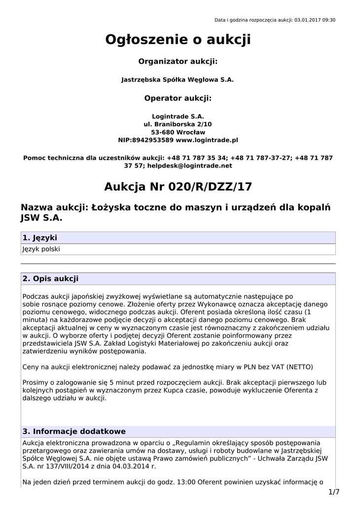 Data i godzina rozpoczęcia aukcji: 03.01.2017 09:30 Ogłoszenie o aukcji Organizator aukcji: Jastrzębska Spółka Węglowa S.A. Operator aukcji: Logintrade S.A. ul. Braniborska 2/10 53-680 Wrocław NIP:8942953589 www.logintrade.pl Pomoc techniczna dla uczestników aukcji: +48 71 787 35 34; +48 71 787-37-27; +48 71 787 37 57; [email protected] Aukcja Nr 020/R/DZZ/17 Nazwa aukcji: Łożyska toczne do maszyn i urządzeń dla kopalń JSW S.A. 1. Języki Język polski 2. Opis aukcji Podczas aukcji japońskiej zwyżkowej wyświetlane są automatycznie następujące po sobie rosnące poziomy cenowe. Złożenie oferty przez Wykonawcę oznacza akceptację danego poziomu cenowego, widocznego podczas aukcji. Oferent posiada określoną ilość czasu (1 minuta) na każdorazowe podjęcie decyzji o akceptacji danego poziomu cenowego. Brak akceptacji aktualnej w ceny w wyznaczonym czasie jest równoznaczny z zakończeniem udziału w aukcji. O wyborze oferty i podjętej decyzji Oferent zostanie poinformowany przez przedstawiciela JSW S.A. Zakład Logistyki Materiałowej po zakończeniu aukcji oraz zatwierdzeniu wyników postępowania. Ceny na aukcji elektronicznej należy podawać za jednostkę miary w PLN bez VAT (NETTO) Prosimy o zalogowanie się 5 minut przed rozpoczęciem aukcji. Brak akceptacji pierwszego lub kolejnych postąpień w wyznaczonym przez Kupca czasie, powoduje wykluczenie Oferenta z dalszego udziału w aukcji. 3. Informacje dodatkowe Aukcja elektroniczna prowadzona w oparciu o „Regulamin określający sposób postępowania przetargowego oraz zawierania umów na dostawy, usługi i roboty budowlane w Jastrzębskiej Spółce Węglowej S.A. nie objęte ustawą Prawo zamówień publicznych” - Uchwała Zarządu JSW S.A. nr 137/VIII/2014 z dnia 04.03.2014 r. Na jeden dzień przed terminem aukcji do godz. 13:00 Oferent powinien uzyskać informację o 1/7 dopuszczeniu do aukcji lub o ewentualnym przesunięciu terminu aukcji. O powyższym Oferenci informowani będą drogą elektroniczną przez Operatora aukcji. Informację w tym zakresie można uzyskać pod numerem telefonu +48 32 756 4085 . Ogłoszenie o aukcji znajduje się pod adresem https://jsw.logintrade.net/rejestracja/aktualneaukcje.html O wyborze najkorzystniejszej oferty będzie decydować wartość za realizację zamówienia objętego aukcją. 4. Waluta % 5. Załączniki 1. 2. 3. 4. 5. 6. 7. Zaproszenie.pdf WZÓR OŚWIADCZENIA do blokowania wadium.docx Oświadczenie Oferenta BRANŻOWE.pdf Załącznik nr 2 wymagania 19.10.16.docx umowa 020-R-DZZ-17.doc Ogólne Warunki Umów.docx formularz ofertowy 020-R-DZZ-17.doc 6. Lista produktów Lp. Nazwa produktu Ilość Jednostka miary 1. Łożyska toczne wg potrzeb kopalń JSW S.A. według aktualnego cennika SKF na dostawy łożysk w 2017r. 1 cennik 2. Łożyska toczne wg potrzeb kopalń JSW S.A. według aktualnego cennika FAG na dostawy łożysk w 2017r. 1 cennik 3. Łożyska toczne wg potrzeb kopalń JSW S.A. według aktualnego cennika Timken na dostawy łożysk w 2017r. 1 cennik 4. Łożyska toczne wg potrzeb kopalń JSW S.A. według aktualnego cennika INA z na dostawy łożysk w 2017r. 1 cennik 5. Łożyska toczne wg potrzeb kopalń JSW S.A. według aktualnego cennika KFŁT z na dostawy łożysk w 2017r. 1 cennik 6. Łożyska toczne wg potrzeb kopalń JSW S.A. według aktualnego cennika PPL z na dostawy łożysk w 2017r. 1 cennik Uwagi 2/7 7. Łożyska toczne wg potrzeb kopalń JSW S.A. według aktualnego cennika MPZ z na dostawy łożysk w 2017r. 1 cennik 8. Łożyska toczne wg potrzeb kopalń JSW S.A. według aktualnego cennika EPK (SPZ/VPZ/GPZ) na dostawy łożysk w 2017r. 1 cennik 7. Kryteria oceny Lp. Nazwa kryterium 1. Cena 8. Reguły aukcji Aukcja otwarta Czas na decyzję: 120 sekund Łożyska toczne wg potrzeb kopalń JSW S.A. dostawy łożysk w 2017r. Łożyska toczne wg potrzeb kopalń JSW S.A. dostawy łożysk w 2017r. Łożyska toczne wg potrzeb kopalń JSW S.A. dostawy łożysk w 2017r. Łożyska toczne wg potrzeb kopalń JSW S.A. dostawy łożysk w 2017r. Łożyska toczne wg potrzeb kopalń JSW S.A. dostawy łożysk w 2017r. Łożyska toczne wg potrzeb kopalń JSW S.A. dostawy łożysk w 2017r. Łożyska toczne wg potrzeb kopalń JSW S.A. dostawy łożysk w 2017r. Łożyska toczne wg potrzeb kopalń JSW S.A. (SPZ/VPZ/GPZ) na dostawy łożysk w 2017r. według aktualnego cennika SKF na według aktualnego cennika FAG na według aktualnego cennika Timken na według aktualnego cennika INA z na według aktualnego cennika KFŁT z na według aktualnego cennika PPL z na według aktualnego cennika MPZ z na według aktualnego cennika EPK 9. Czas aukcji Data: 03.01.2017 Godzina rozpoczęcia aukcji: 09:30:00 Termin składania ofert: 2016-12-28 23:59:00 Widok Oferent nie widzi nazw pozostałych oferentów 10. Informacje o ofertach Zamawiający dopuszcza składanie ofert częściowych. Jeżeli w aukcji licytowana jest pozycja, której jednostką miary jest pakiet Zamawiający nie dopuszcza składania ofert częściowych w obrębie pakietu, ponadto po zakończeniu aukcji Wykonawcy będą zobowiązani do rozpisania cen jednostkowych pakietu zgodnie z wartością 3/7 uzyskaną w wyniku aukcji 11. Kontakt w sprawach formalnych Anna Woźnica - Sekcja Przetargów tel.: +48 32 756 4085 12. Kontakt w sprawach przedmiotu zamówienia Agnieszka Pietrasz - 32 756 4217 13. Warunki płatności Warunki płatności – przelew do 120 dni od daty dostarczenia f-ry do ZLM JSW S.A. 14. Termin dostawy do 31.12.2017r. 15. Sposób dostawy na koszt sprzedającego na magazyny przy Zakładach JSW S.A. 16. Warunki udziału w aukcji I Warunkiem udziału w aukcji elektronicznej jest rejestracja na Platformie Logintrade (https://jsw.logintrade.net) oraz zgłoszenie udziału w aukcji najpóźniej do godz.: 12:00 zgodnie z terminem składania ofert. Formularz rejestracyjny jest dostępny pod adresem https://jsw.logintrade.net/rejestracja. Rejestracja jest bezpłatna. II Warunkiem udziału w aukcji jest złożenie pr