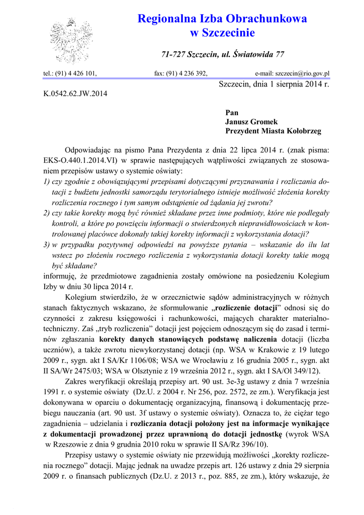Regionalna Izba Obrachunkowa w Szczecinie 71-727 Szczecin, ul. Światowida 77 tel.: (91) 4 426 101, fax: (91) 4 236 392, e-mail: [email protected] Szczecin, dnia 1 sierpnia 2014 r. K.0542.62.JW.2014 Pan Janusz Gromek Prezydent Miasta Kołobrzeg Odpowiadając na pismo Pana Prezydenta z dnia 22 lipca 2014 r. (znak pisma: EKS-O.440.1.2014.VI) w sprawie następujących wątpliwości związanych ze stosowaniem przepisów ustawy o systemie oświaty: 1) czy zgodnie z obowiązującymi przepisami dotyczącymi przyznawania i rozliczania dotacji z budżetu jednostki samorządu terytorialnego istnieje możliwość złożenia korekty rozliczenia rocznego i tym samym odstąpienie od żądania jej zwrotu? 2) czy takie korekty mogą być również składane przez inne podmioty, które nie podlegały kontroli, a które po powzięciu informacji o stwierdzonych nieprawidłowościach w kontrolowanej placówce dokonały takiej korekty informacji z wykorzystania dotacji? 3) w przypadku pozytywnej odpowiedzi na powyższe pytania – wskazanie do ilu lat wstecz po złożeniu rocznego rozliczenia z wykorzystania dotacji korekty takie mogą być składane? informuję, że przedmiotowe zagadnienia zostały omówione na posiedzeniu Kolegium Izby w dniu 30 lipca 2014 r. Kolegium stwierdziło, że w orzecznictwie sądów administracyjnych w różnych stanach faktycznych wskazano, że sformułowanie „rozliczenie dotacji” odnosi się do czynności z zakresu księgowości i rachunkowości, mających charakter materialnotechniczny. Zaś „tryb rozliczenia” dotacji jest pojęciem odnoszącym się do zasad i terminów zgłaszania korekty danych stanowiących podstawę naliczenia dotacji (liczba uczniów), a także zwrotu niewykorzystanej dotacji (np. WSA w Krakowie z 19 lutego 2009 r., sygn. akt I SA/Kr 1106/08; WSA we Wrocławiu z 16 grudnia 2005 r., sygn. akt II SA/Wr 2475/03; WSA w Olsztynie z 19 września 2012 r., sygn. akt I SA/Ol 349/12). Zakres weryfikacji określają przepisy art. 90 ust. 3e-3g ustawy z dnia 7 września 1991 r. o systemie oświaty (Dz.U. z 2004 r. Nr 256, poz. 2572, ze zm.). Weryfikacja jest dokonywana w oparciu o dokumentację organizacyjną, finansową i dokumentację przebiegu nauczania (art. 90 ust. 3f ustawy o systemie oświaty). Oznacza to, że ciężar tego zagadnienia – udzielania i rozliczania dotacji położony jest na informacje wynikające z dokumentacji prowadzonej przez uprawnioną do dotacji jednostkę (wyrok WSA w Rzeszowie z dnia 9 grudnia 2010 roku w sprawie II SA/Rz 396/10). Przepisy ustawy o systemie oświaty nie przewidują możliwości „korekty rozliczenia rocznego” dotacji. Mając jednak na uwadze przepis art. 126 ustawy z dnia 29 sierpnia 2009 r. o finansach publicznych (Dz.U. z 2013 r., poz. 885, ze zm.), który wskazuje, że 2 dotacje udzielane z budżetu jednostki samorządu terytorialnego (m.in. na podstawie ustawy o systemie oświaty) podlegają szczególnym zasadom rozliczania, Kolegium stwierdziło, że organ stanowiący Miasta Kołobrzeg w swoim zakresie może uregulować warunki korekt rozliczeń rocznych dotacji. Natomiast w zakresie kwestionowania wydatków poniesionych na reklamę placówki, Kolegium Izby podtrzymuje stanowisko z dnia 17-18.03.2011 r. wyrażone przez Krajową Radę RIO: wydatki ponoszone na koszt reklamy służące wyłącznie rekrutacji (naborowi) uczniów, należą do grupy wydatków bieżących i jako związane (służące) realizacji zadań określonych w art. 90 ust. 3d ustawy o systemie oświaty – mogą być finansowane z dotacji otrzymanej z jednostki samorządu terytorialnego. Jednocześnie wyjaśniam, że powyższe stanowisko nie jest wiążącą wykładnią prawa lecz prezentuje pogląd na problem sygnalizowany w Pana piśmie.