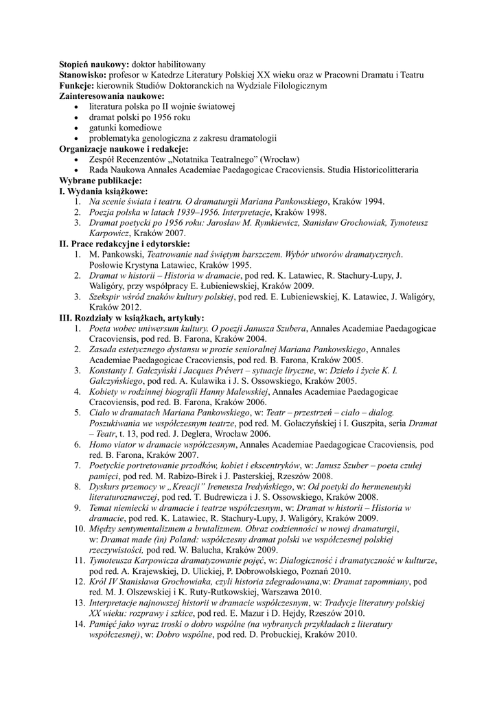 Stopień naukowy: doktor habilitowany Stanowisko: profesor w Katedrze Literatury Polskiej XX wieku oraz w Pracowni Dramatu i Teatru Funkcje: kierownik Studiów Doktoranckich na Wydziale Filologicznym Zainteresowania naukowe: literatura polska po II wojnie światowej dramat polski po 1956 roku gatunki komediowe problematyka genologiczna z zakresu dramatologii Organizacje naukowe i redakcje: Zespół Recenzentów „Notatnika Teatralnego” (Wrocław) Rada Naukowa Annales Academiae Paedagogicae Cracoviensis. Studia Historicolitteraria Wybrane publikacje: I. Wydania książkowe: 1. Na scenie świata i teatru. O dramaturgii Mariana Pankowskiego, Kraków 1994. 2. Poezja polska w latach 1939–1956. Interpretacje, Kraków 1998. 3. Dramat poetycki po 1956 roku: Jarosław M. Rymkiewicz, Stanisław Grochowiak, Tymoteusz Karpowicz, Kraków 2007. II. Prace redakcyjne i edytorskie: 1. M. Pankowski, Teatrowanie nad świętym barszczem. Wybór utworów dramatycznych. Posłowie Krystyna Latawiec, Kraków 1995. 2. Dramat w historii – Historia w dramacie, pod red. K. Latawiec, R. Stachury-Lupy, J. Waligóry, przy współpracy E. Łubieniewskiej, Kraków 2009. 3. Szekspir wśród znaków kultury polskiej, pod red. E. Lubieniewskiej, K. Latawiec, J. Waligóry, Kraków 2012. III. Rozdziały w książkach, artykuły: 1. Poeta wobec uniwersum kultury. O poezji Janusza Szubera, Annales Academiae Paedagogicae Cracoviensis, pod red. B. Farona, Kraków 2004. 2. Zasada estetycznego dystansu w prozie senioralnej Mariana Pankowskiego, Annales Academiae Paedagogicae Cracoviensis, pod red. B. Farona, Kraków 2005. 3. Konstanty I. Gałczyński i Jacques Prévert – sytuacje liryczne, w: Dzieło i życie K. I. Gałczyńskiego, pod red. A. Kulawika i J. S. Ossowskiego, Kraków 2005. 4. Kobiety w rodzinnej biografii Hanny Malewskiej, Annales Academiae Paedagogicae Cracoviensis, pod red. B. Farona, Kraków 2006. 5. Ciało w dramatach Mariana Pankowskiego, w: Teatr – przestrzeń – ciało – dialog. Poszukiwania we współczesnym teatrze, pod red. M. Gołaczyńskiej i I. Guszpita, seria Dramat – Teatr, t. 13, pod red. J. Deglera, Wrocław 2006. 6. Homo viator w dramacie współczesnym, Annales Academiae Paedagogicae Cracoviensis, pod red. B. Farona, Kraków 2007. 7. Poetyckie portretowanie przodków, kobiet i ekscentryków, w: Janusz Szuber – poeta czułej pamięci, pod red. M. Rabizo-Birek i J. Pasterskiej, Rzeszów 2008. 8. Dyskurs przemocy w „Kreacji” Ireneusza Iredyńskiego, w: Od poetyki do hermeneutyki literaturoznawczej, pod red. T. Budrewicza i J. S. Ossowskiego, Kraków 2008. 9. Temat niemiecki w dramacie i teatrze współczesnym, w: Dramat w historii – Historia w dramacie, pod red. K. Latawiec, R. Stachury-Lupy, J. Waligóry, Kraków 2009. 10. Między sentymentalizmem a brutalizmem. Obraz codzienności w nowej dramaturgii, w: Dramat made (in) Poland: współczesny dramat polski we współczesnej polskiej rzeczywistości, pod red. W. Balucha, Kraków 2009. 11. Tymoteusza Karpowicza dramatyzowanie pojęć, w: Dialogiczność i dramatyczność w kulturze, pod red. A. Krajewskiej, D. Ulickiej, P. Dobrowolskiego, Poznań 2010. 12. Król IV Stanisława Grochowiaka, czyli historia zdegradowana,w: Dramat zapomniany, pod red. M. J. Olszewskiej i K. Ruty-Rutkowskiej, Warszawa 2010. 13. Interpretacje najnowszej historii w dramacie współczesnym, w: Tradycje literatury polskiej XX wieku: rozprawy i szkice, pod red. E. Mazur i D. Hejdy, Rzeszów 2010. 14. Pamięć jako wyraz troski o dobro wspólne (na wybranych przykładach z literatury współczesnej), w: Dobro wspólne, pod red. D. Probuckiej, Kraków 2010. 15. Językowe spotkania postaci w konwencji „szczerej rozmowy”, w: Dylematy dramatu i teatru u progu XXI wieku, red. A. Podstawka, A. Jarosz, Lublin 2011. 16. Marian Pankowski: Between the Carpathians and European Civilization, “Russian Literature”. Croatian and Serbian, Czech and Slovak, Polish. November 2011, Vol. 70, nr 4. 17. Exodus teatru STU – polski wariant kontestacji, w: Zanurzeni w historii, zanurzeni w kulturze. Literatura czasów PRL-u o PRL-u, pod red. M. Karwali i B. Serwatki, Kraków 2011. 18. Współczesny teatr i film w scenerii Nowej Huty, w: Między filmem a teatrem, seria Dramat – Teatr, t. 26, pod red. S. Bobowskiego, M. Lesiaka, M. Różewicz, Wrocław 2012. 19. Dukla – omfalos i miejsce peryferyjne, w: Od poetyki przestrzeni do geopoetyki, seria „Poetyka i horyzonty tradycji”, t. 5, pod red. E. Konończuk i E. Sidoruk, Białystok 2012. 20. Mówienie Szekspirem w publicystyce PRL-u, w: Szekspir wśród znaków kultury polskiej, pod red. E. Łubieniewskiej, K. Latawiec, J. Waligóry, Kraków 2012. 21. Sanok i Brugia – peryferyjne miasta Mariana Pankowskiego, w: Małe miasta. Studia i szkice humanistyczne, pod red. J. Pacuły i L. Romaniszyn-Ziomek, Bielsko-Biała 2012. 22. Między felietonem a gawędą. Andrzeja Żurowskiego refleksje o życiu i teatrze, w: Szekspir(y) Żurowskiego, pod red. A. Sobieckiej, Słupsk 2014. 23. Dramatyczne i teatralne reprezentacje przeżywania historii, w: Dramat i doświadczenie, pod red. B. Popczyk-Szczęsnej i M. Fizgał, Katowice 2014. 24. „W garderobie natury”. Ciała obnażanie we współczesnym teatrze, w:Między filmem a teatrem II, pod. red. S. Bobowskiego i P. Rudzkiego, Wrocław 2014. IV. Prace popularnonaukowe, recenzje, przeglądy: 1. Polskość i europejskość w eseistyce Cz. Miłosza i A. Wernera, „Język polski w szkole średniej”, Kielce 1991–1992, z. 1. 2. Różewiczowska formuła dramatu realistyczno-poetyckiego, „Język polski w szkole średniej”, Kielce 1993–1994, z. 3. 3. Poezja jako gra znaczeń (O wierszach Czesława Miłosza i Zbigniewa Herberta, w: Poezja w szkole średniej, pod red. E. Kram-Mikoś, Warszawa–Kraków 1995. 4. Między mitem a historią. O teatrze Mariana Pankowskiego, „Fraza”. Poezja – Proza – Esej. Rzeszów 1997, nr 4(18). 5. „Gorzkie prowincje”. Rozmowa z Janu