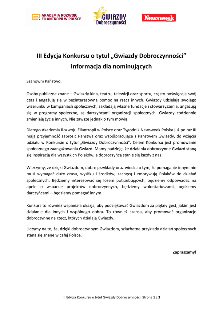 III Edycja Konkursu o tytuł „Gwiazdy Dobroczynności” Informacja dla nominujących Szanowni Paostwo, Osoby publiczne znane – Gwiazdy kina, teatru, telewizji oraz sportu, często poświęcają swój czas i angażują się w bezinteresowną pomoc na rzecz innych. Gwiazdy udzielają swojego wizerunku w kampaniach społecznych, zakładają własne fundacje i stowarzyszenia, angażują się w programy społeczne, są darczyocami organizacji społecznych. Gwiazdy codziennie zmieniają życie innych. Nie zawsze jednak o tym mówią. Dlatego Akademia Rozwoju Filantropii w Polsce oraz Tygodnik Newsweek Polska już po raz III mają przyjemnośd zaprosid Paostwa oraz współpracujące z Paostwem Gwiazdy, do wzięcia udziału w Konkursie o tytuł „Gwiazdy Dobroczynności”. Celem Konkursu jest promowanie społecznego zaangażowania Gwiazd. Mamy nadzieję, że działania dobroczynne Gwiazd staną się inspiracją dla wszystkich Polaków, a dobroczyocą stanie się każdy z nas. Wierzymy, że dzięki Gwiazdom, dobre przykłady oraz wiedza o tym, że pomaganie innym nie musi wymagad dużo czasu, wysiłku i środków, zachęcą i zmotywują Polaków do działao społecznych. Będziemy interesowad się losem potrzebujących, będziemy odpowiadad na apele o wsparcie projektów dobroczynnych, będziemy wolontariuszami, będziemy darczyocami – będziemy pomagad innym. Konkurs to również wspaniała okazja, aby podziękowad Gwiazdom za piękny gest, jakim jest działanie dla innych i wspólnego dobra. To również szansa, aby promowad organizacje dobroczynne na rzecz, których działają Gwiazdy. Liczymy na to, że, dzięki dobroczynnym Gwiazdom, szlachetne przykłady działao społecznych staną się znane w całej Polsce. Zapraszamy! III Edycja Konkursu o tytuł Gwiazdy Dobroczynności, Strona 1 z 3 Konkursu o tytuł „Gwiazdy Dobroczynności” – najważniejsze informacje. Organizatorzy Konkurs „Gwiazdy Dobroczynności” organizowany jest przez Stowarzyszenie Akademia Rozwoju Filantropii w Polsce oraz Tygodnik Newsweek Polska. Cel Konkursu Celem Konkursu jest promocja społecznego zaangażowania gwiazd oraz popularyzacja postaw dobroczynnych w społeczeostwie poprzez prezentację przykładów aktywności osób powszechnie znanych. Zasady uczestnictwa W Konkursie nominowad można osoby, które biorą czynny udział w tworzeniu szeroko rozumianej kultury popularnej i wysokiej oraz sportu, zamieszkałe w Polsce. Nominacje do tytułu „Gwiazdy Dobroczynności” mogą byd składane samodzielnie, a także przez fundacje, stowarzyszenia, firmy, menedżerów gwiazd oraz inne instytucje, z którymi współpracują osoby publicznie znane w zakresie działalności dobroczynnej. Tytuł „Gwiazdy Dobroczynności” przyznawany jest w pięciu kategoriach konkursowych: 1. Wolontariusz 2. Twarz kampanii społecznej 3. Darczyoca organizacji społecznej 4. Zaangażowanie w program społeczny 5. Własna działalnośd społeczna Kapituła Konkursu przyznaje również specjalną Gwiazdę Dobroczynności - Honorową Gwiazdę Dobroczynności. Zgłoszenia do Konkursu przyjmowane są do 14 listopada 2011 r. (decyduje data stempla pocztowego) w formie wypełnionego formularza wniosku zgłoszeniowego przesłanego w wersji elektronicznej na adres: [email protected] oraz w wersji papierowej, w dwóch egzemplarzach, na adres: Biuro Konkursu o tytuł „Gwiazdy Dobroczynności” Akademia Rozwoju Filantropii w Polsce ul. Marszałkowska 6/6 00-590 Warszawa III Edycja Konkursu o tytuł Gwiazdy Dobroczynności, Strona 2 z 3 Procedura wyboru Spośród nadesłanych zgłoszeo Kapituła Konkursu wskaże do 25 najlepszych kandydatur, spośród, których Laureaci Konkursu zostaną wyłonieni w drodze otwartego głosowania za pośrednictwem Internetu. Kapituła Konkursu przyzna również specjalną Gwiazdę Dobroczynności - Honorową Gwiazdę Dobroczynności dla Kandydata, którego działalnośd społeczna zasługuje na specjalne uznanie. Ogłoszenie wyników konkursu nastąpi na łamach tygodnika Newsweek w styczniu 2012 roku. Harmonogram Konkursu 26 września – rozpoczęcie III Edycji Konkursu o tytuł Gwiazdy Dobroczynności 14 listopada – zakooczenie przyjmowania Kandydatur 22 listopada – posiedzenie Kapituły Konkursu 28 listopada – start głosowania publiczności 9 stycznia 2012 – zakooczenie głosowania 18 luty 2012 – III Charytatywny Bal Gwiazd Dobroczynności i gala ogłoszenia wyników Kontakt W przypadku pytao lub szczegółowych informacji, prosimy o kontakt telefoniczny lub mailowy z Biurem Konkursowym. Nasz adres e- mail: [email protected] lub [email protected] Nasz telefon: 022 825 68 50 Zapraszamy! III Edycja Konkursu o tytuł Gwiazdy Dobroczynności, Strona 3 z 3