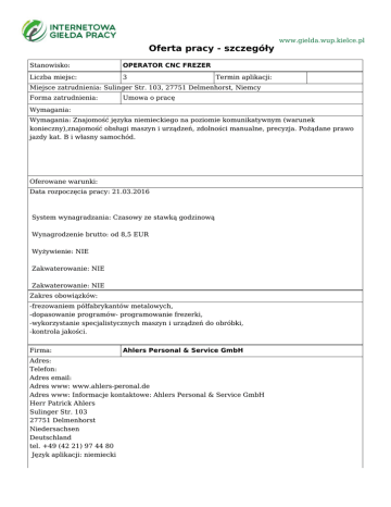 Oferta pracy - szczegóły Stanowisko: OPERATOR CNC FREZER Liczba miejsc: 3 www.gielda.wup.kielce.pl Termin aplikacji: Miejsce zatrudnienia: Sulinger Str. 103, 27751 Delmenhorst, Niemcy Forma zatrudnienia: Umowa o pracę Wymagania: Wymagania: Znajomość języka niemieckiego na poziomie komunikatywnym (warunek konieczny),znajomość obsługi maszyn i urządzeń, zdolności manualne, precyzja. Pożądane prawo jazdy kat. B i własny samochód. Oferowane warunki: Data rozpoczęcia pracy: 21.03.2016 System wynagradzania: Czasowy ze stawką godzinową Wynagrodzenie brutto: od 8,5 EUR Wyżywienie: NIE Zakwaterowanie: NIE Zakwaterowanie: NIE Zakres obowiązków: -frezowaniem półfabrykantów metalowych, -dopasowanie programów- programowanie frezerki, -wykorzystanie specjalistycznych maszyn i urządzeń do obróbki, -kontrola jakości. Firma: Ahlers Personal & Service GmbH Adres: Telefon: Adres email: Adres www: www.ahlers-peronal.de Adres www: Informacje kontaktowe: Ahlers Personal & Service GmbH Herr Patrick Ahlers Sulinger Str. 103 27751 Delmenhorst Niedersachsen Deutschland tel. +49 (42 21) 97 44 80 Język aplikacji: niemiecki Sposób aplikowania: bezpośrednio do pracodawcy Sposób przekazania dokumentów: Dokumenty należy przesłac pocztą elektorniczną na adres: [email protected] lub pocztą tradycyjną na adres: Ahlers Personal & Service GmbH Herr Patrick Ahlers Sulinger Str. 103 27751 Delmenhorst Niedersachsen Deutschland Wymagane dokumenty: CV Uwagi: Identyfikator oferty: 10000-1144485403-S Instytucja koordynująca ofertę: Wojewódzki Urząd Pracy w Zielonej Górze Urząd Pracy dokłada wszelkich starań, aby oferty pracy będące w zasobach urzędu, były rzetelne i wiarygodne. Ponieważ wszystkie oferty pracy pochodzą od osób trzecich Urząd Pracy zastrzega, że odpowiedzialność za ewentualne rozbieżności pomiędzy warunkami pracy zaprezentowanymi w niniejszej ofercie a warunkami zaproponowanymi przez potencjalnego pracodawcę ponosi pracodawca.