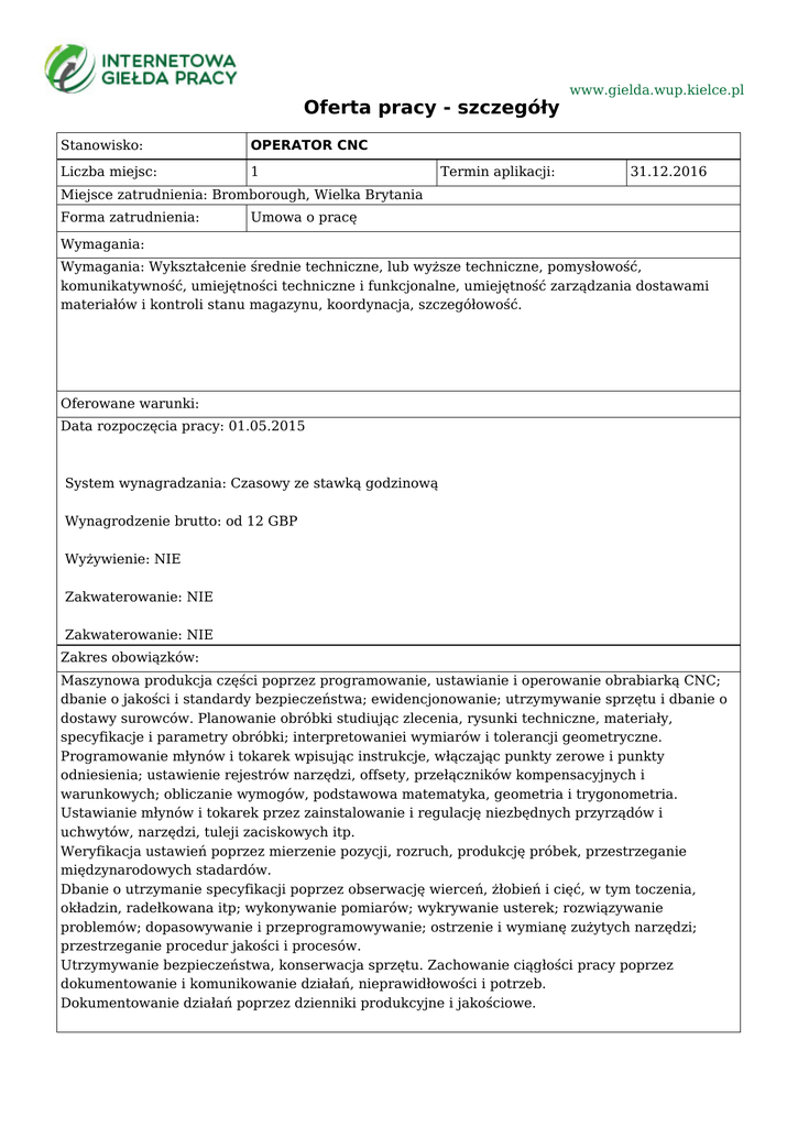Oferta pracy - szczegóły Stanowisko: OPERATOR CNC Liczba miejsc: 1 Termin aplikacji: www.gielda.wup.kielce.pl 31.12.2016 Miejsce zatrudnienia: Bromborough, Wielka Brytania Forma zatrudnienia: Umowa o pracę Wymagania: Wymagania: Wykształcenie średnie techniczne, lub wyższe techniczne, pomysłowość, komunikatywność, umiejętności techniczne i funkcjonalne, umiejętność zarządzania dostawami materiałów i kontroli stanu magazynu, koordynacja, szczegółowość. Oferowane warunki: Data rozpoczęcia pracy: 01.05.2015 System wynagradzania: Czasowy ze stawką godzinową Wynagrodzenie brutto: od 12 GBP Wyżywienie: NIE Zakwaterowanie: NIE Zakwaterowanie: NIE Zakres obowiązków: Maszynowa produkcja części poprzez programowanie, ustawianie i operowanie obrabiarką CNC; dbanie o jakości i standardy bezpieczeństwa; ewidencjonowanie; utrzymywanie sprzętu i dbanie o dostawy surowców. Planowanie obróbki studiując zlecenia, rysunki techniczne, materiały, specyfikacje i parametry obróbki; interpretowaniei wymiarów i tolerancji geometryczne. Programowanie młynów i tokarek wpisując instrukcje, włączając punkty zerowe i punkty odniesienia; ustawienie rejestrów narzędzi, offsety, przełączników kompensacyjnych i warunkowych; obliczanie wymogów, podstawowa matematyka, geometria i trygonometria. Ustawianie młynów i tokarek przez zainstalowanie i regulację niezbędnych przyrządów i uchwytów, narzędzi, tuleji zaciskowych itp. Weryfikacja ustawień poprzez mierzenie pozycji, rozruch, produkcję próbek, przestrzeganie międzynarodowych stadardów. Dbanie o utrzymanie specyfikacji poprzez obserwację wierceń, żłobień i cięć, w tym toczenia, okładzin, radełkowana itp; wykonywanie pomiarów; wykrywanie usterek; rozwiązywanie problemów; dopasowywanie i przeprogramowywanie; ostrzenie i wymianę zużytych narzędzi; przestrzeganie procedur jakości i procesów. Utrzymywanie bezpieczeństwa, konserwacja sprzętu. Zachowanie ciągłości pracy poprzez dokumentowanie i komunikowanie działań, nieprawidłowości i potrzeb. Dokumentowanie działań poprzez dzienniki produkcyjne i jakościowe. Firma: AMF Precision Engineering Ltd. Adres: Telefon: Adres email: Adres www: Adres www: Informacje kontaktowe: [email protected] Język aplikacji: angielski Sposób aplikowania: bezpośrednio do pracodawcy Sposób przekazania dokumentów: E-mail Wymagane dokumenty: CV Uwagi: Identyfikator oferty: 26741353 Instytucja koordynująca ofertę: Wojewódzki Urząd Pracy w Warszawie Urząd Pracy dokłada wszelkich starań, aby oferty pracy będące w zasobach urzędu, były rzetelne i wiarygodne. Ponieważ wszystkie oferty pracy pochodzą od osób trzecich Urząd Pracy zastrzega, że odpowiedzialność za ewentualne rozbieżności pomiędzy warunkami pracy zaprezentowanymi w niniejszej ofercie a warunkami zaproponowanymi przez potencjalnego pracodawcę ponosi pracodawca.