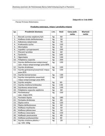 Dostawy żywności do Państwowej Bursy Szkół Artystycznych w Poznaniu ……………………………………………………….. Załącznik nr 2 do SIWZ Pieczęć firmowa Wykonawcy Produkty zwierzęce, mięso i produkty mięsne Lp. Przedmiot dostawy J.m. Ilość 1. 2. 3. 4. 5. 6. 7. 8. 9. 10. 11. Boczek surowy wędzony b/ż Kiełbasa biała delikatesowa Kabanosy wieprzowe Krakowska sucha Mortadela Łopatka z przyprawami Pieczeń tyrolska Żywiecka Ogonówka Polędwica sopocka Szynka delikatesowa wieprzowa/ zaw. mięsa wieprzowego pow.80% Szynka drobiowa Szynka gotowana/zawartość mięsa pow.85% Szynka konserwowa Szynka staropolska zawartość mięsa wieprzowego pow.90% Szynka wiejska Szynka mielona królewska Szynkowa wieprzowa Polędwica sopocka wędzona Parówkowa/ zaw. mięsa 65% Parówka śląska Parówka drobiowa Śląska extra Śląska delikatesowa Kiełbasa myśliwska Kiełbasa jałowcowa Kiełbasa zwyczajna Kiełbaski piastowskie Kiełbasa podwawelska Szynka mielona plastry – op. VAC 100g kg kg kg kg kg kg kg kg kg kg kg 60 50 70 150 50 100 60 100 130 200 130 kg kg 130 130 kg kg 130 120 kg kg kg kg kg 60 130 130 60 150 kg kg kg kg kg kg kg kg kg kg 180 60 120 60 50 50 150 80 40 20 12. 13. 14. 15. 16. 17. 18. 19. 20. 21. 22. 23. 24. 25. 26. 27. 28. 29. 30. Cena jedn. netto Wartość netto 1 Dostawy żywności do Państwowej Bursy Szkół Artystycznych w Poznaniu 31. Szynka drobiowa plastry – op. VAC 100g 32. Szynka konserwowa plastryOp. VAC 100g 33. Szynka gotowana plastry – op. VAC 100g /zaw. mięsa wieprzowego pow.85% 34. Polędwica sopocka plastry – op. VAC 100g 35. Pasztet wędzony /zaw. mięsa wieprzowego pow.40% 36. Smalec 37. Filet z piersi kurczaka bez skóry, bez kości 38. Filet z indyka bez skóry 39. Karkówka bez kości 40. Łopatka wieprzowa bez kości, bez skóry kl. I 41. Mięso wieprzowe z szynki bez kości bez skóry 42. Schab bez kości 43. Wołowina extra bez kości 44. Podudzia z kurczaka kg 20 kg 20 kg 20 kg 20 kg 80 kg kg 40 1100 kg kg kg 300 300 850 kg 500 kg kg kg 1000 150 500 Wartość netto ogółem: Miejscowość, data…………………………………….. ……………………………………………………………………………. Podpis/y przedstawicieli Wykonawcy 2