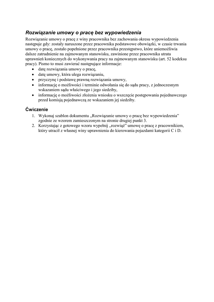 Rozwiązanie umowy o pracę bez wypowiedzenia Rozwiązanie umowy o pracę z winy pracownika bez zachowania okresu wypowiedzenia następuje gdy: zostały naruszone przez pracownika podstawowe obowiązki, w czasie trwania umowy o pracę, zostało popełnione przez pracownika przestępstwo, które uniemoŜliwia dalsze zatrudnienie na zajmowanym stanowisku, zawinione przez pracownika utrata uprawnień koniecznych do wykonywania pracy na zajmowanym stanowisku (art. 52 kodeksu pracy). Pismo to musi zawierać następujące informacje: • datę rozwiązania umowy o pracę, • datę umowy, która ulega rozwiązaniu, • przyczynę i podstawę prawną rozwiązania umowy, • informację o moŜliwości i terminie odwołania się do sądu pracy, z jednoczesnym wskazaniem sądu właściwego i jego siedziby, • informację o moŜliwości złoŜenia wniosku o wszczęcie postępowania pojednawczego przed komisją pojednawczą ze wskazaniem jej siedziby. Ćwiczenie 1. Wykonaj szablon dokumentu „Rozwiązanie umowy o pracę bez wypowiedzenia” zgodnie ze wzorem zamieszczonym na stronie drugiej punkt 3. 2. Korzystając z gotowego wzoru wypełnij „rozwiąŜ” umowę o pracę z pracownikiem, który utracił z własnej winy uprawnienia do kierowania pojazdami kategorii C i D. 3. Wzór „Rozwiązania umowy o pracę bez okresu wypowiedzenia”