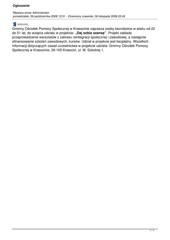 Ogłoszenie Wpisany przez Administrator poniedziałek, 06 października 2008 12:51 - Zmieniony czwartek, 06 listopada 2008 22:42 Gminny Ośrodek Pomocy Społecznej w Krasocinie zaprasza osoby bezrobotne w wieku od 22 do 51 lat, do wzięcia udziału w projekcie: „Daj sobie szansę”. Projekt zakłada przeprowadzenie warsztatów z zakresu reintegracji społecznej i zawodowej, a następnie sfinansowanie szkoleń zawodowych, kursów. Udział w projekcie jest bezpłatny. Wszelkich informacji dotyczących zasad uczestnictwa w projekcie udziela: Gminny Ośrodek Pomocy Społecznej w Krasocinie, 29-105 Krasocin, ul. M. Szkolnej 1. 1/1