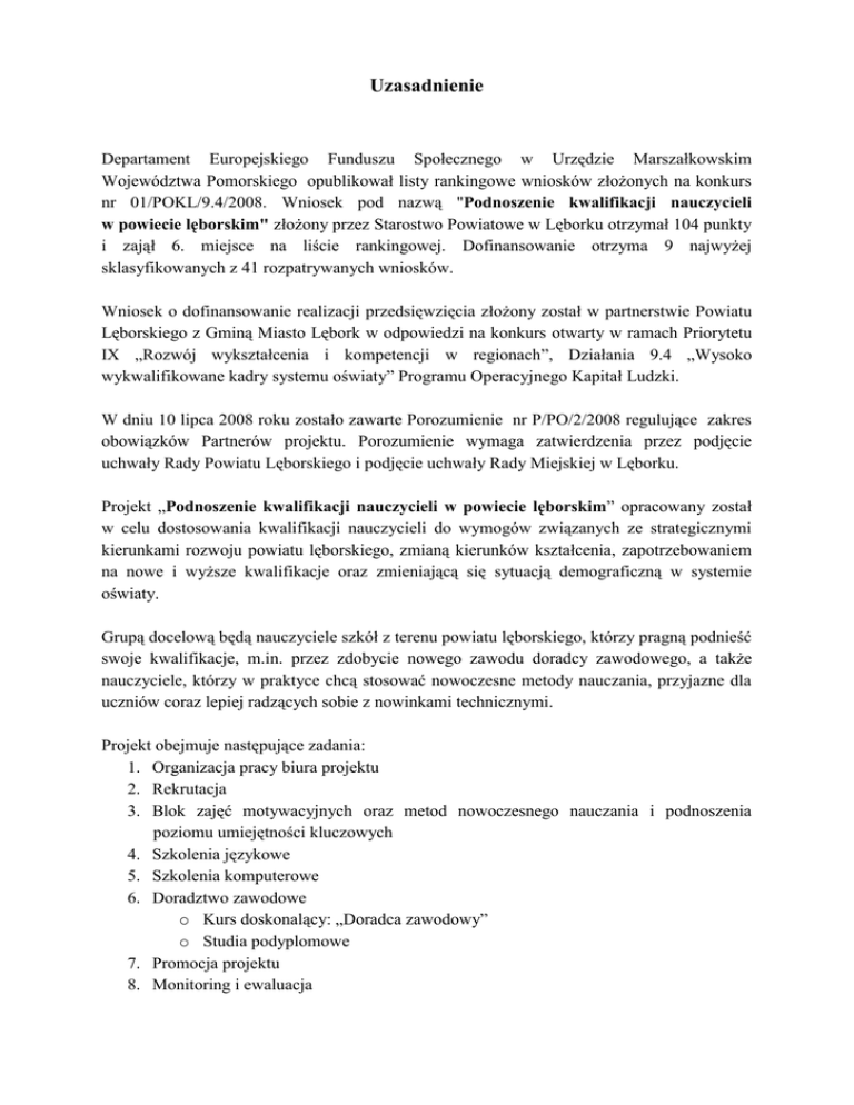 Uzasadnienie Departament Europejskiego Funduszu Społecznego w Urzędzie Marszałkowskim Województwa Pomorskiego opublikował listy rankingowe wniosków złożonych na konkurs nr 01/POKL/9.4/2008. Wniosek pod nazwą "Podnoszenie kwalifikacji nauczycieli w powiecie lęborskim" złożony przez Starostwo Powiatowe w Lęborku otrzymał 104 punkty i zajął 6. miejsce na liście rankingowej. Dofinansowanie otrzyma 9 najwyżej sklasyfikowanych z 41 rozpatrywanych wniosków. Wniosek o dofinansowanie realizacji przedsięwzięcia złożony został w partnerstwie Powiatu Lęborskiego z Gminą Miasto Lębork w odpowiedzi na konkurs otwarty w ramach Priorytetu IX „Rozwój wykształcenia i kompetencji w regionach”, Działania 9.4 „Wysoko wykwalifikowane kadry systemu oświaty” Programu Operacyjnego Kapitał Ludzki. W dniu 10 lipca 2008 roku zostało zawarte Porozumienie nr P/PO/2/2008 regulujące zakres obowiązków Partnerów projektu. Porozumienie wymaga zatwierdzenia przez podjęcie uchwały Rady Powiatu Lęborskiego i podjęcie uchwały Rady Miejskiej w Lęborku. Projekt „Podnoszenie kwalifikacji nauczycieli w powiecie lęborskim” opracowany został w celu dostosowania kwalifikacji nauczycieli do wymogów związanych ze strategicznymi kierunkami rozwoju powiatu lęborskiego, zmianą kierunków kształcenia, zapotrzebowaniem na nowe i wyższe kwalifikacje oraz zmieniającą się sytuacją demograficzną w systemie oświaty. Grupą docelową będą nauczyciele szkół z terenu powiatu lęborskiego, którzy pragną podnieść swoje kwalifikacje, m.in. przez zdobycie nowego zawodu doradcy zawodowego, a także nauczyciele, którzy w praktyce chcą stosować nowoczesne metody nauczania, przyjazne dla uczniów coraz lepiej radzących sobie z nowinkami technicznymi. Projekt obejmuje następujące zadania: 1. Organizacja pracy biura projektu 2. Rekrutacja 3. Blok zajęć motywacyjnych oraz metod nowoczesnego nauczania i podnoszenia poziomu umiejętności kluczowych 4. Szkolenia językowe 5. Szkolenia komputerowe 6. Doradztwo zawodowe o Kurs doskonalący: „Doradca zawodowy” o Studia podyplomowe 7. Promocja projektu 8. Monitoring i ewaluacja Realizacja projektu przyczyni się do: Podniesienia poziomu kwalifikacji zawodowych nauczycieli i zwiększenia liczby doradców zawodowych w szkołach oraz zwiększenia znajomości języków obcych – działania pozwolą na podniesienie jakości edukacji w powiecie lęborskim, Ułatwienia dostępu do informacji edukacyjnej i zawodowej dla uczniów, nauczycieli i rodziców poprzez zwiększenie liczby doradców zawodowych – działania pozwolą na bardziej świadome i trafniejsze podejmowanie decyzji w odniesieniu do wyboru ścieżki zawodowo – edukacyjnej, Realizacji zobowiązań wynikających z zapisów w ramowych statutach gimnazjów, szkół ponadgimnazjalnych oraz centrów kształcenia praktycznego i ustawicznego, Zwiększenia świadomości społecznej dotyczącej konieczności racjonalnego planowania rozwoju zawodowego przez jednostki, podejmowania właściwych decyzji, efektywnego przeciwdziałania bezrobociu, Zapewnienia powszechności i dostępności usług doradczych, Zwiększenia szansy znalezienia odpowiednio przygotowanego pracownika, który jest świadomy oczekiwań współczesnego rynku pracy. Zgodnie z Procedurą wyboru projektów do realizacji zamieszczoną w Dokumentacji Konkursowej, Instytucja Pośrednicząca na etapie podpisywania umowy o dofinansowanie projektu będzie wymagać w terminie 14 dni (termin biegnie od dnia wysłania beneficjentowi pisma informującego) od ubiegającego się o dofinansowanie złożenia m.in. dokumentu stanowiącego odpowiednią uchwałę właściwego organu jednostki samorządu terytorialnego lub inny właściwy dokument organu: który dysponuje budżetem wnioskodawcy (zgodnie z przepisami o finansach publicznych), która zatwierdza projekt lub udziela pełnomocnictwa do zatwierdzenia projektu współfinansowanego z Europejskiego Funduszu Społecznego. Niezłożenie żądanych załączników w komplecie w wyznaczonym terminie oznacza rezygnację z ubiegania się o dofinansowanie. Mając powyższe na względzie podjęcie niniejszej uchwały jest konieczne i uzasadnione.