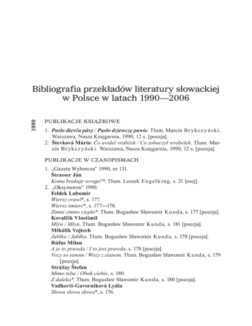 1990 Bibliografia przekładów literatury słowackiej w Polsce w latach 1990—2006 PUBLIK ACJE KSIĄŻKOWE 1. Paslo dievča pávy / Pasło dziewczę pawie. Tłum. Marcin Br ykcz y ń sk i. Warszawa, Nasza Księgarnia, 1990, 12 s. [poezja]. 2. Števková Mária: Čo uvidel vrabček / Co zobaczył wróbelek. Tłum. Marcin Br ykcz y ń sk i. Warszawa, Nasza Księgarnia, 1990, 12 s. [poezja]. PUBLIK ACJE W CZASOPISMACH 1. „Gazeta Wyborcza” 1990, nr 131. Štrasser Ján Komu brakuje wroga?*. Tłum. Leszek Engel k i ng, s. 21 [esej]. 2. „Oksymoron” 1990. Feldek Lubomír Wiersz crawl*, s. 177. Wiersz śmierć*, s. 177―178. Zimni zimno ciepło*. Tłum. Bogusław Sławomir Ku nd a, s. 177 [poezja]. Kovalčík Vlastimil Mlýn / Młyn. Tłum. Bogusław Sławomir Ku nd a, s. 181 [poezja]. Mihálik Vojtech Jablka / Jabłka. Tłum. Bogusław Sławomir Ku nd a, s. 178 [poezja]. Rúfus Milan A je to prawda / I to jest prawda, s. 178 [poezja]. Vozy so senom / Wozy z sianem. Tłum. Bogusław Sławomir Ku nd a, s. 179 [poezja]. Strážay Štefan Mimo teba / Obok ciebie, s. 180. Z daleka*. Tłum. Bogusław Sławomir Ku nd a, s. 180 [poezja]. Vadkerti‑Gavorníková Lydia Słowa słowa słowa*, s. 176. 188 Przekłady słowacko-polskie Túžba / Pragnienie. Tłum. Bogusław Sławomir Ku nd a, s. 176 [poezja]. Válek Miroslav Večer / Wieczór. Tłum. Bogusław Sławomir Ku nd a, s. 181 [poezja]. 3. „Płomyczek” 1990, nr 2, s. 10―11. Moric Rudo [ze zbioru Z poľovníckej kapsy, 1955 / Z myśliwskiej torby] 1991 Na cudzom mlieku / Na cudzym mleku [fragment]. Tłum. Hanna Oż o gowsk a [proza]. 4. „Poezja” 1990, nr 1/3. Buzássy Ján Delícius (Jeseň prišla) / Jesień nadeszła, s. 96―97. Ruka / Ręka, s. 96―97. Telo / Ciało. Tłum. Aleksander M igo, s. 96―97 [poezja]. Rúfus Milan A napokon láska / Na koniec miłości, s. 95. Dejiny trávy / Wspominanie trawy, s. 94―95. V starom lese / W starym lesie. Tłum. Aleksander M igo, s. 95 [poezja]. Štrpka Ivan Najtichšia báseň o cestovaní / Najcichszy wiersz o podróżowaniu, s. 97―98. Sekunda / Sekunda, s. 98. Światło, które ścieka…*, s. 99. Všetko je v škrupine / Wszystko jest w jajku. Tłum. Aleksander M igo, s. 98 [poezja]. 5. „Szpilki” 1990, nr 37, s. 13. Lenčo Ján Slepci / Ślepcy. Tłum. Stefania G r o d z ie ń sk a, s. 13 [proza]. Prekop Miroslav Związki*. Tłum. Stefania G r o d z ie ń sk a, s. 13 [proza]. Zelinka Milan Siedzenie*. Tłum. Stefania G r o d z ie ń sk a, s. 13 [proza]. PUBLIK ACJE KSIĄŻKOWE 1. Bajki z całego świata*. Oprac. i wybór Viera Ja nu sová. Tłum. Andrzej Ja go d z i ń sk i, Małgorzata Zió ł kowsk a ‑Ma z u r. Warszawa, Interpress, 1991, 159 [nlb. 1] s. [proza]. Człowiek, bawół i tygrys*. Človek a pes / Człowiek i pies. Dlaczego małpy nie budują domów*. Dlaczego psy szczerzą zęby*. Bibliografia przekładów literatury słowackiej… 189 Jak myszy wietrzyły złote pieniążki*. Jak wilk łowił ryby*. Jak zając z lisem ciżmy kupowali*. Jak zwierzątka przewracały niedźwiedzia na drugi bok*. Jeleń i jaguar*. Kot, kohút a líška / Kot, kogut i lis. Koza rohatá a jež / Koza uparciucha i jeż. Księżniczka Modrooczka i Ori*. Kto znajdzie słońce*. Leśny ojciec i leśna matka*. Niedźwiedzia Skórka i siedmiu braci*. Niedźwiedź i komar*. Niedźwiedź, piorun i dziewczyna*. O dwóch siostrach i czarodzieju*. O dziewczynce Marudce*. O rybaku Marcinie i złotej kaczce*. Placuszek*. Słomiany byczek*. Statočný cínový vojačik / Dzielny cynowy żołnierzyk. Śpiewająca żabka*. Trzynaście much*. 2. Chmelová Elena: Legendy z hôr / Baśnie z gór. Oprac. i wybór Elena C h melová. Tłum. Andrzej Cz cib or‑P iot rowsk i. Warszawa, Interpress, 1991, 212 s. [proza]. 3. Chmelová Elena: Rozprávky z perlového ostrova / Baśnie z wyspy Lanka. Tłum. Andrzej Cz cib or‑P iot r owsk i. Posł. Jan Fi l ip sk ý. Warszawa, Interpress, 1991, 228 s. [proza]. 4. O zlatom vajíčku a iné rozprávky / Bajki na dobranoc. Oprac. i wybór Viera Ja nu s ová. Tłum. Andrzej Ja go d z i ń sk i, Małgorzata Zió ł kowsk a ‑Ma z u r. Warszawa, Interpress, 1991, 58 [nlb. 2] s. [proza]. Ďuríčková Mária O Jankovi Polienkovi / O Janku Drewniaczku. O zlatom vajíčku / O złotym jajeczku. Ukradnutá pesnička / Skradziona piosenka. Živá voda / Żywa woda. Janusová Viera Ako boli zajačky u babky Kandiky / Jak zajączki przyszły do babci Aurelii. Ako sa vrabec Čvirik chcel stať kráľom / Jak wróbelek Ćwirkała został księciem. Ako sa zvieratká chceli stať muzikantmi / Muzykanci z Bremy. Ako šli myška Hryzka a žabka Kvakuľka do sveta / O tym, jak myszka Chrobotka z żabką Kumkałą wyruszyły w świat. 190 Przekłady słowacko-polskie Dary zajačieho kráľa / Podarunki króla zajęcy. Devčina so zlatým hrebeňom / Dziewczyna ze złotym grzebieniem. Korytnačka a pes / Żółw i pies. O Červenej čiapočke / Czerwony Kapturek. O kukučke a hodinárovi / O kukułce i zegarmistrzu. O mládencovi, čo sa stal kráľom / O młodzieńcu, który został królem. O myšiakovi, čo jedol mačky / O szczurze, który jadał koty. O myške a troch strieborných lístkoch / O myszce i trzech srebrnych listkach. O neobyčajnom slávikovi / O niezwykłym słowiku. O pavúkovi a Muške Bzučke / O pająku i muszce Brzęczce. Opica a krab / Małpa i krab. Opice a motýle / Małpa i motyl. Pavuk a korytňačka / Pająk i żółw. Slnečné dievčatko / Słoneczne dziewczątko. Smelý mravec / Śmiała mrówka. Šípová Ruženka / Głogowa Róża. Vlk a sedem kozliatok / O wilku i siedmiu koźlątkach. 5. Števková Mária: Čo uvidel vrabček / Co zobaczył wróbelek. Tłum. Marcin Br ykcz y ń sk i. Warszawa―Bratysława, Nasza Księgarnia/Mladé leta, 1991, 12 s. [poezja]. PUBLIK ACJE W CZASOPISMACH 1. „Brulion” 1991, nr 16. Hevier Daniel Fabryka*. Tłum. Leszek Engel k i ng, s. 208 [poezja]. 2. „Dekada Literacka” 1991, nr 9. Rúfus Milan Histor