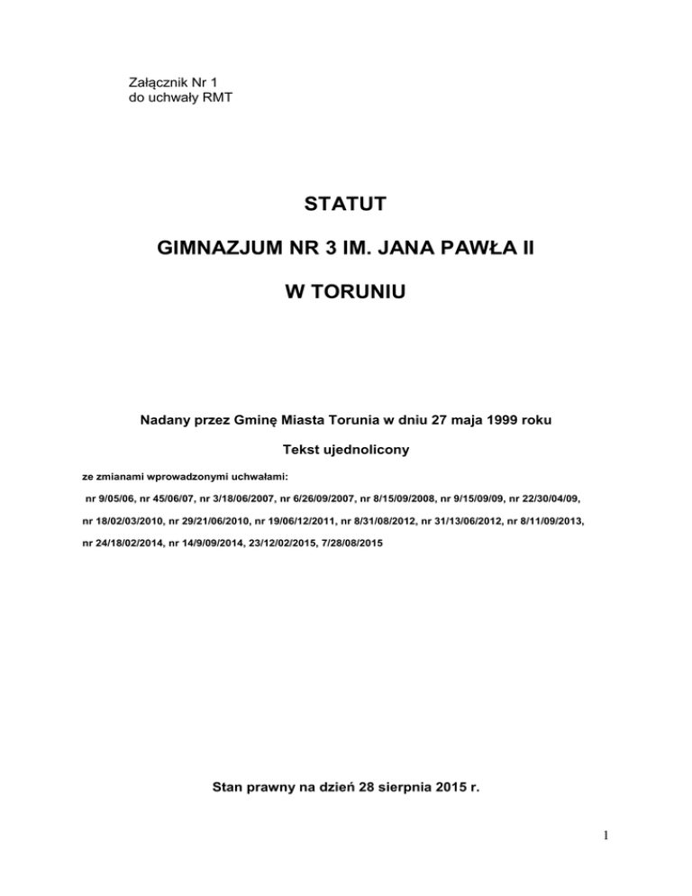 Załącznik Nr 1 do uchwały RMT STATUT GIMNAZJUM NR 3 IM. JANA PAWŁA II W TORUNIU Nadany przez Gminę Miasta Torunia w dniu 27 maja 1999 roku Tekst ujednolicony ze zmianami wprowadzonymi uchwałami: nr 9/05/06, nr 45/06/07, nr 3/18/06/2007, nr 6/26/09/2007, nr 8/15/09/2008, nr 9/15/09/09, nr 22/30/04/09, nr 18/02/03/2010, nr 29/21/06/2010, nr 19/06/12/2011, nr 8/31/08/2012, nr 31/13/06/2012, nr 8/11/09/2013, nr 24/18/02/2014, nr 14/9/09/2014, 23/12/02/2015, 7/28/08/2015 Stan prawny na dzień 28 sierpnia 2015 r. 1 ROZDZIAŁ 1. POSTANOWIENIA OGÓLNE §1 1. Publiczna szkoła nosi nazwę: Gimnazjum nr 3 im Jana Pawła II w Toruniu (zwanej dalej „gimnazjum”). 2. Siedziba gimnazjum: Toruń ul. Żwirki i Wigury 49. 3. Gimnazjum jest jednostką budżetową prowadzoną przez Gminę Miasta Toruń. 4. Organem sprawującym nadzór pedagogiczny nad gimnazjum jest KujawskoPomorski Kurator Oświaty w Bydgoszczy. 5. Czas trwania cyklu kształcenia wynosi 3 lata i kończy się egzaminem dającym możliwość dalszego kształcenia się. 6. Gimnazjum działa na podstawie ustawy z dnia 7 września 1991r. o systemie oświaty (tekst jednolity Dz. U.2004 r. Nr 256, poz. 2572 z późniejszymi zmianami) oraz Rozporządzenie Ministra Edukacji Narodowej z dn.25 maja 2001r. w sprawie ramowych statutów publicznego przedszkola oraz publicznych szkół (Dz. U. 2001r. Nr 61 poz. 624 ze zmianami). ROZDZIAŁ 2. CELE I ZADANIA GIMNAZJUM §2 1. Gimnazjum zapewnia uczniom pełny rozwój umysłowy, moralno - emocjonalny i fizyczny w zgodzie z ich potrzebami i możliwościami psychofizycznymi w warunkach poszanowania ich godności osobistej oraz wolności światopoglądowej i wyznaniowej. 2. Gimnazjum realizuje cele i zadania określone w ustawie o systemie oświaty oraz przepisach wykonawczych do ustawy. 3. Gimnazjum realizuje cele i zadania, w tym działania związane z promocją i ochroną zdrowia oraz kształtowaniem pożądanego środowiska wychowawczego, stosownie do warunków gimnazjum oraz potrzeb i wieku uczniów zgodnie z przyjętym programem wychowawczym i profilaktycznym szkoły. 4. Do podstawowych celów działalności gimnazjum należy: 1) nauczanie i kształcenie umiejętności, 2) wychowanie, 3) sprawowanie opieki nad młodzieżą podczas jej pobytu w gimnazjum. 5. Do zadań gimnazjum należy m.in.: 1) organizowanie warunków do zdobycia wiedzy i umiejętności wystarczających do uzyskania świadectwa ukończenia gimnazjum, 2) zapewnienie uczniom warunków rozwoju talentów i zainteresowań poznawczych, społecznych, artystycznych i sportowych, zgodnie z możliwościami szkoły, 3) podejmowanie działań w kierunku promocji i ochrony zdrowia oraz kształtowania pożądanego środowiska wychowawczego, stosownie do warunków gimnazjum oraz potrzeb i wieku uczniów, 4) przygotowanie do świadomego wyboru dalszego kierunku edukacji oraz wyboru zawodu, 5) podejmowanie działań na rzecz pomocy materialnej dla uczniów znajdujących się w trudnej sytuacji finansowej, 6) sprawowanie opieki nad młodzieżą podczas lekcji i zajęć pozalekcyjnych: zapewnienie im pełnego bezpieczeństwa w szkole i w czasie zajęć organizowanych poza terenem szkoły, 2 6. 7. 8. 9. 7) zapewnienie uczniom opieki pedagogicznej i, w miarę możliwości, opieki zdrowotnej. Programy wychowawczy i profilaktyczny, o których mowa w ust. 3, uchwala Rada Rodziców w porozumieniu z Radą Pedagogiczną. Podlegają one okresowej ewaluacji. (uchylony). Działania związane z pomocą uczniom w wyborze szkoły na kolejnym etapie edukacyjnym i określeniem preferencji przy wyborze zawodu gimnazjum realizuje w oparciu o szkolny system doradztwa edukacyjno - zawodowego. Szkolny system doradztwa edukacyjno - zawodowego realizuje zadania służące zapewnieniu uczniom i rodzicom: 1) informacji o ofercie edukacyjnej na kolejnym etapie edukacyjnym i związanych z nią wymaganiach, 2) pomocy w dostosowaniu wyborów uczniów do ich rzeczywistych możliwości, 3) zapoznania uczniów i rodziców z ogólną i lokalną sytuacją na rynku pracy, 4) indywidualnego doradztwa dotyczącego wyboru szkoły lub zawodu. §3 1. Gimnazjum realizuje swoje zadania poprzez: 1) tworzenie klas z autorskimi programami nauczania, 2) prowadzenie innowacji i eksperymentów pedagogicznych z obowiązującymi przepisami, 3) tworzenie własnego programu wychowawczego i profilaktycznego, 4) tworzenie wewnątrzszkolnego systemu oceniania. zgodnie ROZDZIAŁ 3. ORGANIZACJA SZKOŁY §4 Terminy rozpoczynania i kończenia zajęć dydaktyczno – wychowawczych, przerw świątecznych oraz ferii zimowych i letnich określają przepisy Ministerstwa Edukacji Narodowej w sprawie organizacji roku szkolnego. §5 1. Szczegółową organizację nauczania, wychowania i opieki w danym roku szkolnym określa arkusz organizacji gimnazjum, wraz z aneksami opracowany przez dyrektora gimnazjum z uwzględnieniem szkolnego planu nauczania ustalonego na podstawie ramowego planu nauczania. 2. W arkuszu organizacji gimnazjum zamieszcza się w szczególności liczbę pracowników gimnazjum, w tym pracowników zajmujących stanowiska kierownicze, ogólną liczbę godzin zajęć edukacyjnych finansowanych ze środków przydzielonych przez organ prowadzący gimnazjum. 3. Dyrektor gimnazjum, biorąc pod uwagę warunki lokalowe i możliwości organizacyjne szkoły, ustala w danym roku szkolnym dodatkowe dni wolne od zajęć dydaktyczno-wychowawczych w liczbie 8. 4. Zaproponowane przez dyrektora dni wolne od zajęć dydaktycznowychowawczych muszą być skonsultowane z radą pedagogiczną, radą rodziców i samorządem uczniowskim. 5. Po uzyskaniu opinii organów o których mowa w ust. 4, do dnia 30 września każdego roku, dyrektor podaje do ogólnej wiadomości. 3 §6 1. Podstawową jednostką organizacyjną gimnazjum jest oddział złożony z uczniów, którzy w jednorocznym kursie nauki danego roku szkolnego uczą się zajęć edukacyjnych obowiązkowych określonych szkolnym planem nauczania zgodnym z ramowym