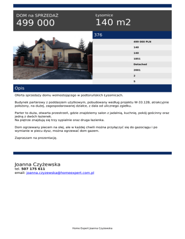 Łysomice DOM na SPRZEDAŻ 140 m2 499 000 376 499 000 PLN 140 140 1851 Detached 2001 2 5 Opis Oferta sprzedaży domu wolnostojącego w podtoruńskich Łysomicach. Budynek parterowy z poddaszem użytkowym, pobudowany według projektu W-33.12B, atrakcyjnie położony, na dużej, zagospodarowanej działce, z dala od ulicznego zgiełku. Parter to duża, otwarta przestrzeń, gdzie znajdziemy salon z jadalnią, kuchnię, pokój gościnny oraz jedną z dwóch łazienek. Na piętrze znajdują się trzy sypialnie oraz druga łazienka. Dom ogrzewany piecem na olej, ale w każdej chwili można przyłączyć się do gazociągu i po wymianie w piecu dysz, można ogrzewać dom gazem. Zapraszam na prezentację. Joanna Czyżewska tel. 507 175 611 email: [email protected] Home Expert Joanna Czyżewska Powered by TCPDF (www.tcpdf.org)