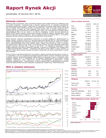 Raport Rynek Akcji poniedziałek, 30 stycznia 2017, 08:55 Sytuacja rynkowa Główne indeksy światowe Piątkowa sesja na krajowym rynku przyniosła niewielki wzrost indeksu WIG przy spadkowej sesji na rynkach eurolandu i neutralnej sesji w Stanach Zjednoczonych. W otoczeniu zewnętrznym zamknięcie tygodnia jest drugim z rzędu dniem o charakterze przystanku bądź lekkiej korekty, na tym tle krajowy rynek odznacza się póki co relatywną siłą, a przy tym wciąż mocna jest także krajowa waluta. W piątek na rynek napłynęły dość istotne dane ze Stanów Zjednoczonych – rozczarowały zarówno zamówienia na dobra trwałego użytku, jak i zannualizowany wstępny odczyt amerykańskiego PKB w IV kw. 2016 r. (+1,9% vs. oczekiwane +2,2%). Na plus wyróżnił się jednak finalny odczyt Indeksu Uniwersytetu Michigan (wskaźnik zaufania konsumentów), który okazał się powyżej odczytu wstępnego – jest to najwyższy odczyt od stycznia 2004 r., co wyraźnie pokazuje, jak duży optymizm panuje wśród amerykańskich konsumentów. Wśród istotnych wydarzeń kształtujących sentyment na rynkach globalnych, zaplanowanych na bieżący tydzień, wymienić można m.in. pierwszą tegoroczną decyzję FED ws. stóp procentowych (środa; prawdopodobieństwo podwyżki oceniane jest przez rynek terminowy obecnie na 13,5%), dane z amerykańskiego rynku pracy (piątek), dane z Japonii oraz decyzja ws. stóp % (wtorek), czy wstępne dane o PKB w IV kw. 2016 r. w eurolandzie (wtorek). Na jutro zaplanowany jest także wstępny szacunek dynamiki PKB w Polsce za cały 2016 r. W dzisiejszym kalendarium z kolei uwagę przykuwać może odczyt wskaźnika nastrojów w biznesie w eurolandzie oraz wstępne dane o inflacji konsumenckiej z Niemiec - oczekiwany jest dalszy wzrost inflacji w ujęciu rocznym, co jednak w dużej mierze można przypisać czynnikowi niskiej bazy (rok temu okolice dołka w cenach ropy naftowej). wartość zm% 1D 11 814,3 -0,3 CAC40 4 840,0 -0,6 FTSE100 7 184,5 0,3 32 714,6 -0,6 2 294,7 -0,1 20 093,8 0,0 SHC* 3 159,2 0,3 NASDAQ 5 660,8 0,1 BOVESPA 66 034,0 -0,2 NIKKEI* 19 368,9 -0,5 HANG SENG* 23 360,8 -0,1 XU100 84 866,3 1,2 1 180,0 -1,3 DAX BUX S&P500 DJIA RTS * - Zmiana na godzinę 8:38 Poranny odczyt o sprzedaży detalicznej za grudzień w Japonii przyniósł rozczarowanie (+0,6% r/r vs. oczekiwane 1,3% r/r). Negatywnie zareagował japoński TOPIX (-0,35%). Kontrakty terminowe na główne indeksy zachodnioeuropejskie notują obecnie umiarkowane minusy. Czynnikiem, który zwiększył napięcie m.in. w stosunkach UE ze Stanami Zjednoczonymi jest dekret Trumpa względem imigrantów. Warto obserwować kwestię amerykańskiego protekcjonizmu, przede wszystkim gospodarczego – niewykluczone, że jest to obecnie jeden z poważniejszych czynników ryzyka dla podtrzymania mocnych nastrojów na globalnych rynkach akcji. /Paweł Szewczyk/ Indeksy Polskie WIG 55 657,7 0,2 2 084,1 0,2 MWIG40 4 644,6 0,1 SWIG80 15 170,9 0,8 312,4 0,0 USD/PLN 4,05 -0,1 EUR/PLN 4,33 0,0 EUR/USD 1,07 0,0 WIG20 NCINDEX WIG w układzie dziennym Waluty W IG - Da ily 2017-01-27 O pen 55615.6, Hi 55704.3, Lo 55258.2, Clo se 55657.7 (0.2%) MA(Clo se ,15) 58,000 = 53,956.01, MA1(Clo se ,25) = 53,125.26 57460.4 56,000 54,000 53808.9 Obligacje 52,000 50,000 yield % zm p.b. 1D Polska 10YT 3,90 -4 USA 10YT 2,48 -1 48,000 Surowce 46,000 Jul Aug Se p O ct Nov Dec W IG - Volum e = 1,028,897,472.00 2017 2,500M Ropa WTI (USD/bbl) 52,9 -0,4 Złoto (USD/oz) 1 191,3 0,0 Miedź (USD/t) 5 883,5 0,8 2,000M 1,500M 1,000M WIG: Największe wzrosty i spadki (%) 500M W IG - RSI(15) = 81.85 70 RADPOL 13,9 INDYKPOL 13,7 PFLEIDERER GROUP 10,7 SONEL 30 W IG - Co m posite Index = 200.61, MA13 = 176.42, MA33 = 178.65 250 200 W IG - ADX(14) = 53.35, +DI = 48.04, -DI = 10.31 INTEGERPL 9,5 PROCAD -4,3 TATRY MOUNTAIN 6 -4,4 HUBSTYLE SA -4,6 150 ELKOP 100 HYPERION 50 10,0 -6,0 -10,3 -20,0 -10,0 - 10,0 20,0 40 30 Źródło: Bloomberg 20 10 C reated with A miBroker - advanc ed c harting and tec hnic al analys is s oftware. http://www.amibroker.c om Objaśnienia, szczegółowe informacje prawne, jak i wyłączenia odpowiedzialności znajdują się na ostatnich dwóch stronach raportu. Zlecenia telefoniczne: Klienci BM Alior Banku (z telefonów komórkowych i stacjonarnych) 19 503 (z sieci Play: 12 19 503), z zagranicy +48 12 19 503, +48 12 370 74 00, opłaty za połączenie z infolinią: z telefonów stacjonarnych – w kraju opłata jak za połączenie lokalne, z telefonów komórkowych i zagranicy – opłata zgodna z cennikiem operatora danej sieci komórkowej, Internet: www.bm.aliorbank.pl Klienci BM przejętego z Banku BPH: 0 801 130 005 (koszt jak za jednostkę taryfikacyjną), 58 308 56 11 (koszt wg taryfy operatora), Internet: www.fuzja.aliorbank.pl Raport Rynek Akcji Wybrane wydarzenia w spółkach AILLERON NWZA KĘTY Wprowadzenie do obrotu na GPW 24.683 akcji zwykłych na okaziciela serii G PRIMAMODA NWZA Wybrane komunikaty ze spółek 11BIT Z założeń programu motywacyjnego 11 bit studios na lata 2017-2019 wynika, że skumulowany zysk brutto grupy kapitałowej w najbliższych trzech latach powinien wynieść blisko 71,2 mln zł. Łączne przychody ze sprzedaży grupy w tym okresie mają sięgnąć 126,4 mln zł - podała spółka. ELEKTROTIM Elektrotim zawiązał 1,95 mln zł rezerwy na kary umowne do umowy zawartej z Wojskowym Zarządem Infrastruktury - podała spółka w komunikacie. Zawiązanie rezerwy na kary umowne będzie miało bezpośredni wpływ na jednostkowy i skonsolidowany wynik finansowy za 2016 r. MCI Spółka MCI Capital zaprosiła do sprzedaży do 835 tys. swoich akcji, oferując 8,82 zł za papier poinformował pośredniczący w transakcji. KREC Krynicki Recykling podpisał umowę z Ardagh Glass na dostawę stłuczki szkła opakowaniowego w 2017 roku o wartości około 16 mln zł netto - poinformowała spółka. PGE Sąd Najwyższy wydał wyrok w sprawie ustalenia wysokości korekty rocznej kosztów osieroconych za rok 2