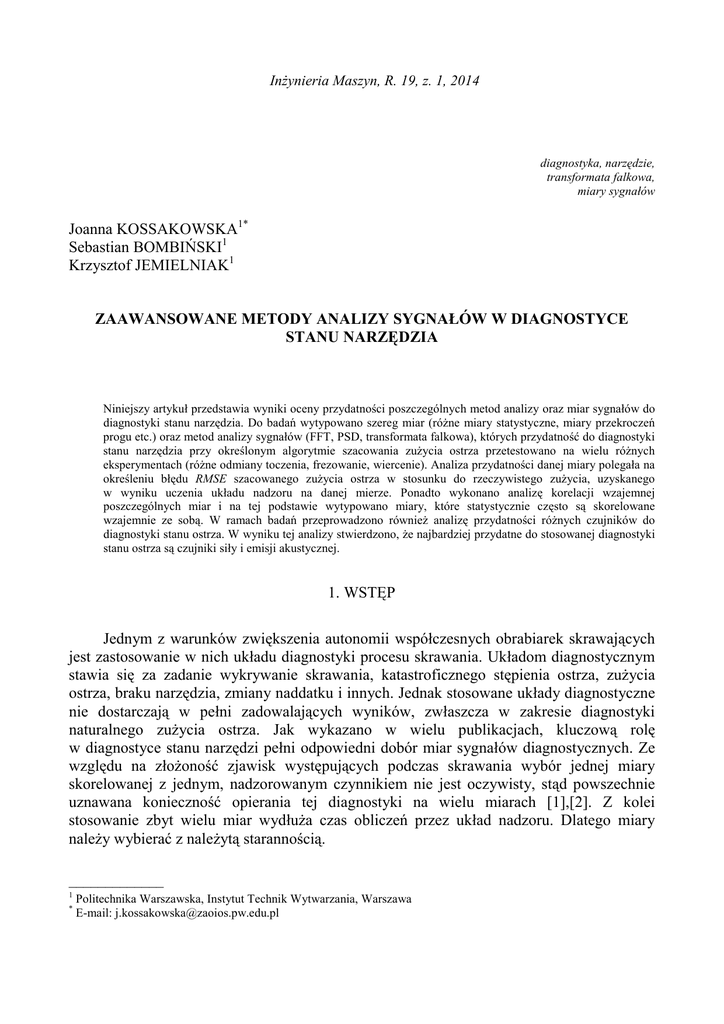 Inżynieria Maszyn, R. 19, z. 1, 2014 diagnostyka, narzędzie, transformata falkowa, miary sygnałów Joanna KOSSAKOWSKA1* Sebastian BOMBIŃSKI1 Krzysztof JEMIELNIAK1 ZAAWANSOWANE METODY ANALIZY SYGNAŁÓW W DIAGNOSTYCE STANU NARZĘDZIA Niniejszy artykuł przedstawia wyniki oceny przydatności poszczególnych metod analizy oraz miar sygnałów do diagnostyki stanu narzędzia. Do badań wytypowano szereg miar (różne miary statystyczne, miary przekroczeń progu etc.) oraz metod analizy sygnałów (FFT, PSD, transformata falkowa), których przydatność do diagnostyki stanu narzędzia przy określonym algorytmie szacowania zużycia ostrza przetestowano na wielu różnych eksperymentach (różne odmiany toczenia, frezowanie, wiercenie). Analiza przydatności danej miary polegała na określeniu błędu RMSE szacowanego zużycia ostrza w stosunku do rzeczywistego zużycia, uzyskanego w wyniku uczenia układu nadzoru na danej mierze. Ponadto wykonano analizę korelacji wzajemnej poszczególnych miar i na tej podstawie wytypowano miary, które statystycznie często są skorelowane wzajemnie ze sobą. W ramach badań przeprowadzono również analizę przydatności różnych czujników do diagnostyki stanu ostrza. W wyniku tej analizy stwierdzono, że najbardziej przydatne do stosowanej diagnostyki stanu ostrza są czujniki siły i emisji akustycznej. 1. WSTĘP Jednym z warunków zwiększenia autonomii współczesnych obrabiarek skrawających jest zastosowanie w nich układu diagnostyki procesu skrawania. Układom diagnostycznym stawia się za zadanie wykrywanie skrawania, katastroficznego stępienia ostrza, zużycia ostrza, braku narzędzia, zmiany naddatku i innych. Jednak stosowane układy diagnostyczne nie dostarczają w pełni zadowalających wyników, zwłaszcza w zakresie diagnostyki naturalnego zużycia ostrza. Jak wykazano w wielu publikacjach, kluczową rolę w diagnostyce stanu narzędzi pełni odpowiedni dobór miar sygnałów diagnostycznych. Ze względu na złożoność zjawisk występujących podczas skrawania wybór jednej miary skorelowanej z jednym, nadzorowanym czynnikiem nie jest oczywisty, stąd powszechnie uznawana konieczność opierania tej diagnostyki na wielu miarach [1],[2]. Z kolei stosowanie zbyt wielu miar wydłuża czas obliczeń przez układ nadzoru. Dlatego miary należy wybierać z należytą starannością. _____________ 1 * Politechnika Warszawska, Instytut Technik Wytwarzania, Warszawa E-mail: [email protected] 90 Joanna KOSSAKOWSKA, Sebastian BOMBIŃSKI, Krzysztof JEMIELNIAK 2. MIARY SYGNAŁÓW W DIAGNOSTYCE PROCESU SKRAWANIA W badaniach laboratoryjnych najczęściej do wyznaczania miar stosuje się proste metody statystyczne do analizy sygnałów w dziedzinie czasu (46% publikacji). Jednak często okazują się one być niewystarczająco dobrze skorelowane ze zużyciem ostrza, stąd zachodzi potrzeba poszukiwania miar sygnałów poddanych przetworzeniu. Coraz częściej do wyznaczania miar stosuje się również analizę w dziedzinie częstotliwościowej (22% publikacji) oraz czasowo-częstotliwościowej (29% publikacji). W niektórych pracach stosuje się kilka metod analizy sygnałów jednocześnie, np. metody analizy sygnałów w dziedzinie czasu oraz w dziedzinie czasowo-częstotliwościowej zastosowano z sukcesem m.in. w [22],[23],[24].W dziedzinie czasu jako miary korelacji sygnału ze stanem narzędzia stosowane są zazwyczaj miary statystyczne: wartość średnia [3],[7],[8], wartość skuteczna, [5], moc i energia sygnału [6], kurtoza i skośność [7],[8], odchylenie standardowe, wariancja, moment [8], czy współczynnik szczytu [9]. Proponowane są również miary zależności stosunku między składowymi siły skrawania, jako miary niezależnej od warunków skrawania [10],[11],[12]. Bardzo dobrą miarą do analizy stanu narzędzia na podstawie surowego sygnału emisji akustycznej okazuje się być również liczba przekroczeń progu lub czas przebywania sygnału ponad danym progiem [15]. W dziedzinie częstotliwości najczęstszymi algorytmami wykorzystywanymi w diagnostyce procesu skrawania są Szybka Transformata Fouriera (FFT) oraz Gęstość Widmowa Mocy (PSD). Ale zdarzają się również inne metody, np. filtrowanie czy cepstrum. W większości publikacji podejmowane są próby wykazania miar widm sygnałów, skorelowanych ze zużyciem ostrza. W FFT i PSD wyznaczana jest najczęściej energia widma [18],[19]. W [16],[20] analizowana jest wartości amplitudy oraz częstotliwości dla kilku dominujących prążków. Niekiedy stosowane są miary statystyczne rozkładu widma, takie jak wartość średnia, odchylenie bezwzględne, kurtoza, skośność i inne [17] wyznaczane jest pole pod krzywą widma. Z kolei w [26] wyznaczana jest moc sygnału w poszczególnych pasmach częstotliwości. W dziedzinie czas-częstotliwość wykorzystuje się obecnie najczęściej transformatę falkową (WT). Szeroko zakrojone studium na temat zastosowania WT do diagnostyki procesu skrawania przedstawiono w [22],[24]. Tamże zastosowano wiele miar sygnałów pasmowych, uzyskanych w wyniku WP (Pakietowa Transformata Falkowa) do diagnostyki stanu narzędzia podczas toczenia. Oprócz standardowych miar statystycznych, takich jak wartość średnia wartości bezwzględnej czy wariancja, z powodzeniem zastosowano energię oraz liczbę przekroczeń progu oraz procentowy udział czasu przebywania sygnału ponad progiem dla trzech różnych progów. W większości prac miary sygnałów dobierane są arbitralnie bądź też na podstawie wnikliwej analizy charakteru sygnału podczas konkretnych warunków obróbki. Budując układ nadzoru, który ma charakteryzować się uniwersalnością i wszechstronnym zastosowaniem niezależnie od rodzaju prowadzonego procesu, nie należy zakładać, że dla każdego rodzaju procesu od początku analizowany będzie charakter sygnałów i na tej podstawie dobierane będą miary sygnałów diagnostycznych. Zatem należy zawczasu dobrać