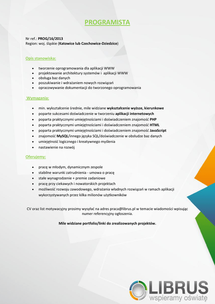 PROGRAMISTA Nr ref.: PROG/16/2013 Region: woj. śląskie (Katowice lub Czechowice-Dziedzice) Opis stanowiska: tworzenie oprogramowania dla aplikacji WWW projektowanie architektury systemów i aplikacji WWW obsługa baz danych poszukiwanie i wdrażaniem nowych rozwiązań opracowywanie dokumentacji do tworzonego oprogramowania Wymagania: min. wykształcenie średnie, mile widziane wykształcenie wyższe, kierunkowe poparte sukcesami doświadczenie w tworzeniu aplikacji internetowych poparta praktycznymi umiejętnościami i doświadczeniem znajomość PHP poparta praktycznymi umiejętnościami i doświadczeniem znajomość HTML poparta praktycznymi umiejętnościami i doświadczeniem znajomość JavaScript znajomość MySQL/innego języka SQL/doświadczenie w obsłudze baz danych umiejętność logicznego i kreatywnego myślenia nastawienie na rozwój Oferujemy: pracę w młodym, dynamicznym zespole stabilne warunki zatrudnienia - umowa o pracę stałe wynagrodzenie + premie zadaniowe pracę przy ciekawych i nowatorskich projektach możliwość rozwoju zawodowego, wdrażania władnych rozwiązań w ramach aplikacji wykorzystywanych przez kilka milionów użytkowników CV oraz list motywacyjny prosimy wysyłać na adres [email protected] w temacie wiadomości wpisując numer referencyjny ogłoszenia. Mile widziane portfolio/linki do zrealizowanych projektów.