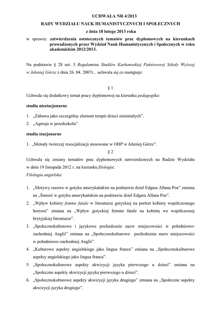 UCHWAŁA NR 4/2013 RADY WYDZIAŁU NAUK HUMANISTYCZNYCH I SPOŁECZNYCH z dnia 18 lutego 2013 roku w sprawie: zatwierdzenia ostatecznych tematów prac dyplomowych na kierunkach prowadzonych przez Wydział Nauk Humanistycznych i Społecznych w roku akademickim 2012/2013. Na podstawie § 28 ust. 5 Regulaminu Studiów Karkonoskiej Państwowej Szkoły WyŜszej w Jeleniej Górze z dnia 26. 04. 2007r., uchwala się co następuje: §1 Uchwala się dodatkowy temat pracy dyplomowej na kierunku pedagogika: studia niestacjonarne 1. „Zabawa jako szczególny element terapii dzieci nieśmiałych”. 2. „Agresja w przedszkolu”. studia stacjonarne 1. „Metody twórczej resocjalizacji stosowane w OHP w Jeleniej Górze”. §2 Uchwala się zmiany tematów prac dyplomowych zatwierdzonych na Radzie Wydziału w dniu 19 listopada 2012 r. na kierunku filologia: Filologia angielska: 1. „Motywy rasowe w gotyku amerykańskim na podstawie dzieł Edgara Allana Poe” zmiana na „Śmierć w gotyku amerykańskim na podstawie dzieł Edgara Allana Poe”. 2. „Wpływ kobiety femme fatale w literaturze gotyckiej na portret kobiety współczesnego horroru” zmiana na „Wpływ gotyckiej femme fatale na kobietę we współczesnej brytyjskiej literaturze”. 3. „Społecznokulturowe i językowe pochodzenie nazw miejscowości w południowozachodniej Anglii” zmiana na „Społecznokulturowe pochodzenie nazw miejscowości w południowo-zachodniej Anglii”. 4. „Kulturowe aspekty angielskiego jako lingua franca” zmiana na „Społecznokulturowe aspekty angielskiego jako lingua franca”. 5. „Społecznokulturowe aspekty akwizycji języka pierwszego u dzieci” zmiana na „Społeczne aspekty akwizycji języka pierwszego u dzieci”. 6. „Społecznokulturowe aspekty akwizycji języka drugiego” zmiana na „Społeczne aspekty akwizycji języka drugiego”. 7. „Rola płci w uczeniu się gramatyki u uczniów szkoły podstawowej” zmiana na „Rola płci w uczeniu się gramatyki angielskiej u dorosłych”. 8. „Wykorzystanie gier w nauczaniu słownictwa dzieci w wieku 7-10 lat” zmiana na „Wykorzystanie gier w nauczaniu słownictwa obcojęzycznego dzieci w wieku 7-10 lat”. 9. „Wykorzystanie strategii uczenia się w nauczaniu słownictwa u dzieci w wieku 10 lat” zmiana na „Wykorzystanie strategii uczenia się w nauczaniu słownictwa obcojęzycznego u dzieci w wieku 10 lat”. 10. „Zastosowanie mnemotechnik w nauczaniu słownictwa dzieci w wieku 10-12 lat” zmiana na „Zastosowanie mnemotechnik w nauczaniu słownictwa obcojęzycznego dzieci w wieku 10-12 lat”. 11. „Wykorzystanie bajek w nauczaniu kultury brytyjskiej uczniów w wieku 13-15 lat” zmiana na „Wykorzystanie bajek w nauczaniu języka angielskiego uczniów w wieku 1315 lat”. 12. „Typ pamięci jako czynnik determinujący dobór środków nauczania języka obcego” zmiana na „Typ pamięci jako czynnik determinujący dobór środków nauczania języka obcego w grupach dorosłych”. 13. „Zastosowanie piosenek w nauczaniu słownictwa dzieci w wieku 7-10 lat” zmiana na „Zastosowanie piosenek w nauczaniu słownictwa obcojęzycznego dzieci w wieku 7-10 lat”. 14. „Zastosowanie pomocy wizualnych w nauczaniu słownictwa dzieci w wieku 3-5 lat” zmiana na „Zastosowanie pomocy wizualnych w nauczaniu słownictwa obcojęzycznego dzieci w wieku 3-5 lat”. 15. „Wykorzystanie legend i biografii w nauczaniu obcej kultury i języka w grupach dorosłych – na przykładzie historii Ŝycia Lady Godivy i Henryka VIII” zmiana na „Wykorzystanie legend i biografii w nauczaniu języka obcego w grupach dorosłych – na przykładzie historii Ŝycia Lady Godivy i Henryka VIII” §3 Uchwala się zmiany tematów prac dyplomowych zatwierdzonych na Radzie Wydziału w dniu 19 listopada 2012 r. na kierunku pedagogika: studia niestacjonarne 1. „Funkcjonowanie w środowisku szkolnym dziewięcioletniego dziecka z rodziny dotkniętej ubóstwem” zmiana na „Rola zasad nauczania w zintegrowanej edukacji wczesnoszkolnej”. 2. „Formy zagospodarowania czasu wolnego przez uczniów klas szóstych szkoły podstawowej” zmiana na „Rola środków przekazu w wypełnianiu czasu wolnego uczniów klas szóstych”. 3. „Przywileje kobiet w ciąŜy w opiniach młodzieŜy” zmiana na „Przywileje kobiet w ciąŜy w opinii młodzieŜy studiującej”. 4. „Internet a rozwój młodego człowieka w ocenach młodzieŜy studiującej” zmiana na „Wiedza o zdrowiu wśród młodzieŜy studiującej w KPSW w Jeleniej Górze”. studia stacjonarne 1. „Problem eutanazji w opinii pensjonariuszy Domów Pomocy Społecznej” zmiana na „Problem eutanazji w opinii pensjonariuszy i pracowników Domów Pomocy Społecznej”. 2. „Znaczenie sankcji w resocjalizacji osadzonych” zmiana na „Znaczenie aresztu tymczasowego w resocjalizacji osadzonych”. 3. „Proces readaptacji społecznej skazanych dorosłych po odbyciu kary pozbawienia wolności” zmiana na „Zachowania ryzykowne wychowanków Domu Dziecka w Jeleniej Górze oraz ich profilaktyka”. 4. „Działalność Miejskiej Biblioteki Publicznej w środowisku lokalnym na przykładzie Gryfowa Śląskiego” zmiana na „Działalność Biblioteki Publicznej Miasta i Gminy Gryfów Śląski w środowisku lokalnym”. §4 Uchwala się zmiany tematów prac dyplomowych zatwierdzonych na Radzie Wydziału w dniu 19 listopada 2012 r. na kierunku dziennikarstwo i komunikacja społeczna: 1. „Prasa warszawska w okresie powstania 1944” zmiana na „Powstanie Warszawskie1944 w świetle polskiej literatury naukowej i publicystycznej”. 2. „Kreowanie wizerunku poprzez portale społecznościowe” zmiana na „Kreowanie wizerunku z wykorzystaniem portali społecznościowych”. 3. „Moda w Internecie - społeczność blogów modowych” zmiana na „Moda w Internecie społeczność blogów modowych. Analiza zawartości”. 4. „Marketing w Internecie” zmiana na „Social media jako główne narzę