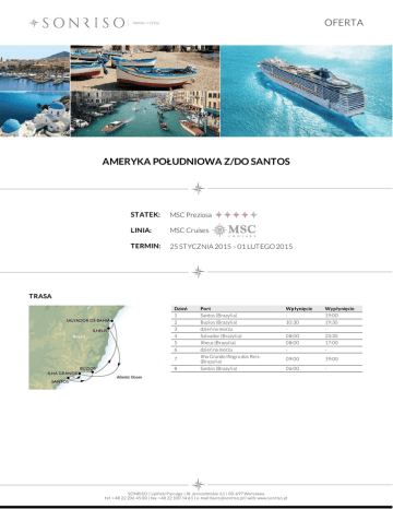 OFERTA AMERYKA POŁUDNIOWA Z/DO SANTOS STATEK: MSC Preziosa LINIA: MSC Cruises TERMIN: 25 STYCZNIA 2015 – 01 LUTEGO 2015 TRASA Dzień 1 2 3 4 5 6 7 8 Port Santos (Brazylia) Buzios (Brazylia) dzień na morzu Salvador (Brazylia) Ilheus (Brazylia) dzień na morzu Ilha Grande/Angra dos Reis (Brazylia) Santos (Brazylia) Wpłynięcie 10:30 08:00 08:00 - Wypłynięcie 19:00 19:30 23:30 17:00 - 09:00 19:00 06:00 - SONRISO | Lipiński Passage | Al. Jero zo limskie 61 | 00-697 Warszawa tel. +48 22 206 45 00 | fax. +48 22 100 14 61 | e-mail: biuro @so nriso .pl | web: www.so nriso .pl OFERTA CENA Typ kabiny Cena z osobę Kabina wewnętrzna od 669 EUR Kabina z oknem od 849 EUR Kabina z balkonem od 969 EUR Aurea Suite od 1 739 EUR CENA ZAWIERA DOTATKOWE OPŁATY zakwaterowanie w 2 - os. kabinie wybranej kategorii pełne wyżywienie: 3 posiłki, przekąski między posiłakmi, bufet o północy napoje: woda stołowa, kawa, herbata oraz sok do śniadania dostępne 24 h w restauracji bufetowej oraz w restauracji głównej wyłącznie podczas śniadań serwis bagażowy podczas wejścia i zejścia ze statku 24 godzinny serwis kabinowy korzystanie z urządzeń sportowo - rekreacyjnych dostępnych na pokładzie (baseny, jacuzzi, boiska sportowe, kluby dla dzieci i młodzieży itp.) udział we wszystkich imprezach organizowanych na pokładzie (przedstawienia, pokazy, aukcje, animacje i inne) dojazd/przelot do portu rozpoczęcia i zakończenia rejsu transfery (lotnisko - port - lotnisko) ewentualne noclegi przed lub po rejsie wycieczki fakultatywne napoje: bezalkoholowe, alkoholowe, woda mineralna dostępne w restauracjach i barach (istnieje możliwość wykupienia pakietów napojów, o szczegóły zapytaj w biurze) korzystanie z mini baru w kabinie korzystanie z usług typu: SPA, salon piękności, pralnia itp. wydatki osobiste tj. zakupy w butikach, internet, kasyno itp. obowiązkowe opłaty portowe obowiązkowa opłata serwisowa (napiwki dla obsługi statku ok.8,5 EUR/os. dorosła/dzień, dzieci poniżej 3 lat nie płacą) obowiązkowe ubezpieczenie turystyczne koszt wymaganych wiz ewentualna opłata paliwowa (linia w momencie wzrotu cen ropy zastrzega sobie prawo do dodania oplaty paliwowej do każdej rezerwacji) Na życzenie świadczymy dodatkowo usługi: rezerwacje hotelowe na całym świecie rezerwacje biletów lotniczych, trasferów oraz parkingu w porcie rezerwacje wycieczek fakultatywnych i innych atrakcji SONRISO | Lipiński Passage | Al. Jero zo limskie 61 | 00-697 Warszawa tel. +48 22 206 45 00 | fax. +48 22 100 14 61 | e-mail: biuro @so nriso .pl | web: www.so nriso .pl
