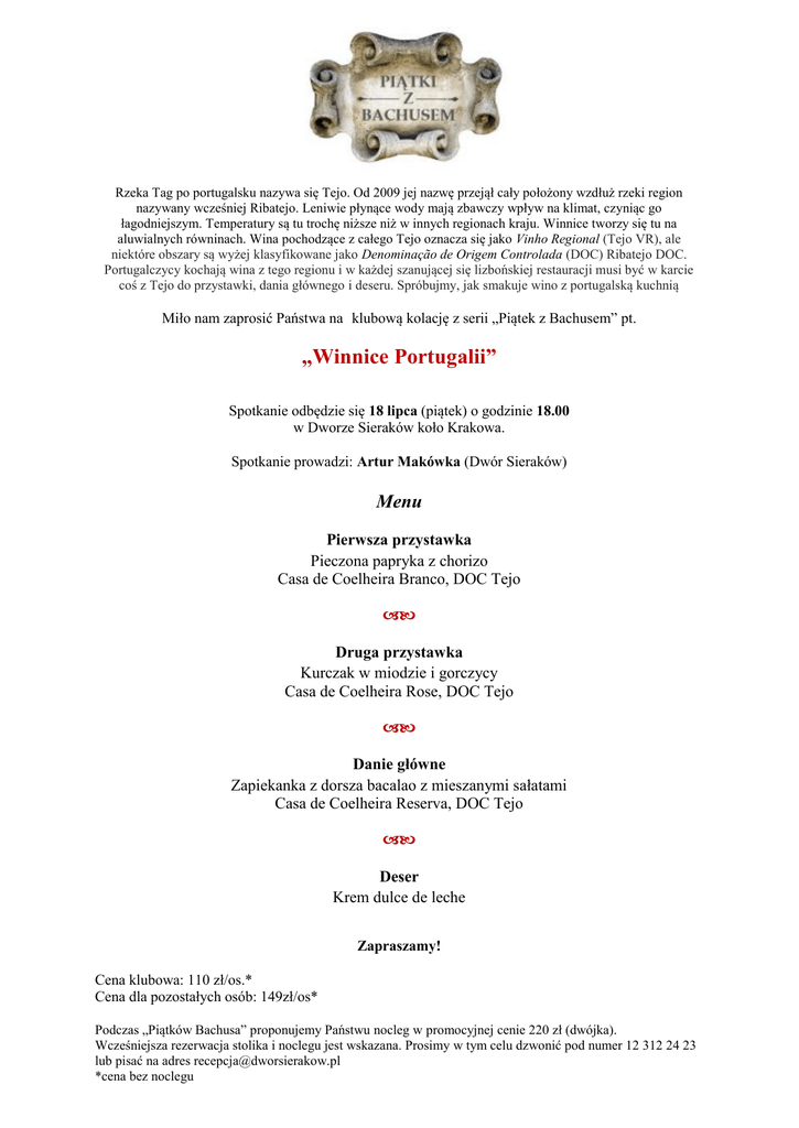 Rzeka Tag po portugalsku nazywa się Tejo. Od 2009 jej nazwę przejął cały położony wzdłuż rzeki region nazywany wcześniej Ribatejo. Leniwie płynące wody mają zbawczy wpływ na klimat, czyniąc go łagodniejszym. Temperatury są tu trochę niższe niż w innych regionach kraju. Winnice tworzy się tu na aluwialnych równinach. Wina pochodzące z całego Tejo oznacza się jako Vinho Regional (Tejo VR), ale niektóre obszary są wyżej klasyfikowane jako Denominação de Origem Controlada (DOC) Ribatejo DOC. Portugalczycy kochają wina z tego regionu i w każdej szanującej się lizbońskiej restauracji musi być w karcie coś z Tejo do przystawki, dania głównego i deseru. Spróbujmy, jak smakuje wino z portugalską kuchnią Miło nam zaprosić Państwa na klubową kolację z serii „Piątek z Bachusem” pt. „Winnice Portugalii” Spotkanie odbędzie się 18 lipca (piątek) o godzinie 18.00 w Dworze Sieraków koło Krakowa. Spotkanie prowadzi: Artur Makówka (Dwór Sieraków) Menu Pierwsza przystawka Pieczona papryka z chorizo Casa de Coelheira Branco, DOC Tejo Druga przystawka Kurczak w miodzie i gorczycy Casa de Coelheira Rose, DOC Tejo Danie główne Zapiekanka z dorsza bacalao z mieszanymi sałatami Casa de Coelheira Reserva, DOC Tejo Deser Krem dulce de leche Zapraszamy! Cena klubowa: 110 zł/os.* Cena dla pozostałych osób: 149zł/os* Podczas „Piątków Bachusa” proponujemy Państwu nocleg w promocyjnej cenie 220 zł (dwójka). Wcześniejsza rezerwacja stolika i noclegu jest wskazana. Prosimy w tym celu dzwonić pod numer 12 312 24 23 lub pisać na adres [email protected] *cena bez noclegu