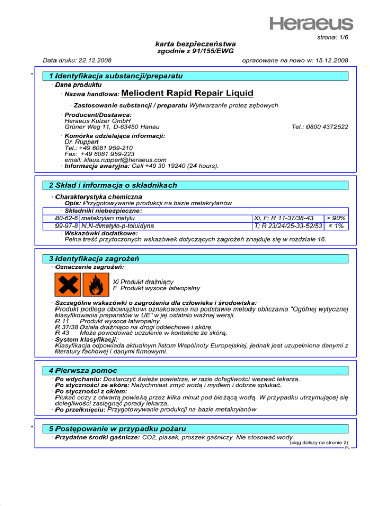 DR strona: 1/6 karta bezpieczeństwa zgodnie z 91/155/EWG Data druku: 22.12.2008 * opracowane na nowo w: 15.12.2008 1 Identyfikacja substancji/preparatu · Dane produktu · Nazwa handlowa: Meliodent Rapid Repair Liquid · Zastosowanie substancji / preparatu Wytwarzanie protez zębowych · Producent/Dostawca: Heraeus Kulzer GmbH Grüner Weg 11, D-63450 Hanau Tel.: 0800 4372522 · Komórka udzielająca informacji: Dr. Ruppert Tel.: +49 6081 959-210 Fax: +49 6081 959-223 email: [email protected] · Informacja awaryjna: Call +49 30 19240 (24 hours). 2 Skład i informacja o składnikach · Charakterystyka chemiczna · Opis: Przygotowywanie produkcji na bazie metakrylanów · Składniki niebezpieczne: 80-62-6 metakrylan metylu Xi, F; R 11-37/38-43 > 90% 99-97-8 N,N-dimetylo-p-toluidyna T; R 23/24/25-33-52/53 < 1% · Wskazówki dodatkowe: Pełna treść przytoczonych wskazówek dotyczących zagrożeń znajduje się w rozdziale 16. 3 Identyfikacja zagrożeń · Oznaczenie zagrożeń: Xi Produkt drażniący F Produkt wysoce łatwopalny · Szczególne wskazówki o zagrożeniu dla człowieka i środowiska: Produkt podlega obowiązkowi oznakowania na podstawie metody obliczania "Ogólnej wytycznej klasyfikowania preparatów w UE" w jej ostatnio ważnej wersji. R 11 Produkt wysoce łatwopalny. R 37/38 Działa drażniąco na drogi oddechowe i skórę. R 43 Może powodować uczulenie w kontakcie ze skórą. · System klasyfikacji: Klasyfikacja odpowiada aktualnym listom Wspólnoty Europejskiej, jednak jest uzupełniona danymi z literatury fachowej i danymi firmowymi. 4 Pierwsza pomoc · Po wdychaniu: Dostarczyć świeże powietrze, w razie dolegliwości wezwać lekarza. · Po styczności ze skórą: Natychmiast zmyć wodą i mydłem i dobrze spłukać. · Po styczności z okiem: Płukać oczy z otwartą powieką przez kilka minut pod bieżącą wodą. W przypadku utrzymującej się dolegliwości zasięgnąć porady lekarza. · Po przełknięciu: Przygotowywanie produkcji na bazie metakrylanów * 5 Postępowanie w przypadku pożaru · Przydatne środki gaśnicze: CO2, piasek, proszek gaśniczy. Nie stosować wody. (ciąg dalszy na stronie 2) PL DR strona: 2/6 karta bezpieczeństwa zgodnie z 91/155/EWG Data druku: 22.12.2008 Nazwa handlowa: Meliodent opracowane na nowo w: 15.12.2008 Rapid Repair Liquid (ciąg dalszy od strony 1) · Środki gaśnicze nieprzydatne ze względów bezpieczeństwa: Woda Woda pełnym strumieniem · Szczególne zagrożenie ze strony materiału, produktów jego spalania lub powstających gazów: Może tworzyć eksplozywne mieszaniny gaz-powietrze. Przy ogrzewaniu lub w wypadku pożaru możliwe jest tworzenie się trujących gazów. · Specjalne wyposażenie ochronne: Środki specjalne nie są konieczne. · Inne dane - 6 Postępowanie w przypadku niezamierzonego uwolnienia do środowiska · Środki ostrożności dostosowane do danej osoby: Nosić ubranie ochronne. Osoby żagrozone przenieść w bezpieczne miejsce. · Środki ochrony środowiska: Zapobiec przeniknięciu do kanalizacji, rowów i piwnic. · Metoda oczyszczania/ wchłaniania: Wchłaniać przy pomocy materiałów wiążących ciecze (ziemia okrzemkowa, trociny, przy małych ilościach użyć ligniny) Nie zmywać wodą ani wodnymi środkami myjącymi. · Wskazówki dodatkowe: Nie powstają żadne materiały niebezpieczne. 7 Postępowanie z substancją / preparatem* i jej / jego* magazynowanie · Sposób obchodzenia się: · Wskazówki dla bezpiecznego użytkowania: Zbiorniki zamknąć szczelnie. · Wskazówki dla ochrony przeciwpożarowej i przeciwwybuchowej: Źródła zapłonu trzymać z daleka - nie palić tytoniu. Przedsięwziąć środki przeciwko naładowaniom elektrostatycznym. · Składowanie: · Wymagania w stosunku do pomieszczeń składowych i zbiorników: Przechowywać w chłodnym miejscu. · Wskazówki odnośnie wspólnego składowania: Nie konieczne. · Dalsze wskazówki odnośnie warunków składowania: Przechowywać w chłodnym miejscu (poniżej temperatury pokojowej) Składować w dobrze zamkniętych beczkach w chłodnym i suchym miejscu. * 8 Kontrola narażenia i środki ochrony indywidualnej · Dodatkowe wskazówki dla wykonania urządzeń technicznych: Brak dalszych danych, patrz punkt 7. · Składniki wraz z kontrolowanymi wartościami granicznymi zależnymi od miejsca pracy: 80-62-6 metakrylan metylu MAC (PL) NDSCh: 400 mg/m3 NDS: 50 mg/m3 MAK (D) 210 mg/m3, 50 ppm Y; DFG · Wskazówki dodatkowe: Podstawą były aktualnie obowiązujące wykazy. · Osobiste wyposażenie ochronne: · Ogólne środki ochrony i higieny: Trzymać z dala od środków spożywczych napojów i pasz. Zabrudzoną, nasączoną odzież natychmiast zdjąć. Myć ręce przed przerwą i przed końcem pracy. Unikać styczności ze skórą. Unikać styczności z oczami i skórą. (ciąg dalszy na stronie 3) PL DR strona: 3/6 karta bezpieczeństwa zgodnie z 91/155/EWG Data druku: 22.12.2008 Nazwa handlowa: Meliodent opracowane na nowo w: 15.12.2008 Rapid Repair Liquid (ciąg dalszy od strony 2) · Ochrona dróg oddechowych: Przy wystarczającej wentylacji pomieszczenia nie wymaga sie odsysania pyłów; w sytuacjach nieuniknionych używać sprzętu ochronnego dróg oddechowych (filtr A) · Ochrona rąk: Jeżeli kontakt ze skórą nie jest wykluczony, w celu uniknięcia uczuleń, używać rękawic ochronnych. Rękawice / odporne na rozpuszczalniki Materiał, z którego wykonane są rękawice musi być nieprzepuszczalny i odporny na działanie produktu / substancji / preparatu. Wybór materiału na rękawice ochronne przy uwzględnieniu czasów przebicia, szybkości przenikania i degradacji. · Materiał, z którego wykonane są rękawice Wybór odpowiednich rękawic nie zależy tylko od materiału, lecz także od innych cech jakościowych i zmienia się od producenta do producenta. Ponieważ produkt jest preparatem składającym się z kilku substancji, to odporności materiałów, z których wykonano rękawice nie można wcześniej wyl