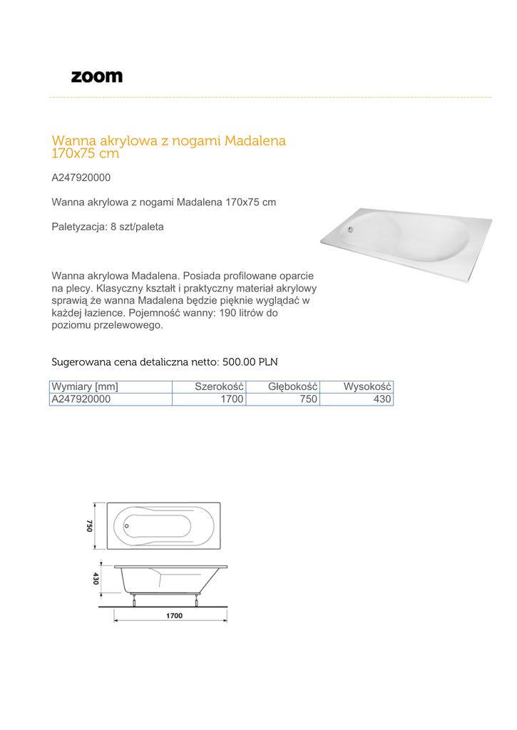 Wanna akrylowa z nogami Madalena 170x75 cm A247920000 Wanna akrylowa z nogami Madalena 170x75 cm Paletyzacja: 8 szt/paleta Wanna akrylowa Madalena. Posiada profilowane oparcie na plecy. Klasyczny kształt i praktyczny materiał akrylowy sprawią że wanna Madalena będzie pięknie wyglądać w każdej łazience. Pojemność wanny: 190 litrów do poziomu przelewowego. Sugerowana cena detaliczna netto: 500.00 PLN Wymiary [mm] A247920000 Szerokość 1700 Głębokość 750 Wysokość 430
