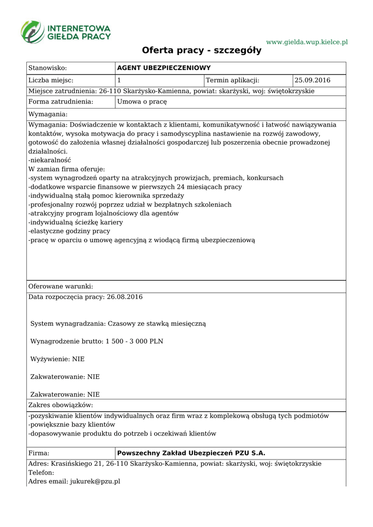 Oferta pracy - szczegóły Stanowisko: AGENT UBEZPIECZENIOWY Liczba miejsc: 1 Termin aplikacji: www.gielda.wup.kielce.pl 25.09.2016 Miejsce zatrudnienia: 26-110 Skarżysko-Kamienna, powiat: skarżyski, woj: świętokrzyskie Forma zatrudnienia: Umowa o pracę Wymagania: Wymagania: Doświadczenie w kontaktach z klientami, komunikatywność i łatwość nawiązywania kontaktów, wysoka motywacja do pracy i samodyscyplina nastawienie na rozwój zawodowy, gotowość do założenia własnej działalności gospodarczej lub poszerzenia obecnie prowadzonej działalności. -niekaralność W zamian firma oferuje: -system wynagrodzeń oparty na atrakcyjnych prowizjach, premiach, konkursach -dodatkowe wsparcie finansowe w pierwszych 24 miesiącach pracy -indywidualną stałą pomoc kierownika sprzedaży -profesjonalny rozwój poprzez udział w bezpłatnych szkoleniach -atrakcyjny program lojalnościowy dla agentów -indywidualną ścieżkę kariery -elastyczne godziny pracy -pracę w oparciu o umowę agencyjną z wiodącą firmą ubezpieczeniową Oferowane warunki: Data rozpoczęcia pracy: 26.08.2016 System wynagradzania: Czasowy ze stawką miesięczną Wynagrodzenie brutto: 1 500 - 3 000 PLN Wyżywienie: NIE Zakwaterowanie: NIE Zakwaterowanie: NIE Zakres obowiązków: -pozyskiwanie klientów indywidualnych oraz firm wraz z komplekową obsługą tych podmiotów -powiększnie bazy klientów -dopasowywanie produktu do potrzeb i oczekiwań klientów Firma: Powszechny Zakład Ubezpieczeń PZU S.A. Adres: Krasińskiego 21, 26-110 Skarżysko-Kamienna, powiat: skarżyski, woj: świętokrzyskie Telefon: Adres email: [email protected] Adres www: Adres www: Język aplikacji: polski Sposób aplikowania: bezpośrednio do pracodawcy Sposób przekazania dokumentów: Preferowane formy kontaktu: e-mail Wymagane dokumenty: CV należy przesłać na adres e-mail lub osobiście w oddziale PZU Uwagi: Identyfikator oferty: StPr/16/1896 Instytucja koordynująca ofertę: Powiatowy Urząd Pracy w Skarżysku-Kamiennej Urząd Pracy dokłada wszelkich starań, aby oferty pracy będące w zasobach urzędu, były rzetelne i wiarygodne. Ponieważ wszystkie oferty pracy pochodzą od osób trzecich Urząd Pracy zastrzega, że odpowiedzialność za ewentualne rozbieżności pomiędzy warunkami pracy zaprezentowanymi w niniejszej ofercie a warunkami zaproponowanymi przez potencjalnego pracodawcę ponosi pracodawca.